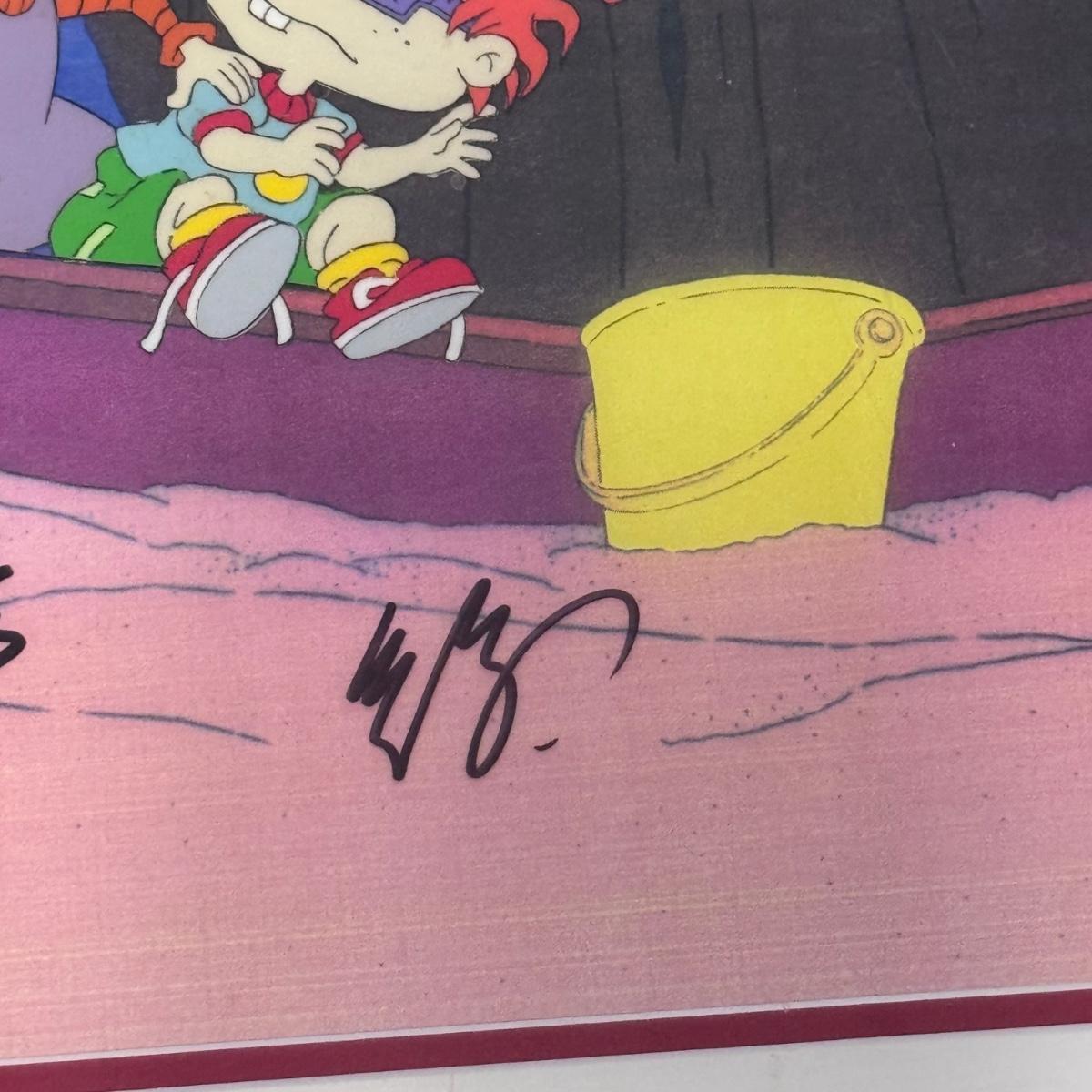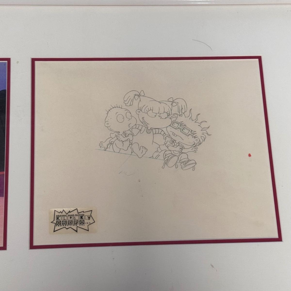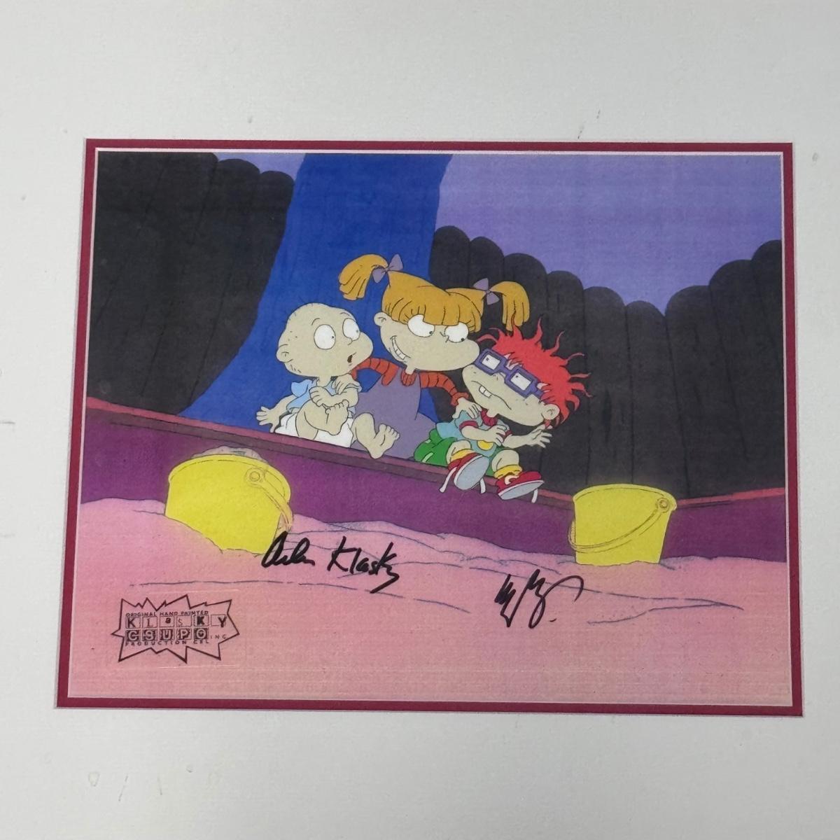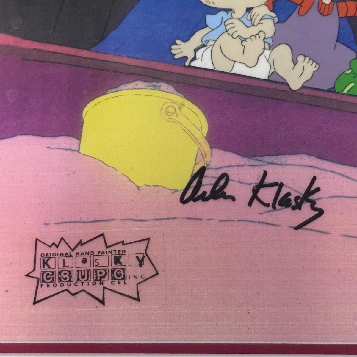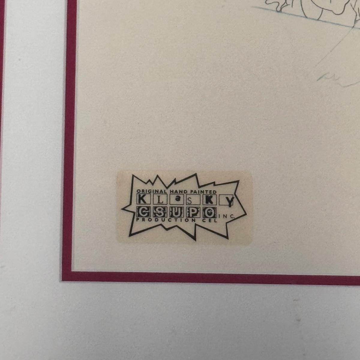 This lot includes one hand-painted cel titled “Tommie, Angelica, & Chuckie - RUGRATS” by Klasky/Csupo. The cel appears to be signed by Arlene Klasky and Gábor Csupó and stamped twice with their company’s stamp. The art is protected with a plastic layer, double matting, and a wooden frame that has a white glossy plastic layer protecting it. The frame measures 33” x 18”H. The original invoice and certificate of authenticity are included - see last two pictures.