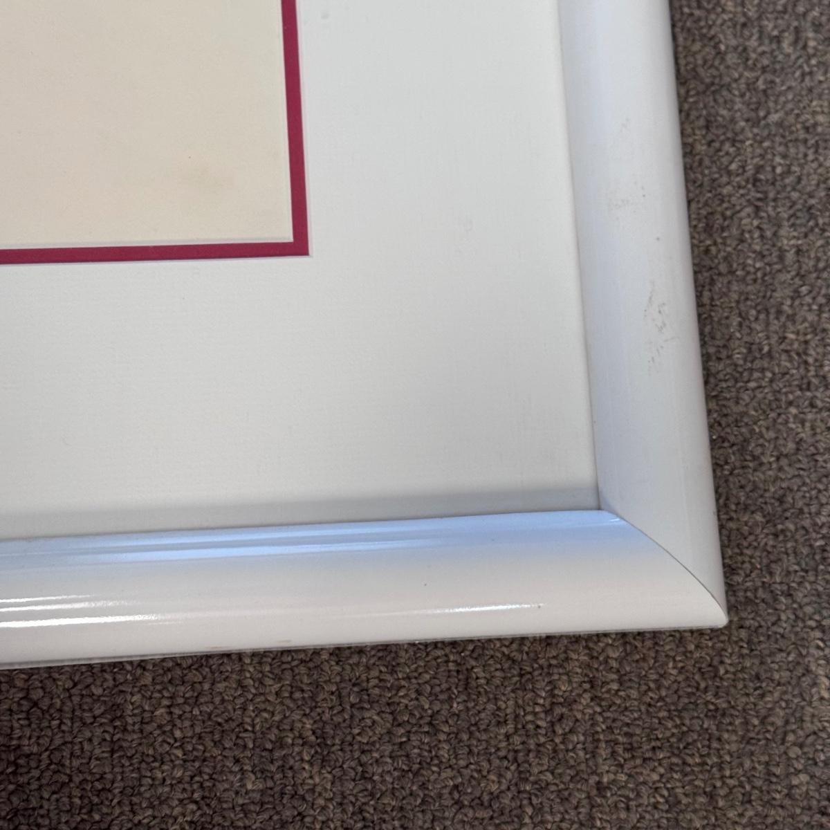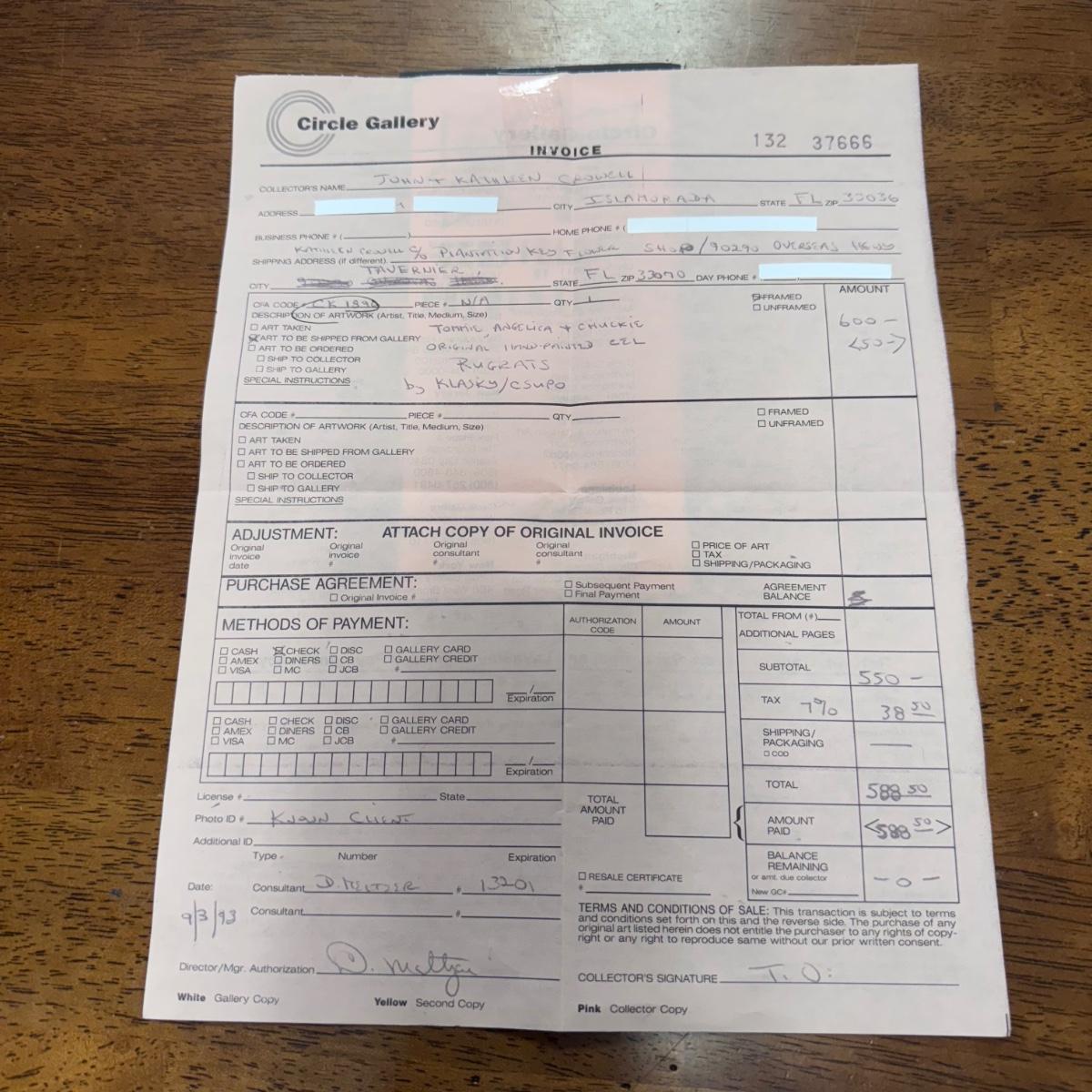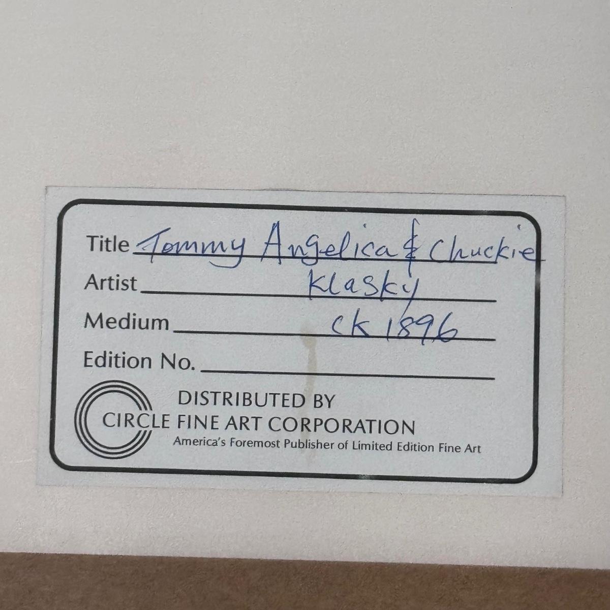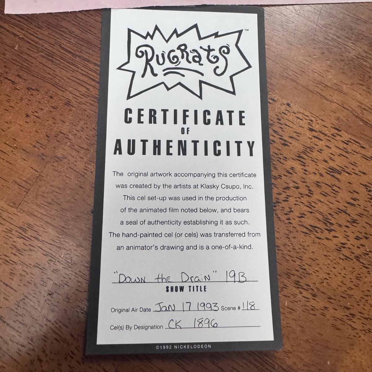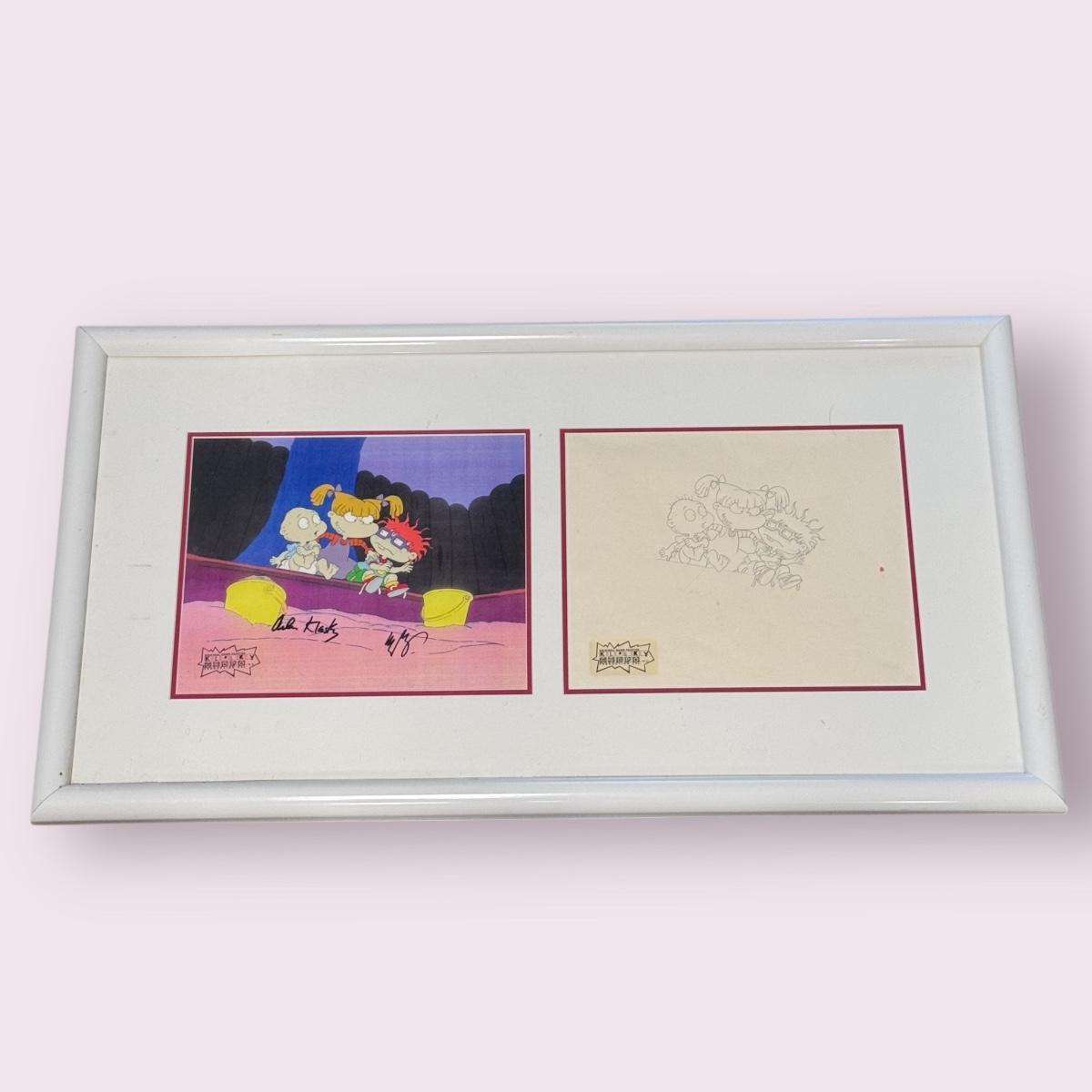 This lot includes one hand-painted cel titled “Tommie, Angelica, & Chuckie - RUGRATS” by Klasky/Csupo. The cel appears to be signed by Arlene Klasky and Gábor Csupó and stamped twice with their company’s stamp. The art is protected with a plastic layer, double matting, and a wooden frame that has a white glossy plastic layer protecting it. The frame measures 33” x 18”H. The original invoice and certificate of authenticity are included - see last two pictures.
