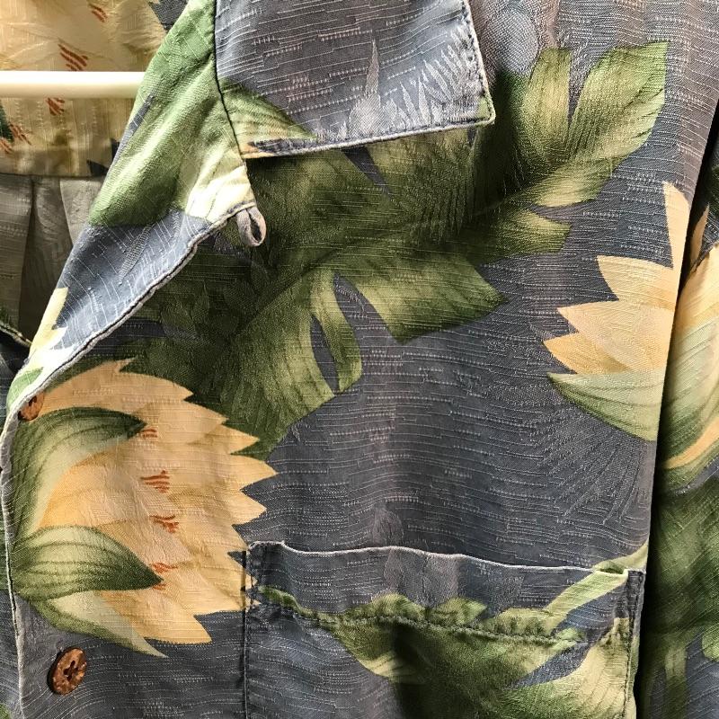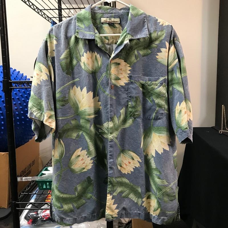 Auction is for one used Tommy Bahama, short sleeve, camp-collar Hawaiian shirt. The fabric make up is 100% silk. The shirt is in excellent used condition with no stains“” sweat or otherwise“”or rips.
