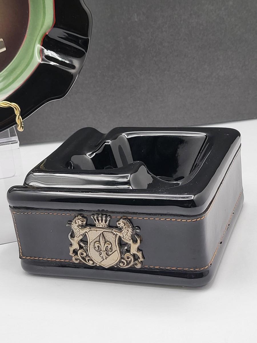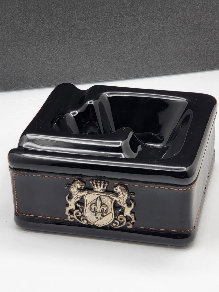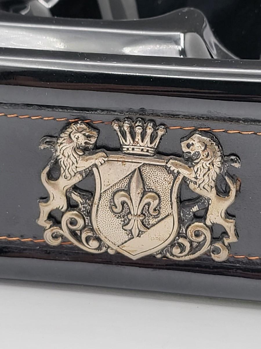5" x 2.5" lesther trim, vintage lion family crest/shield motif pipe stand/cigar/ashtray.