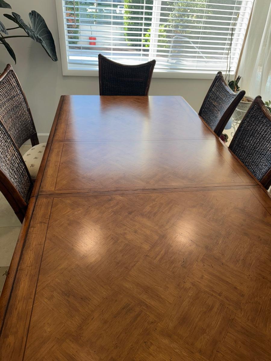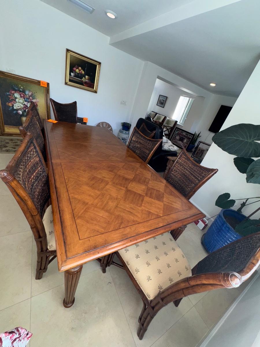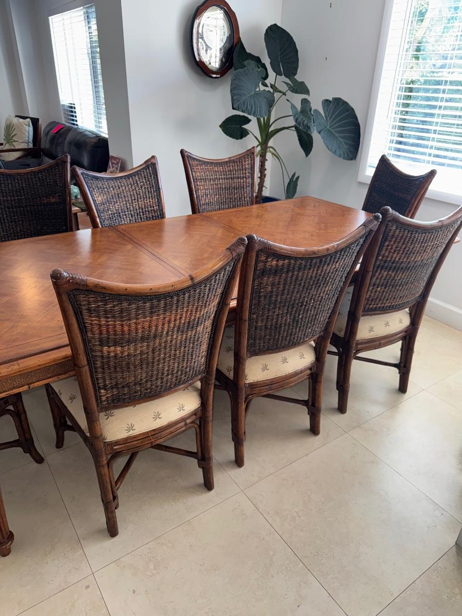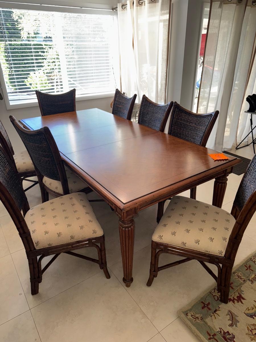 Tommy bahama dinning room table in EXCELLENT condition, always had a cloth on it and seat covers. Comes with seat covers as well to protect the them. No scratches. Has a leaf in it so it can get smaller. 44 inches wide x 92inches long WITH leaf 62 inches long WITHOUT leaf. Comes with 8 chairs.