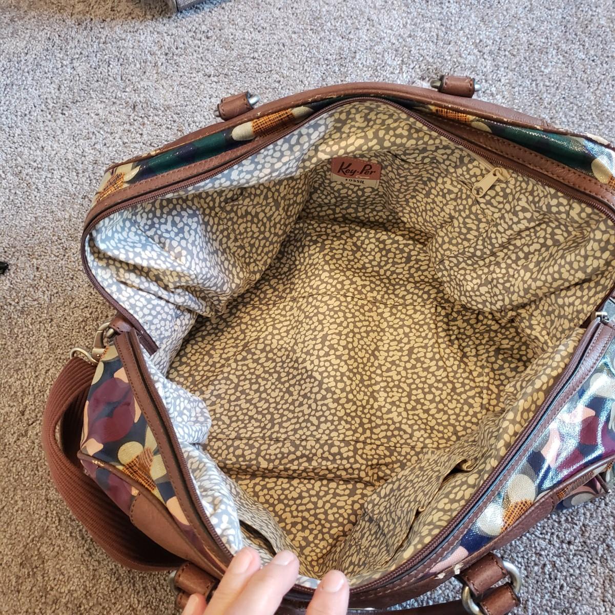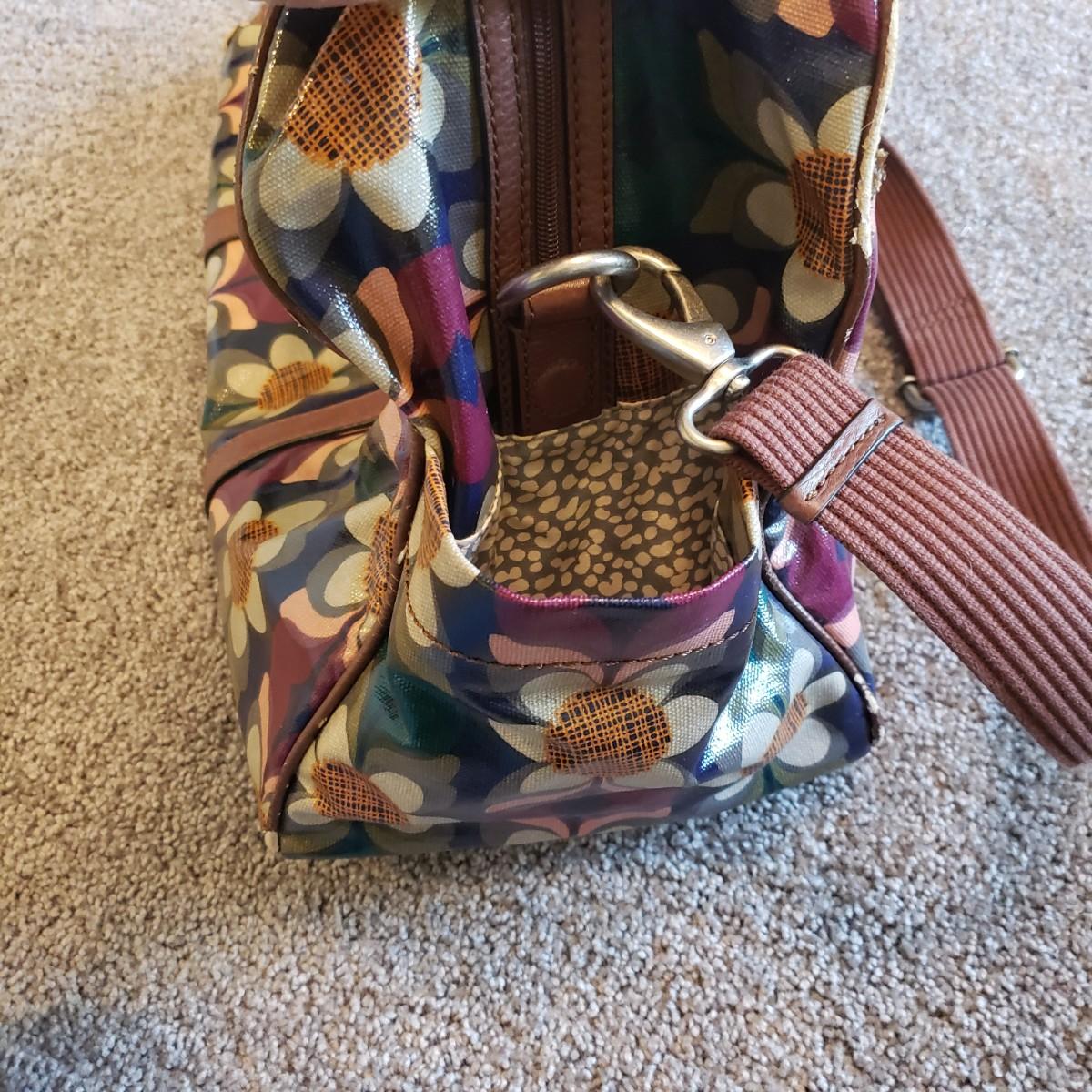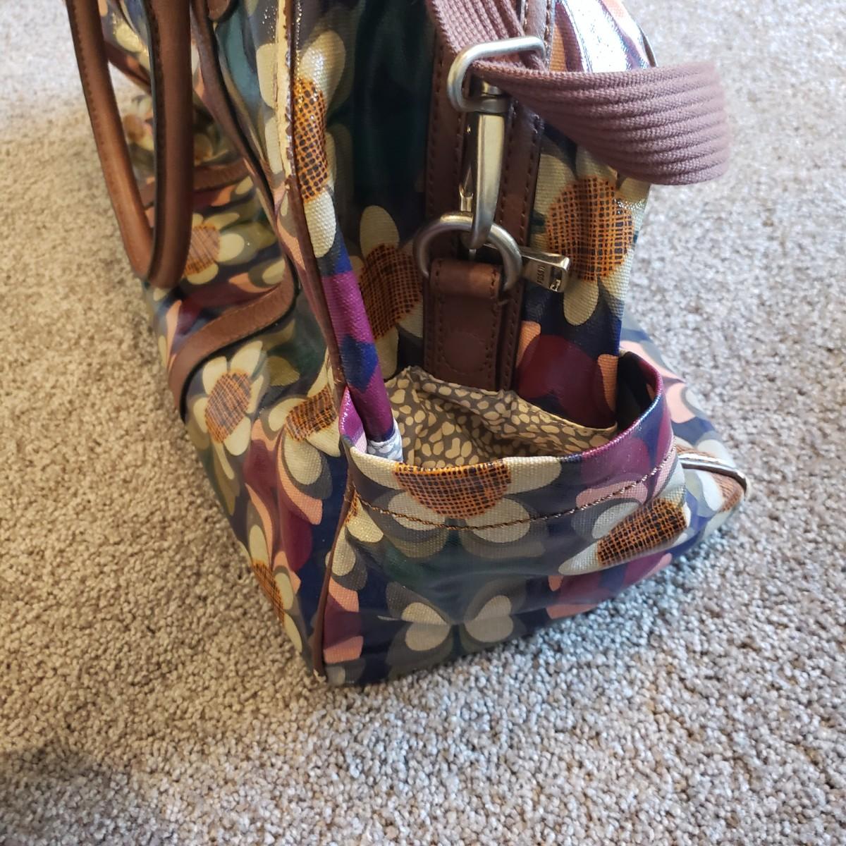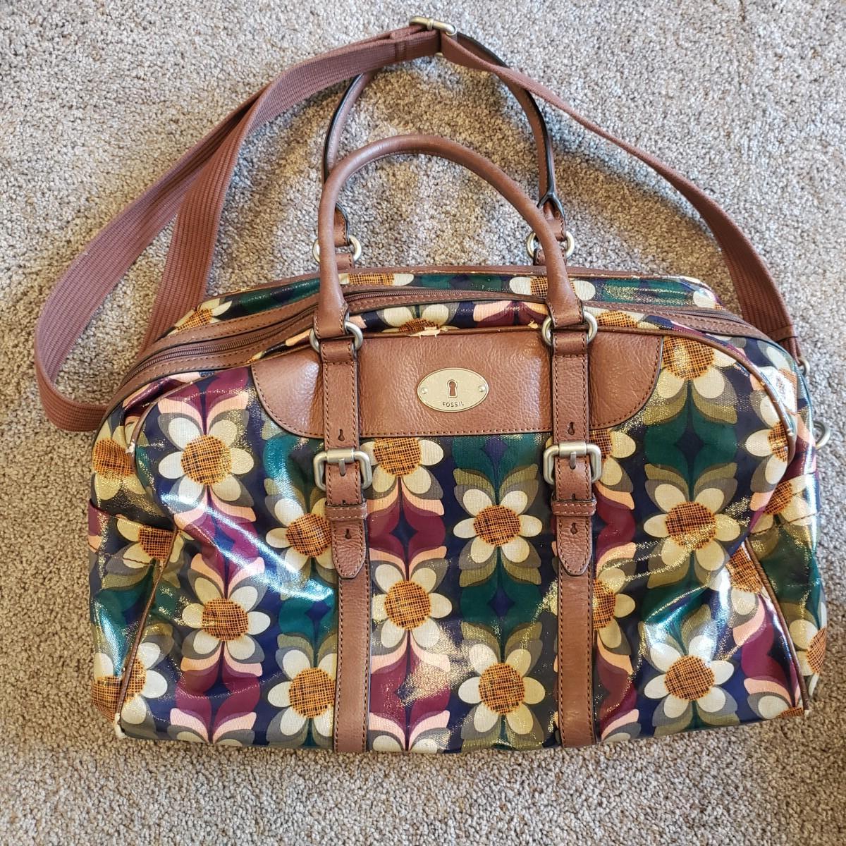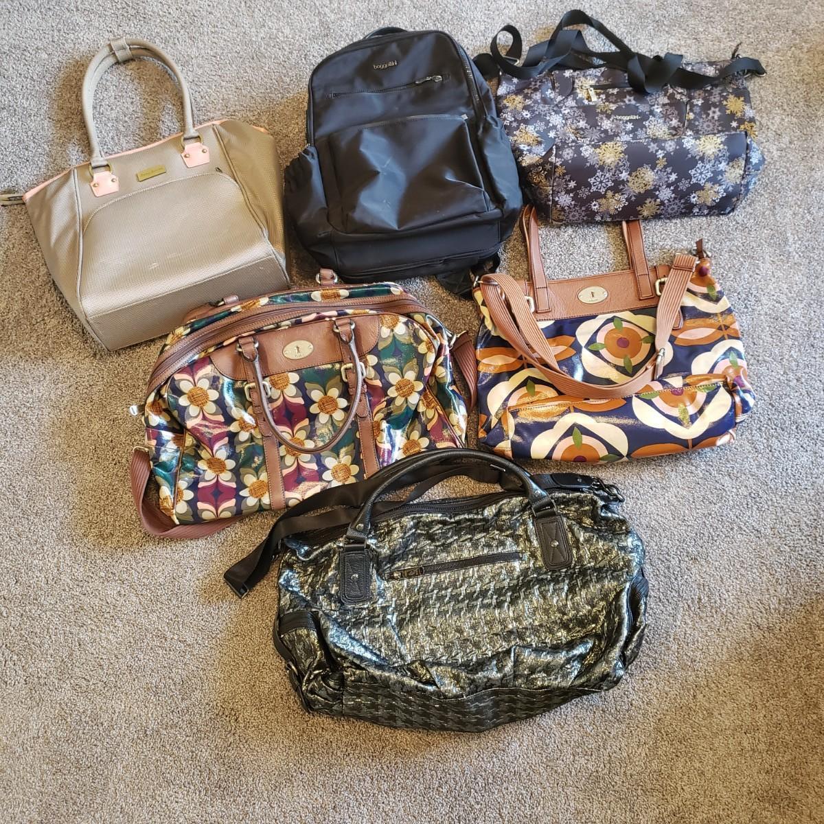 This six piece travel bag lot features name brands and appears to be barely use. The Fossil plastic/canvas travel bag with a daisy pattern measures 19" x 9" x 20" H, including the strap, as pictured. There is some wear on the piping, see pictures. Some bags have a laptop pocket, many pockets and adjustable straps. See pictures for details.