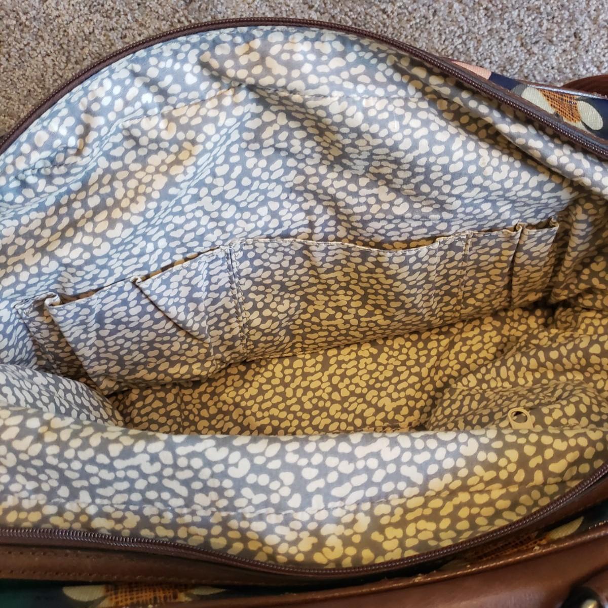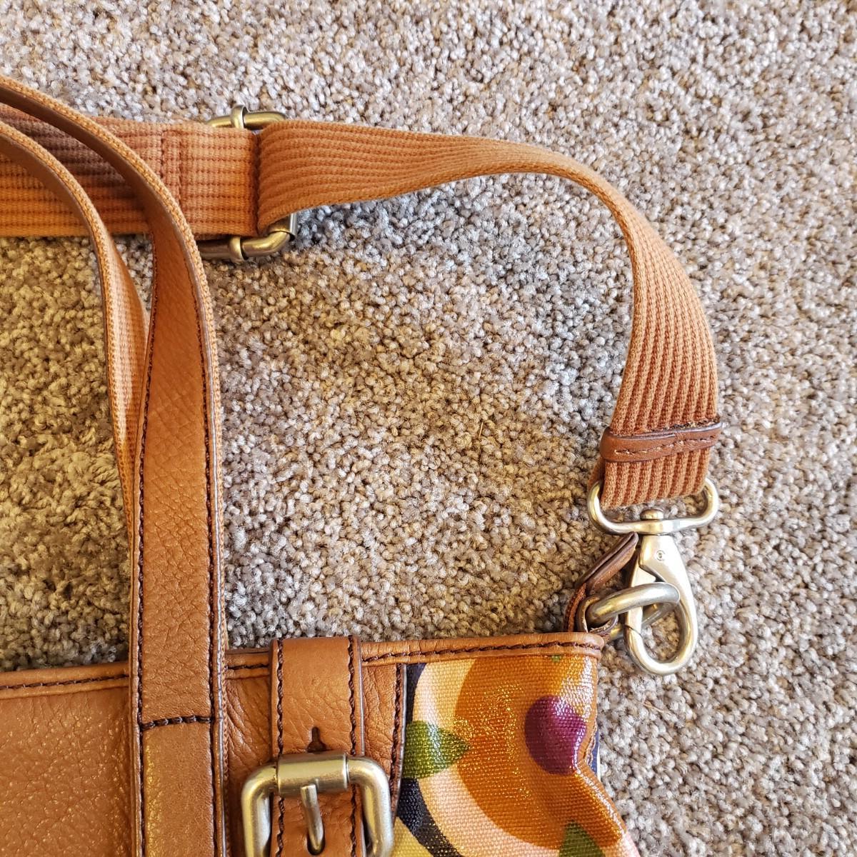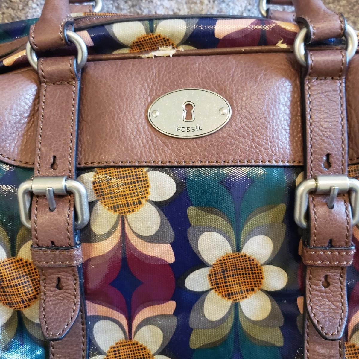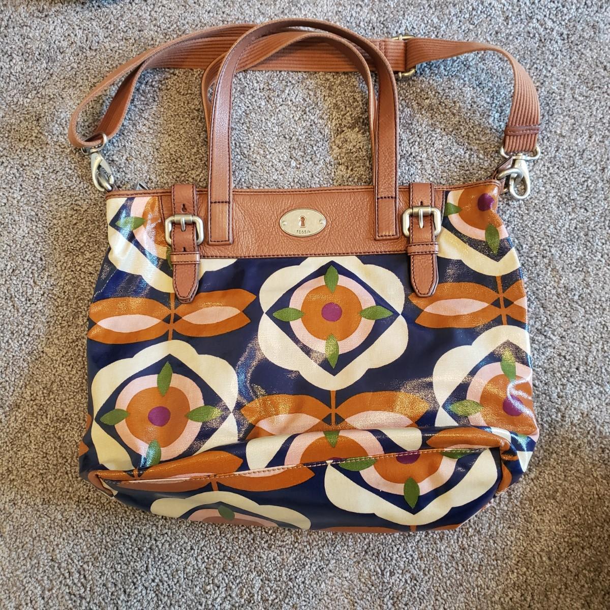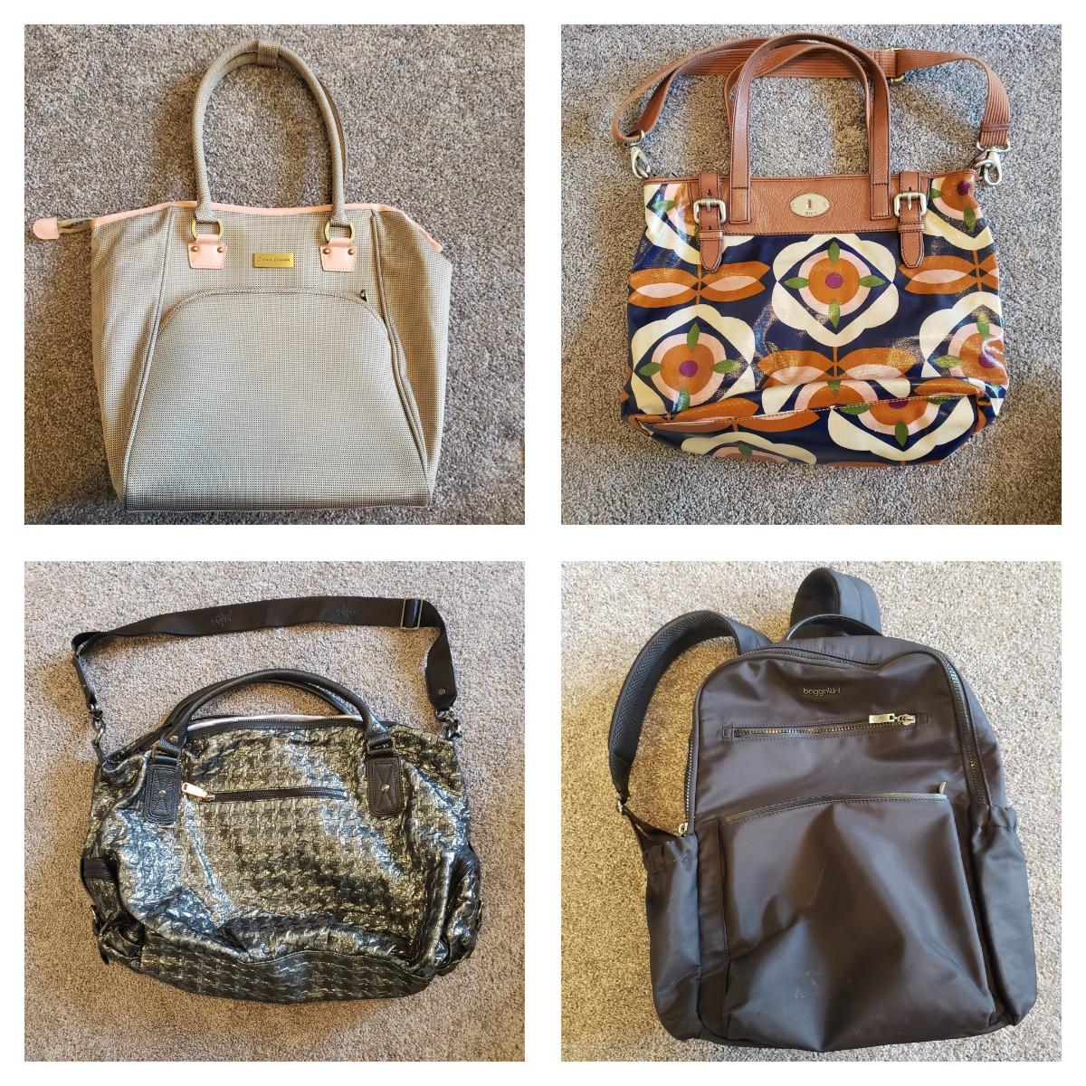 This six piece travel bag lot features name brands and appears to be barely use. The Fossil plastic/canvas travel bag with a daisy pattern measures 19" x 9" x 20" H, including the strap, as pictured. There is some wear on the piping, see pictures. Some bags have a laptop pocket, many pockets and adjustable straps. See pictures for details.