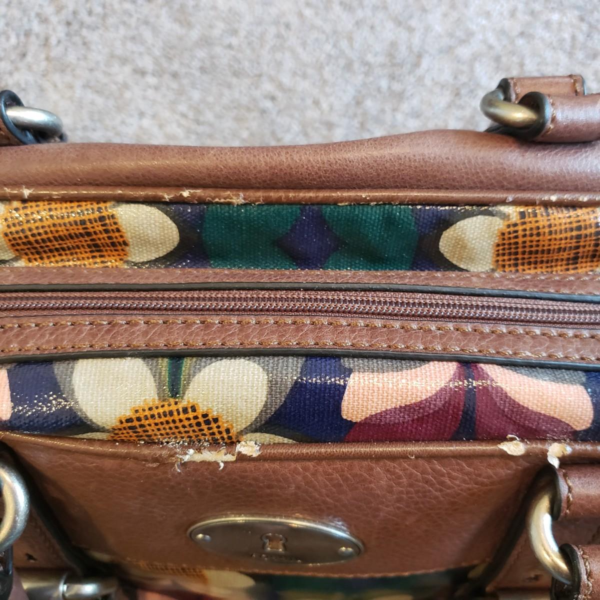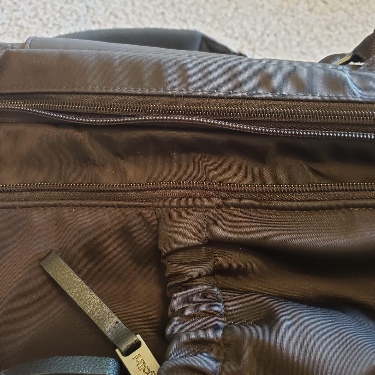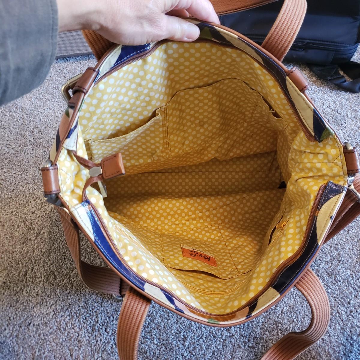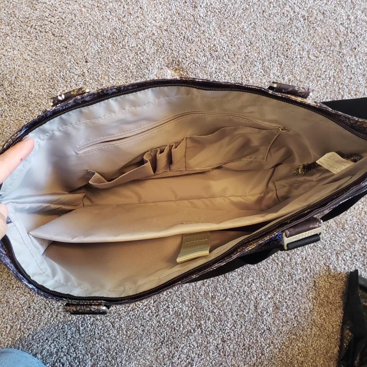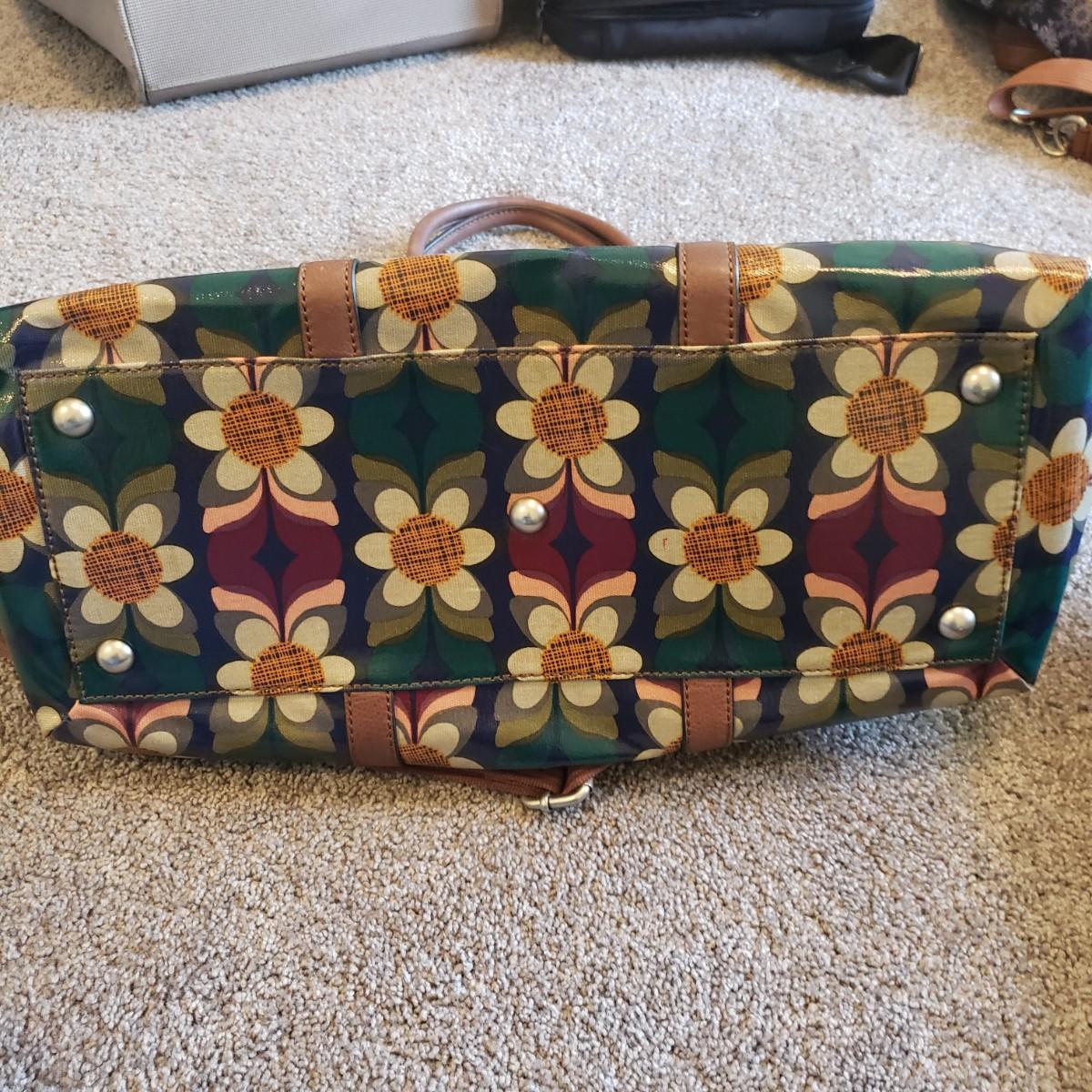 This six piece travel bag lot features name brands and appears to be barely use. The Fossil plastic/canvas travel bag with a daisy pattern measures 19" x 9" x 20" H, including the strap, as pictured. There is some wear on the piping, see pictures. Some bags have a laptop pocket, many pockets and adjustable straps. See pictures for details.