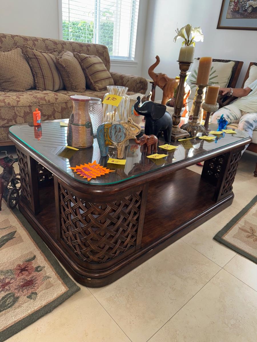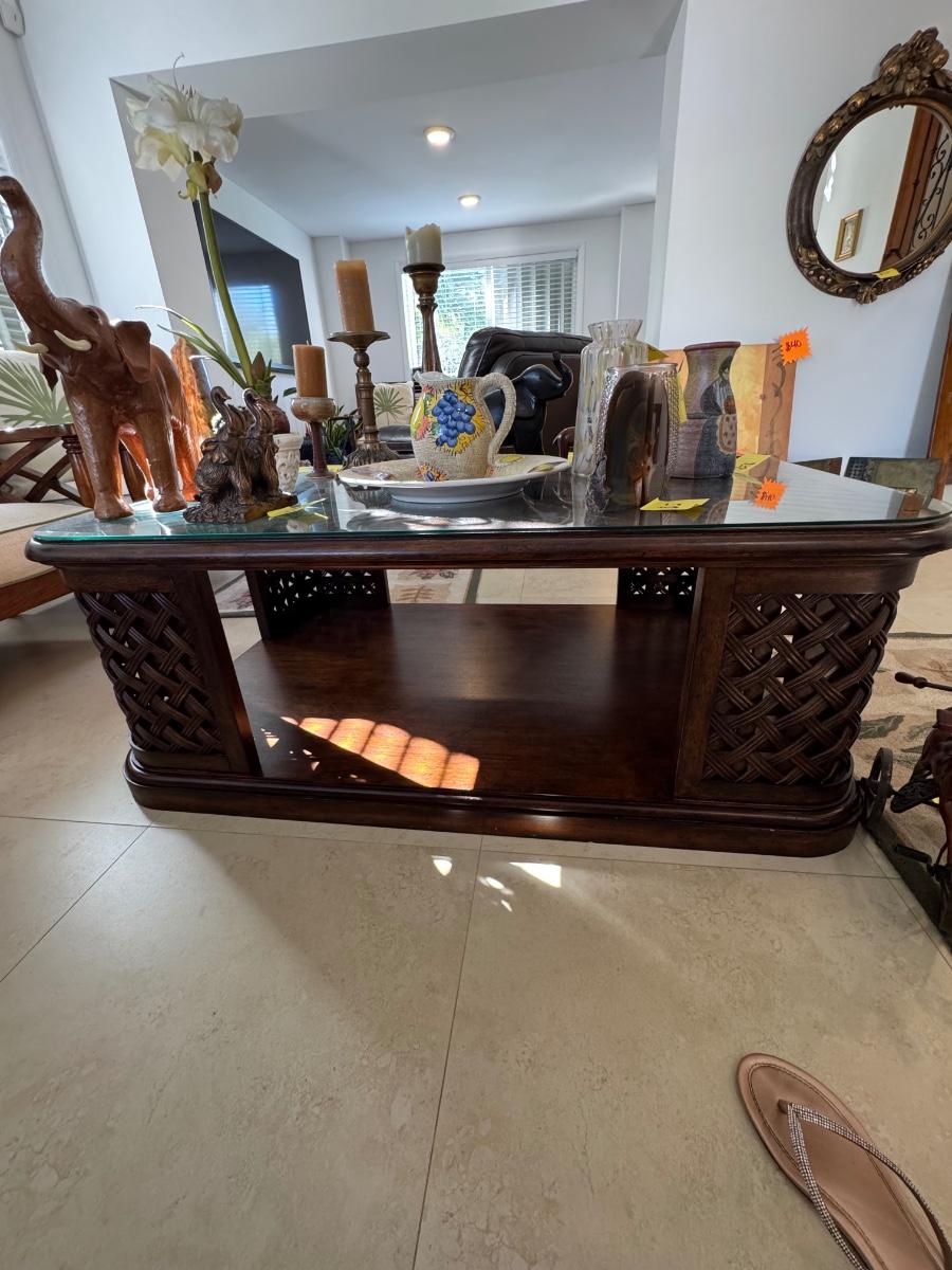 Tommy bahama table for living room. In EXCELLENT condition with glass top that can be removed but it’s supposed to be on there. 3feet wide x 20 1/2 inches tall x 53 inches long