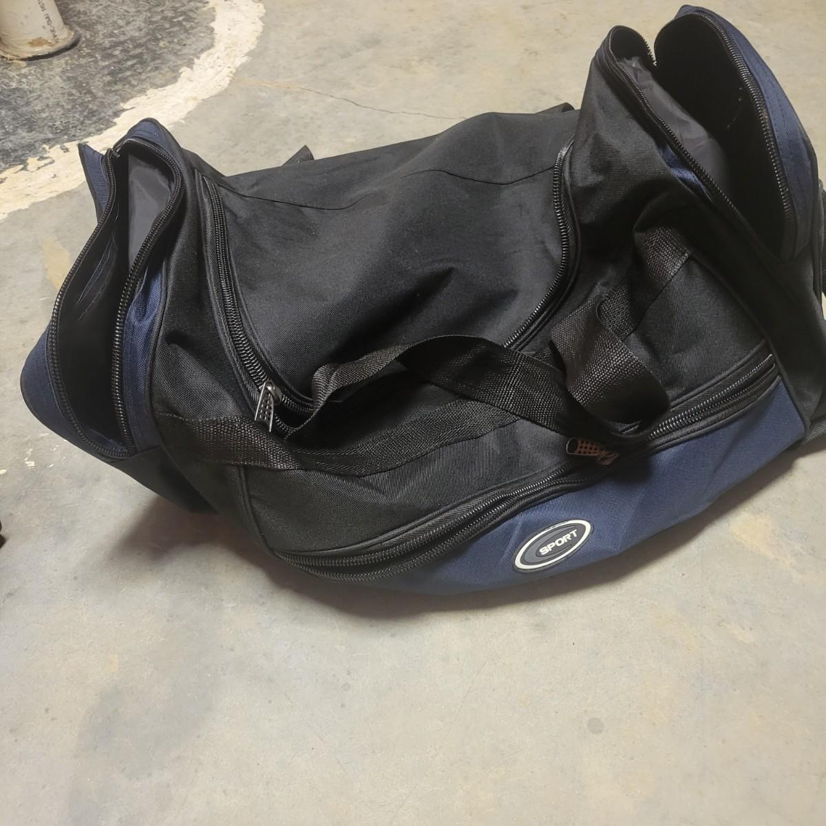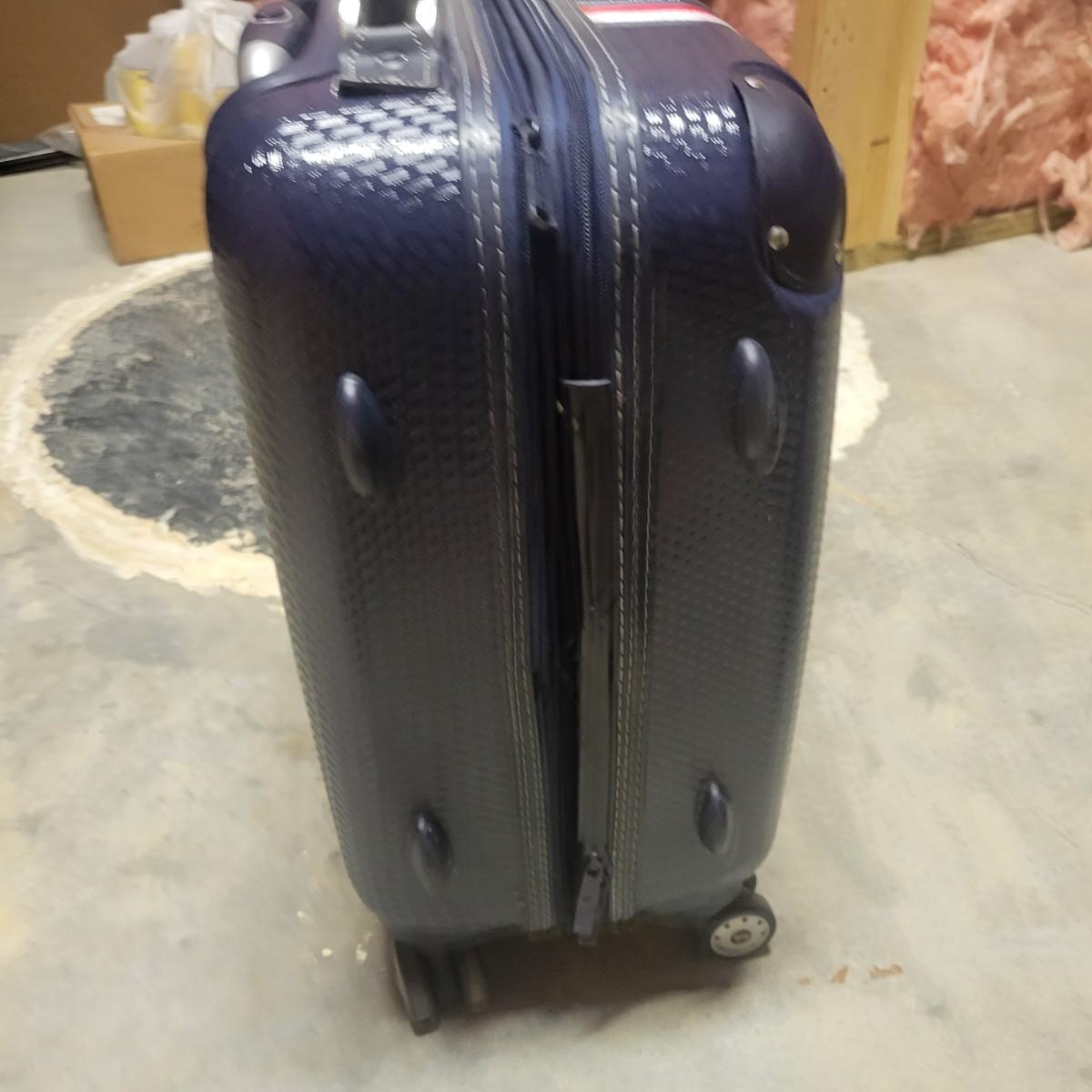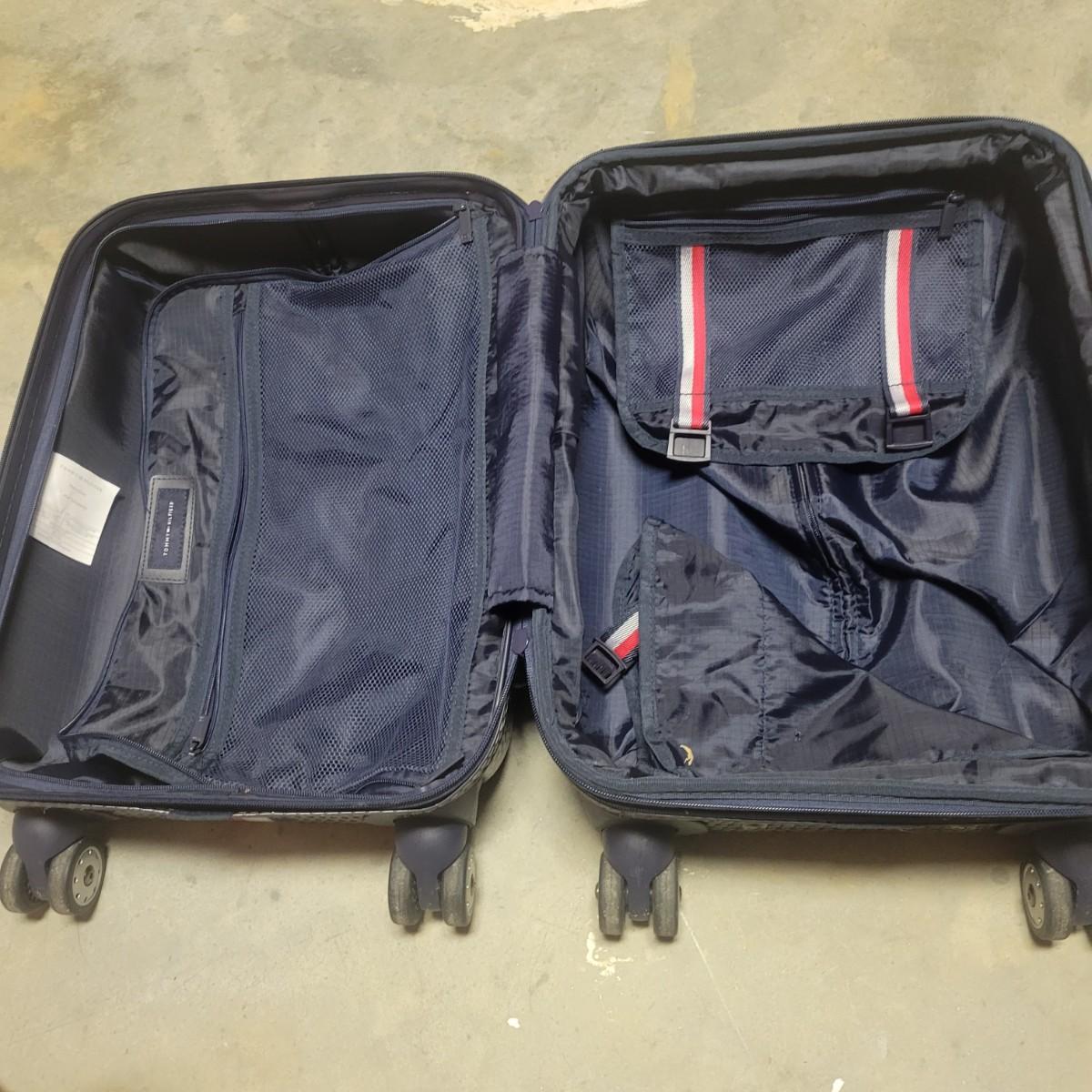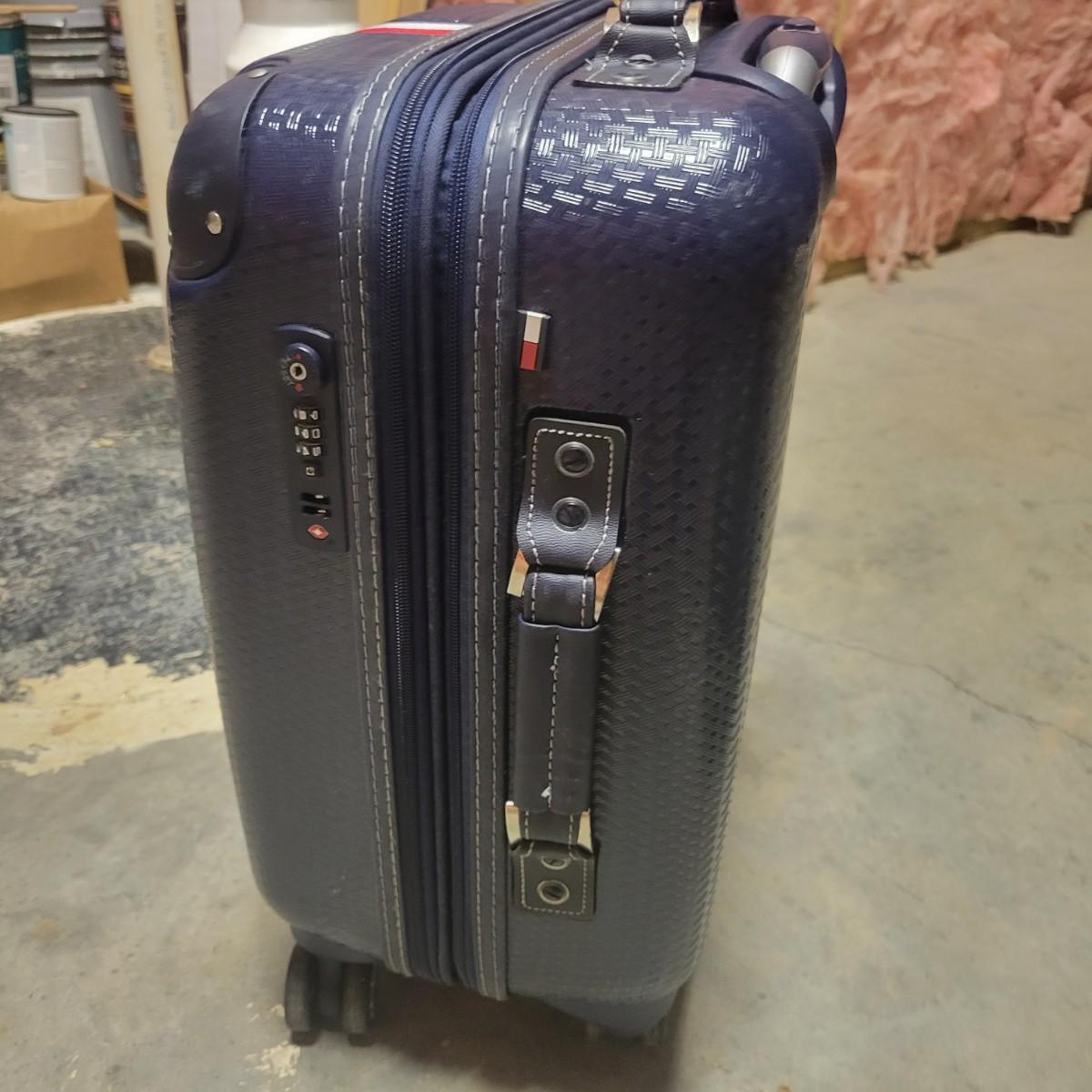 A Tommy Hilfiger hard sided suitcase that measures approximately 14" x 9.5" x 21.5"H. This lot also includes two gym bags, and a backpack. Also includes a luggage scale that powered on and a Ridesafer travel vest for children. Shipping available