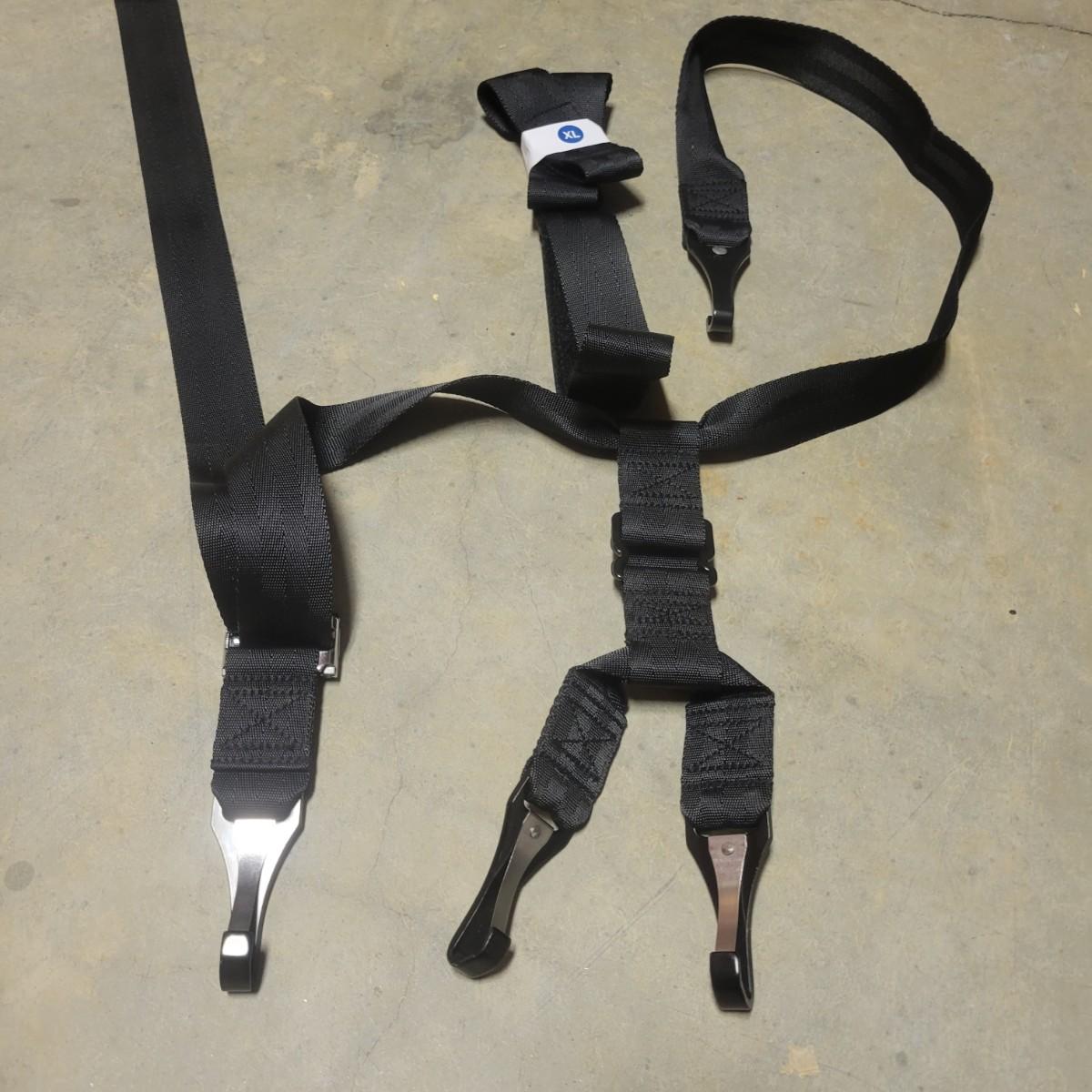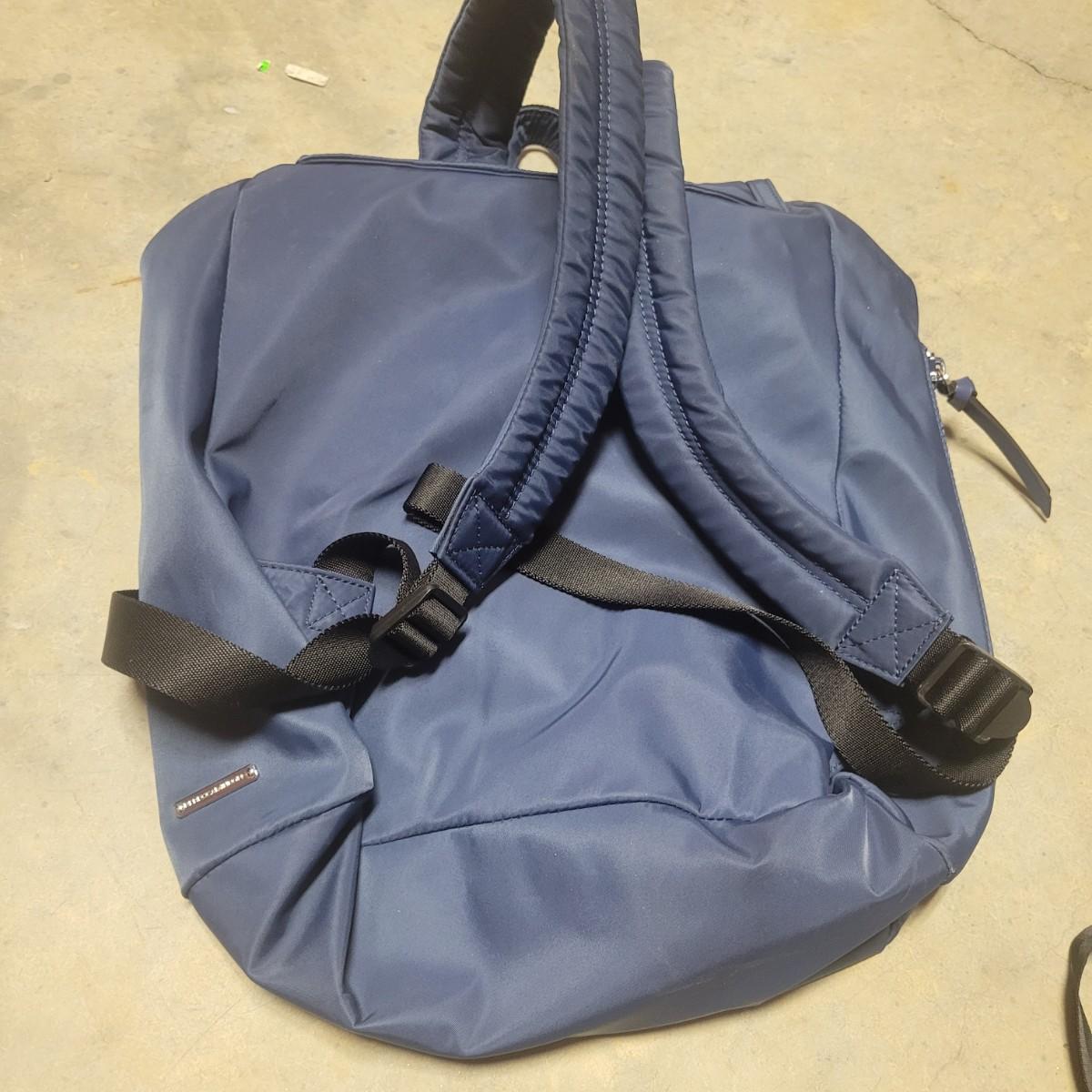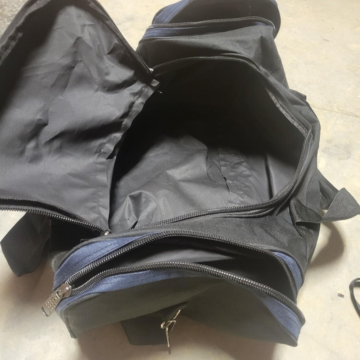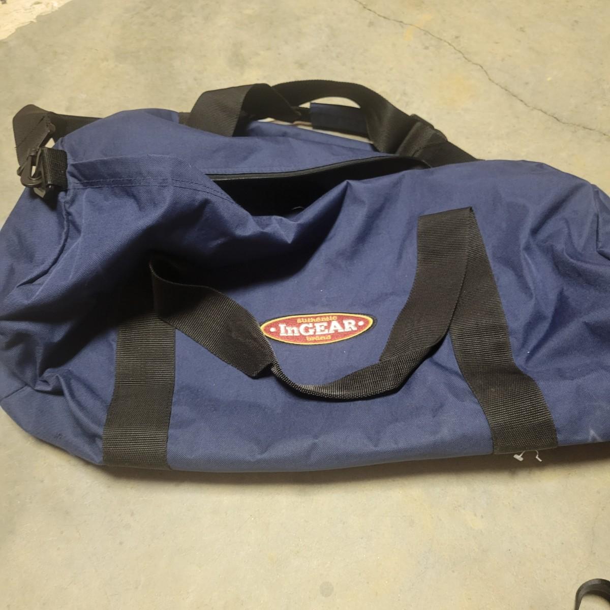 A Tommy Hilfiger hard sided suitcase that measures approximately 14" x 9.5" x 21.5"H. This lot also includes two gym bags, and a backpack. Also includes a luggage scale that powered on and a Ridesafer travel vest for children. Shipping available