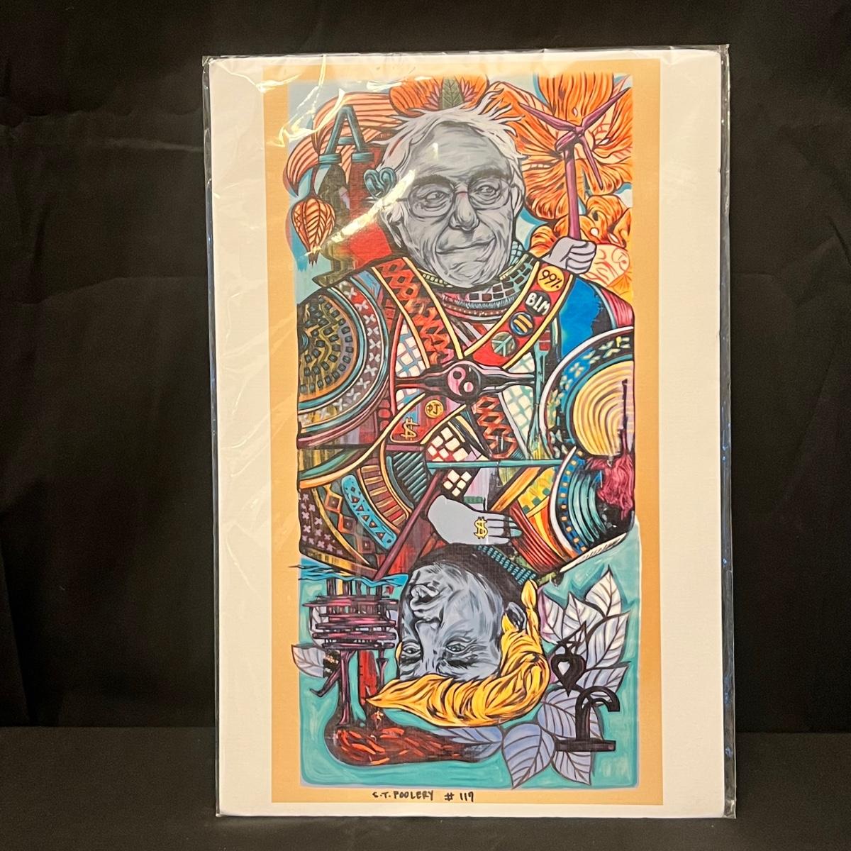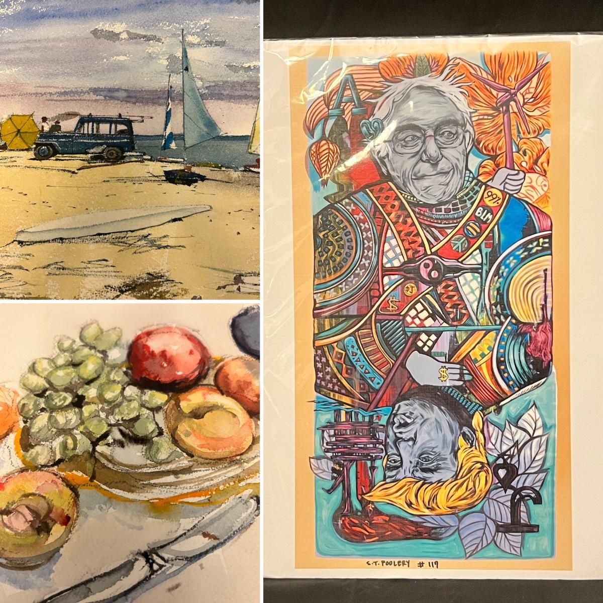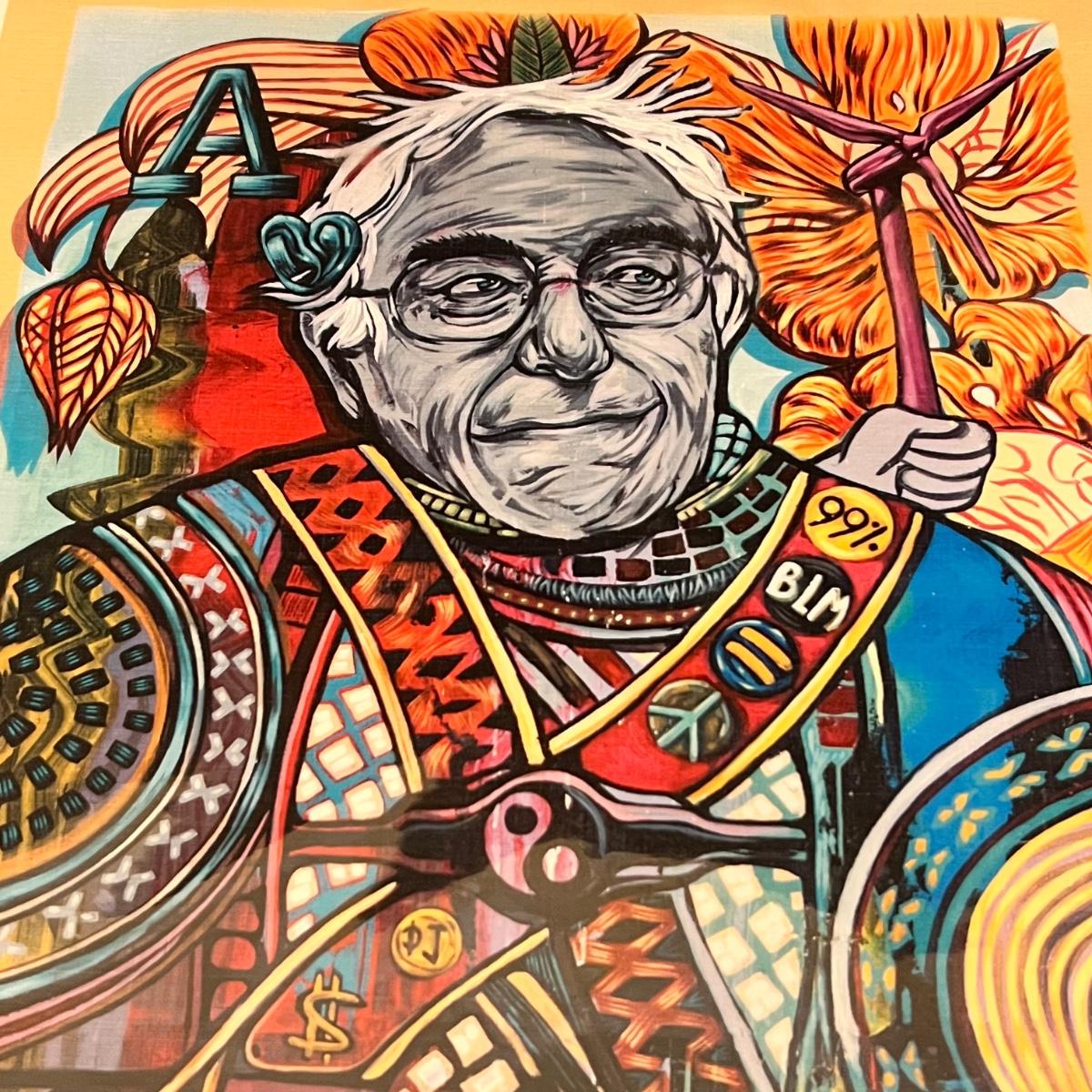 Largest piece is titled “Bernie Beats Trump” by Tommy Lee Mcgee Aka Sir Tom Foolery, measures 12” x 18”H.