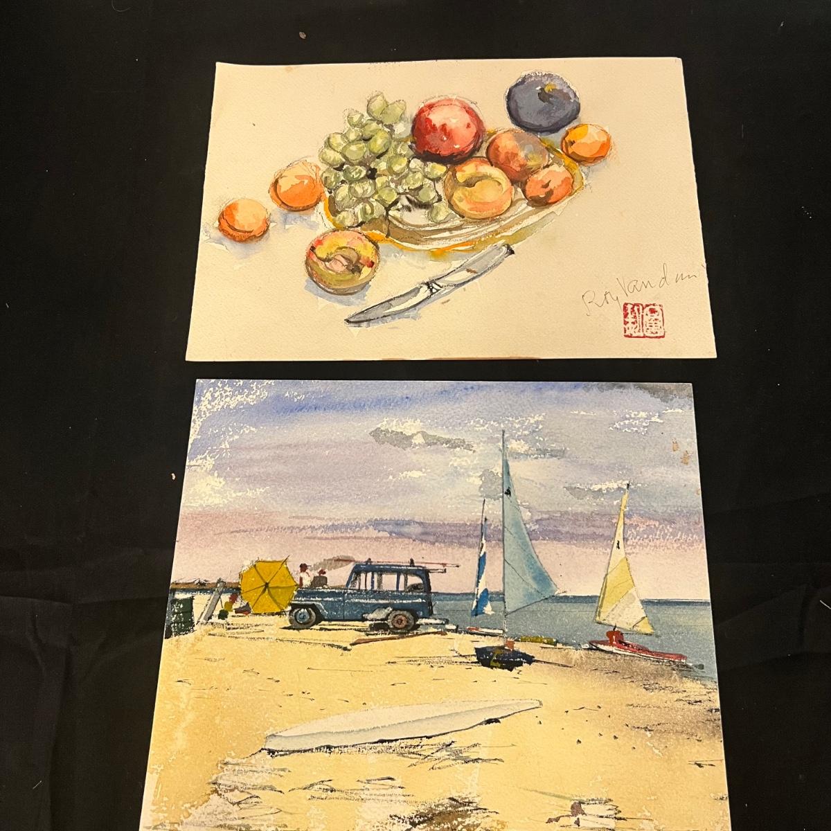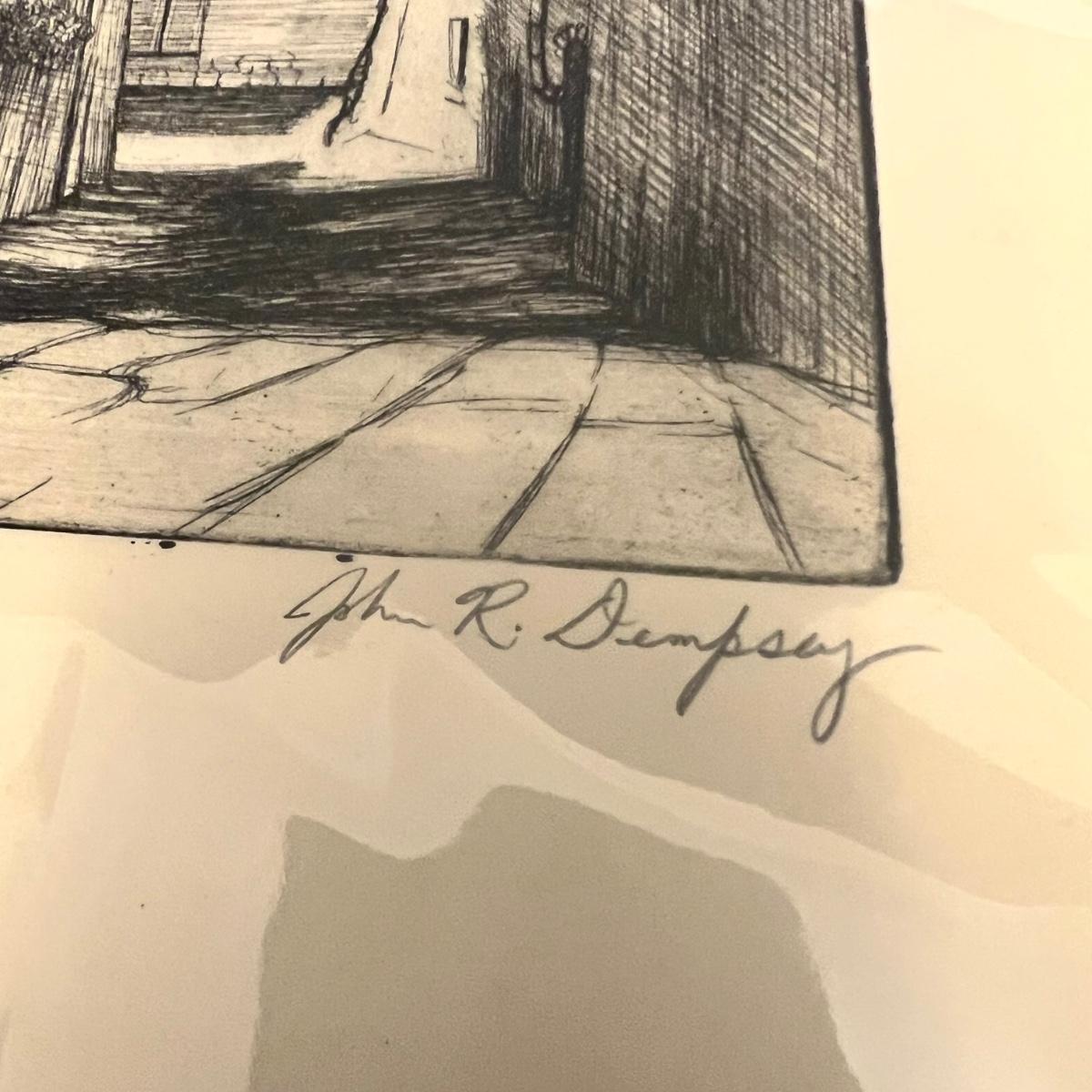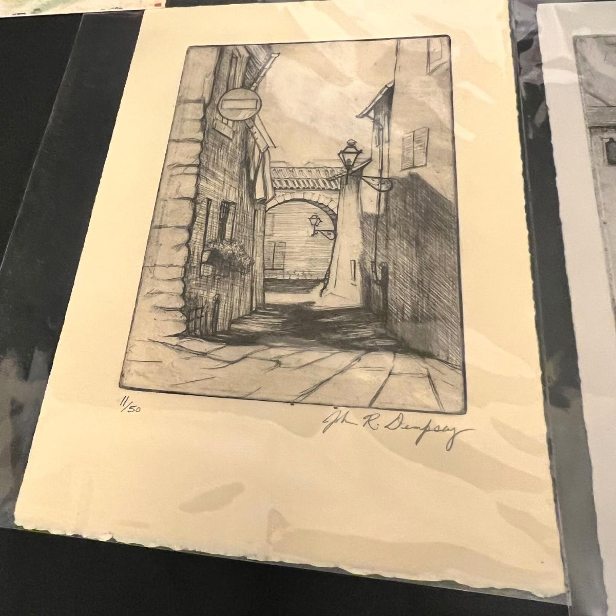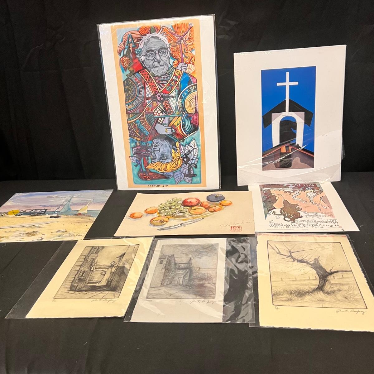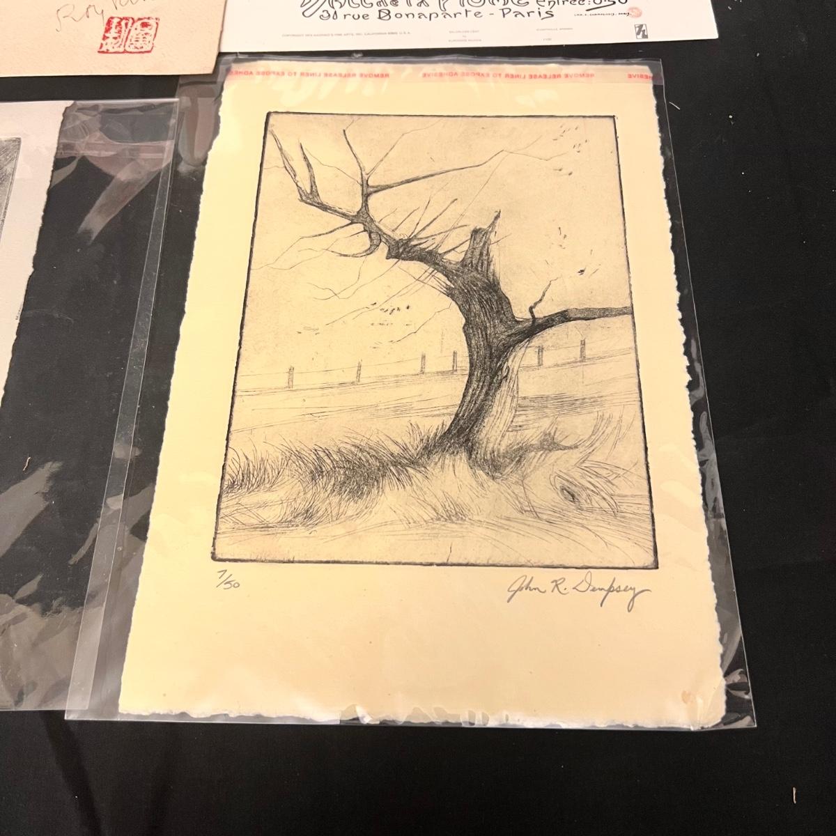 Wonderful assortment of unframed art. Most pieces are signed. Three etchings are pencil signed John E. Dempsey and numbered. Two paintings by Roy Vandam are signed also (note the Nantucket beach scene has a few stains). See photos for full inventory and signatures.