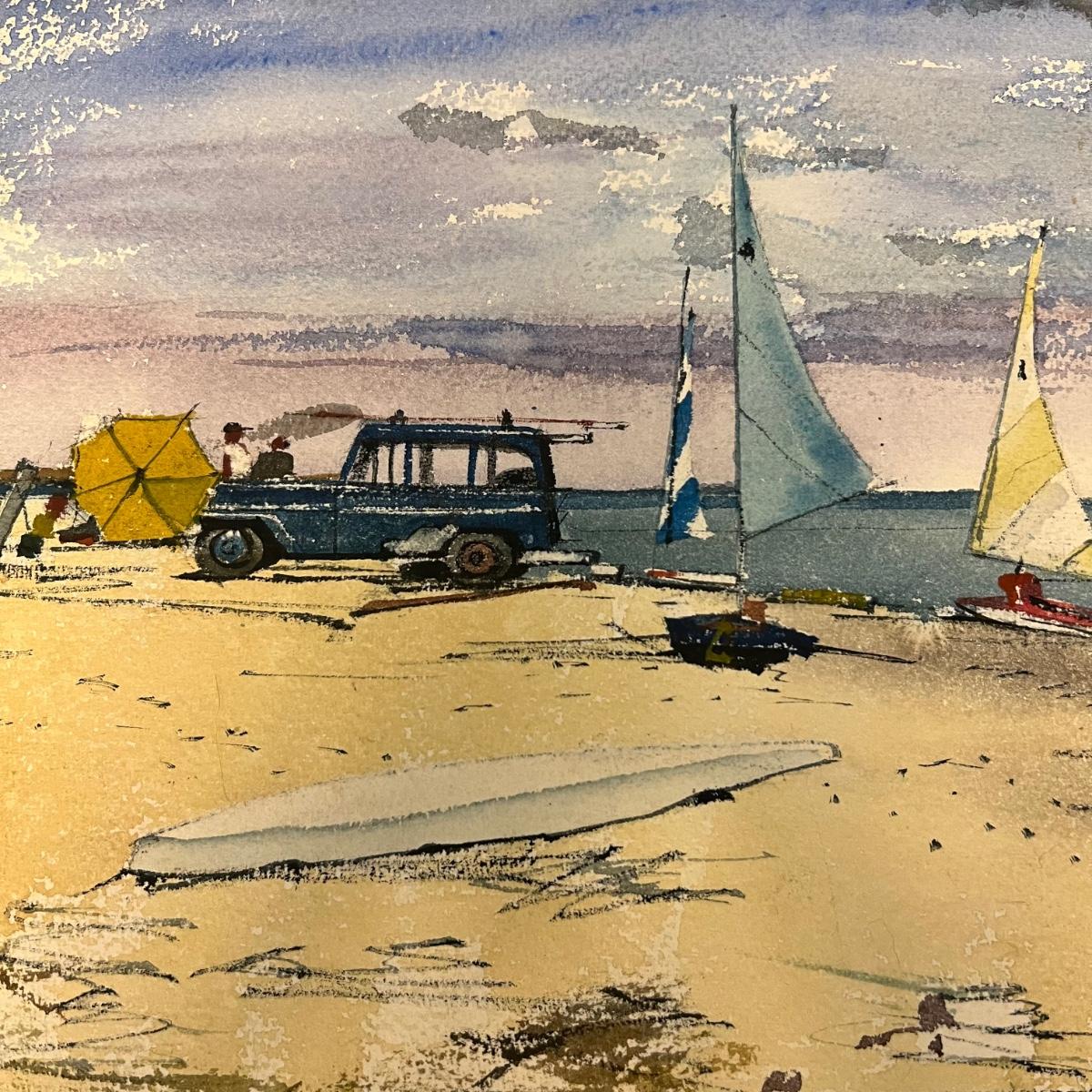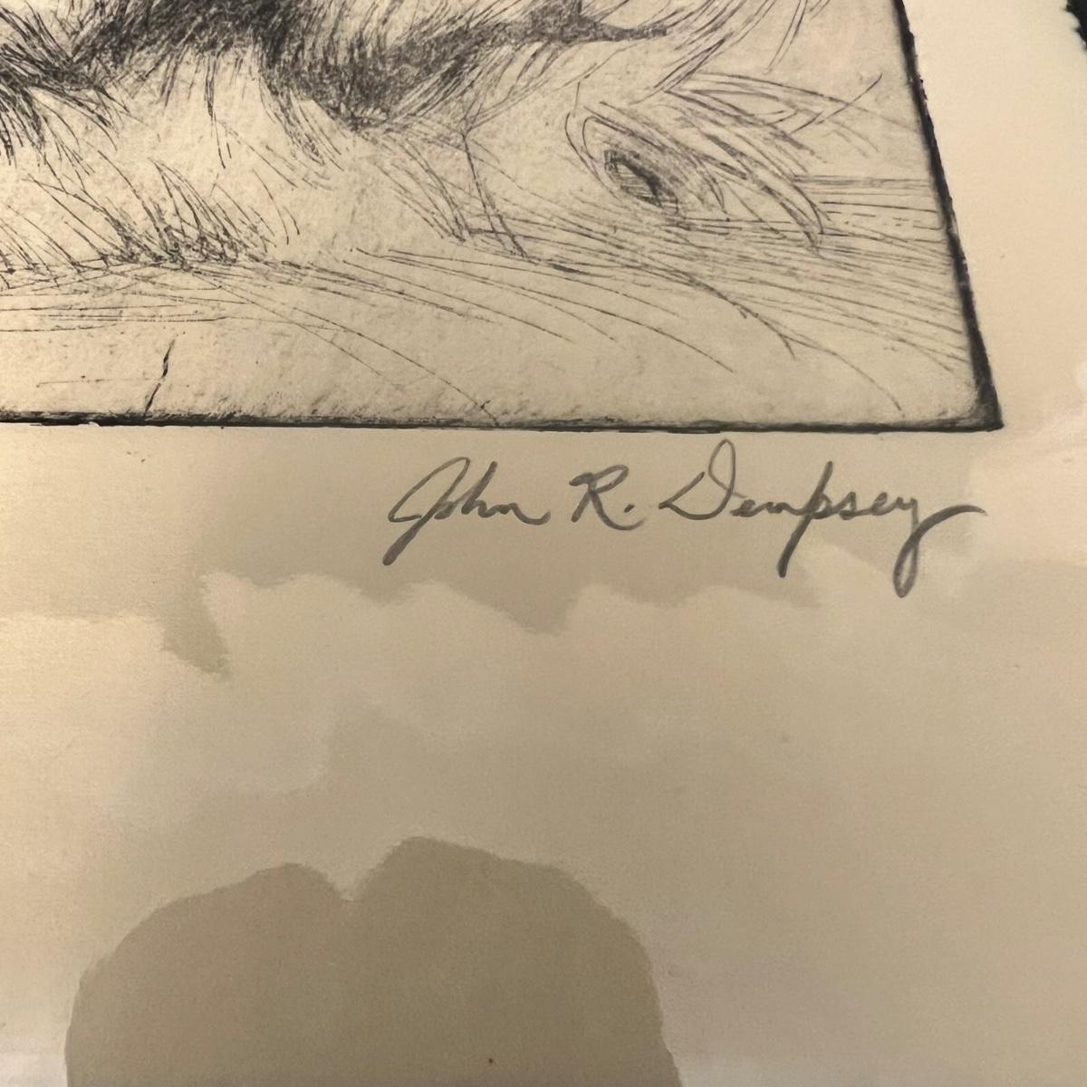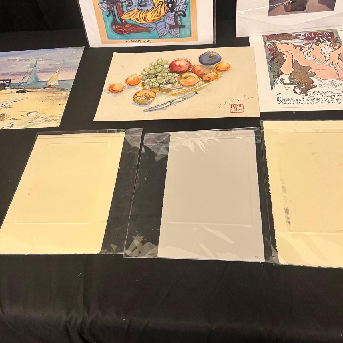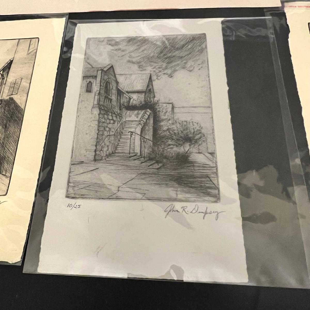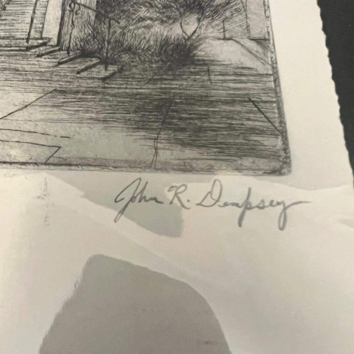 Wonderful assortment of unframed art. Most pieces are signed. Three etchings are pencil signed John E. Dempsey and numbered. Two paintings by Roy Vandam are signed also (note the Nantucket beach scene has a few stains). See photos for full inventory and signatures.