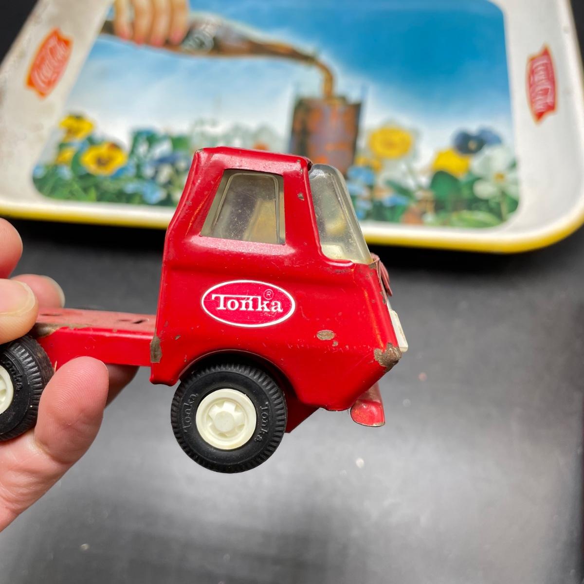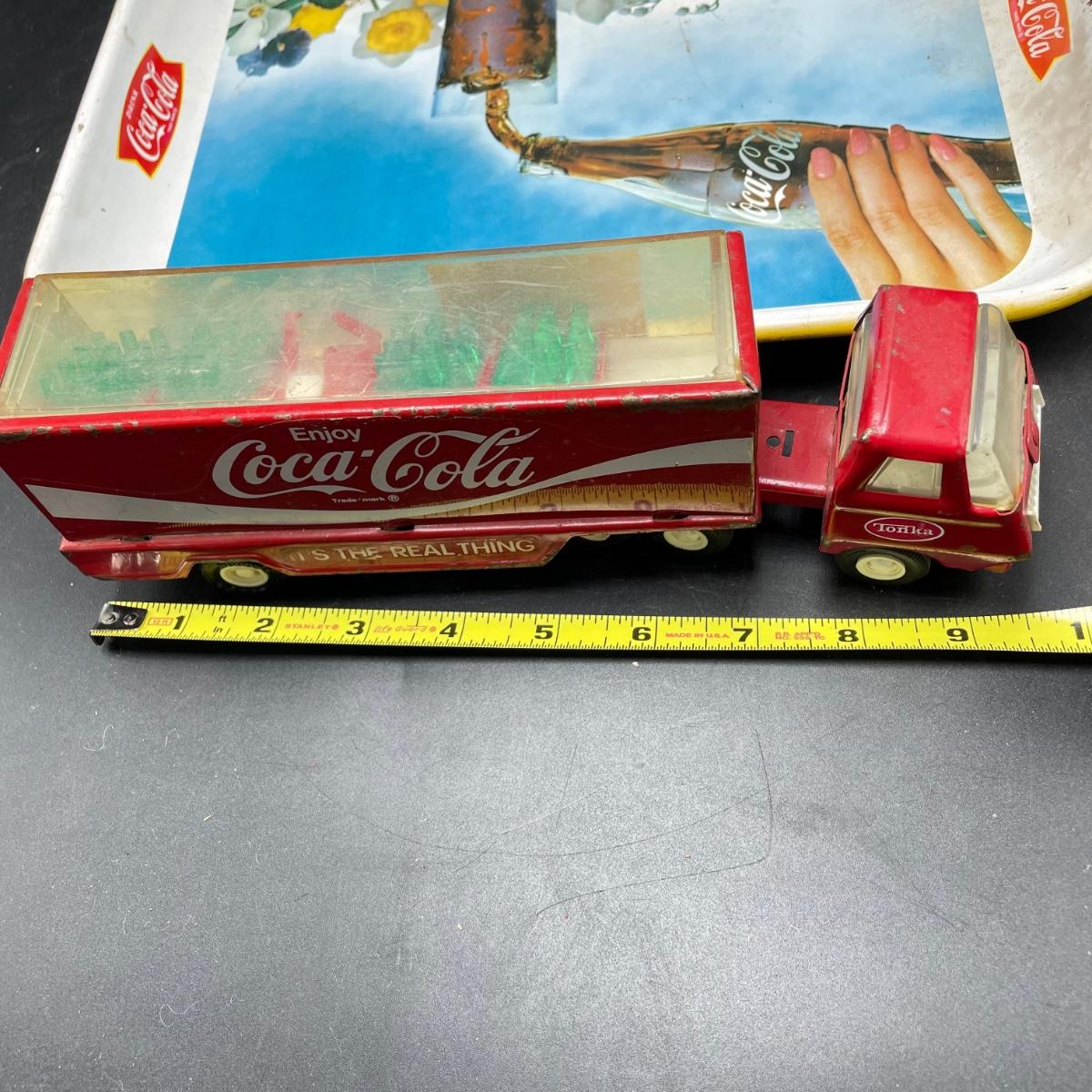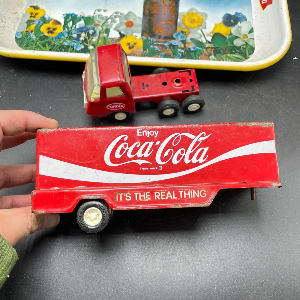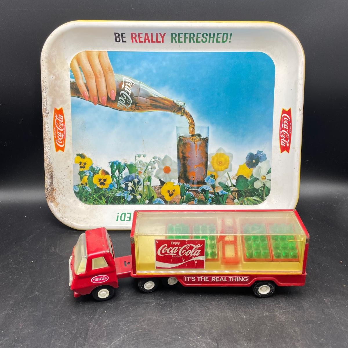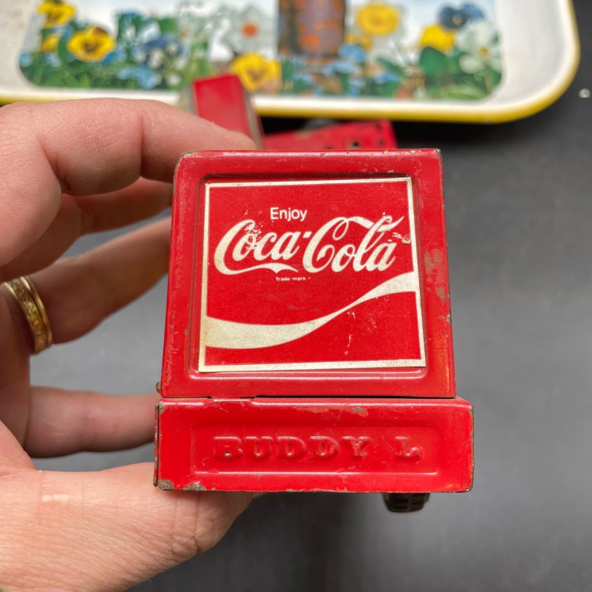 Tin Buddy L Tonka Coca-Cola delivery truck. Truck comes with four bottle crates and hand truck. The hand truck has one handle that is falling off. Lot also contains a thick metal Coca-Cola tray “Be Rally Refreshed” with flowers and flowing soda. See images. Shipping available.