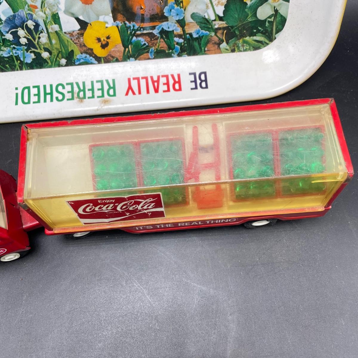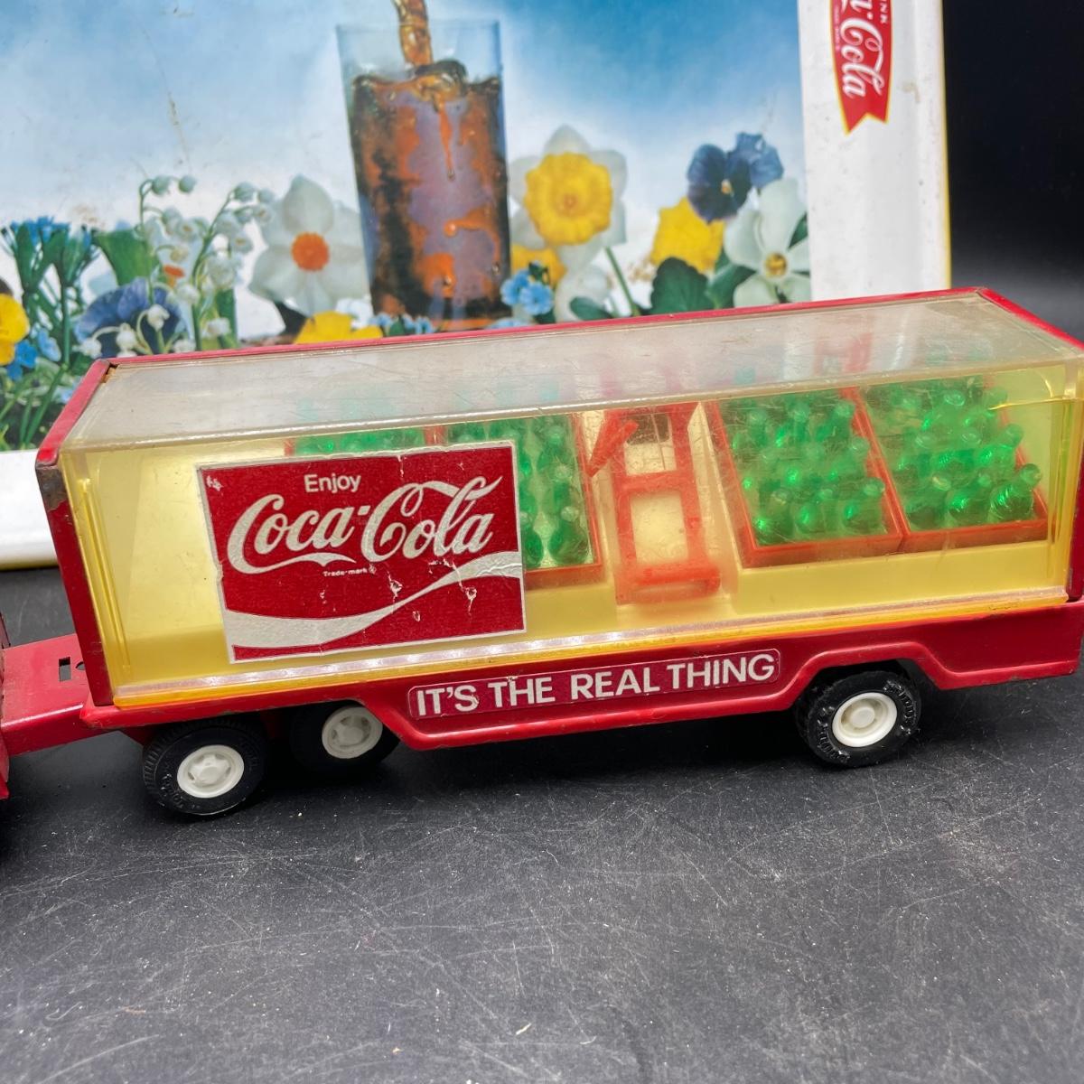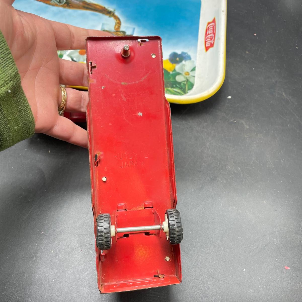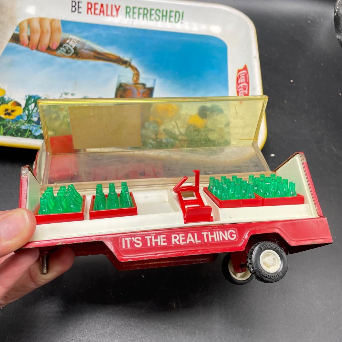 Tin Buddy L Tonka Coca-Cola delivery truck. Truck comes with four bottle crates and hand truck. The hand truck has one handle that is falling off. Lot also contains a thick metal Coca-Cola tray “Be Rally Refreshed” with flowers and flowing soda. See images. Shipping available.