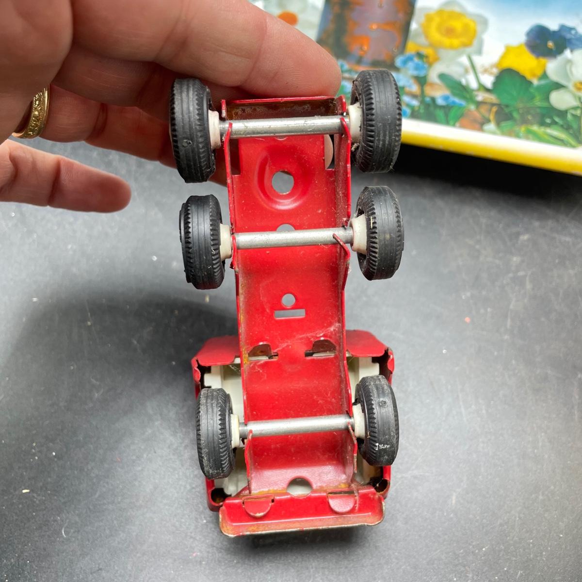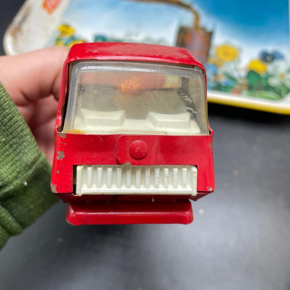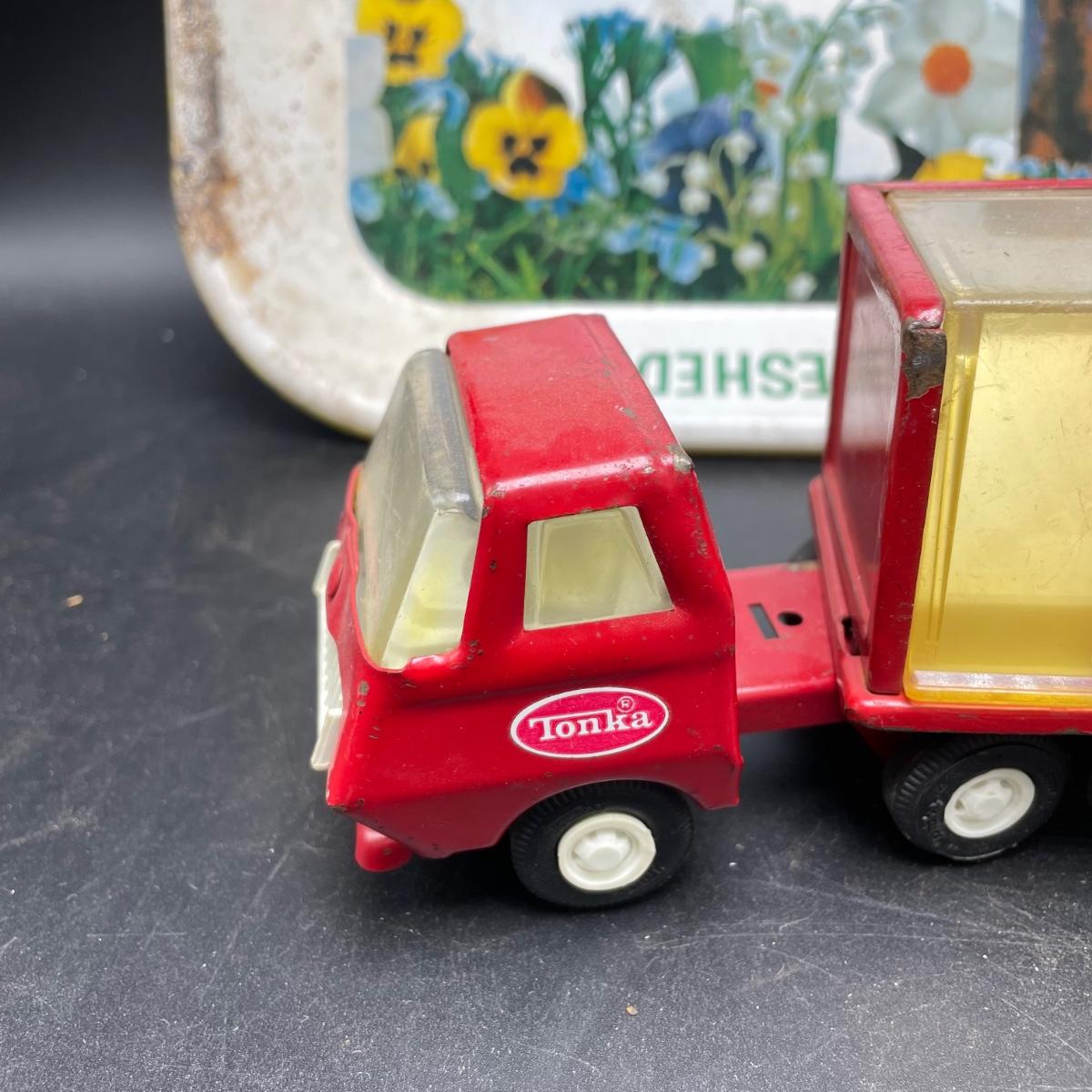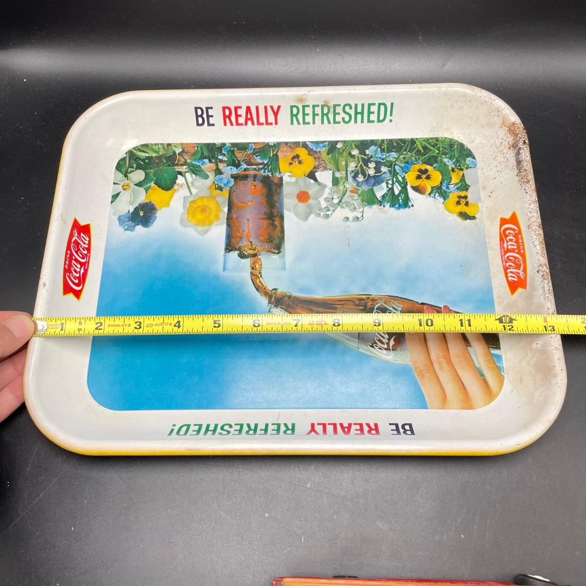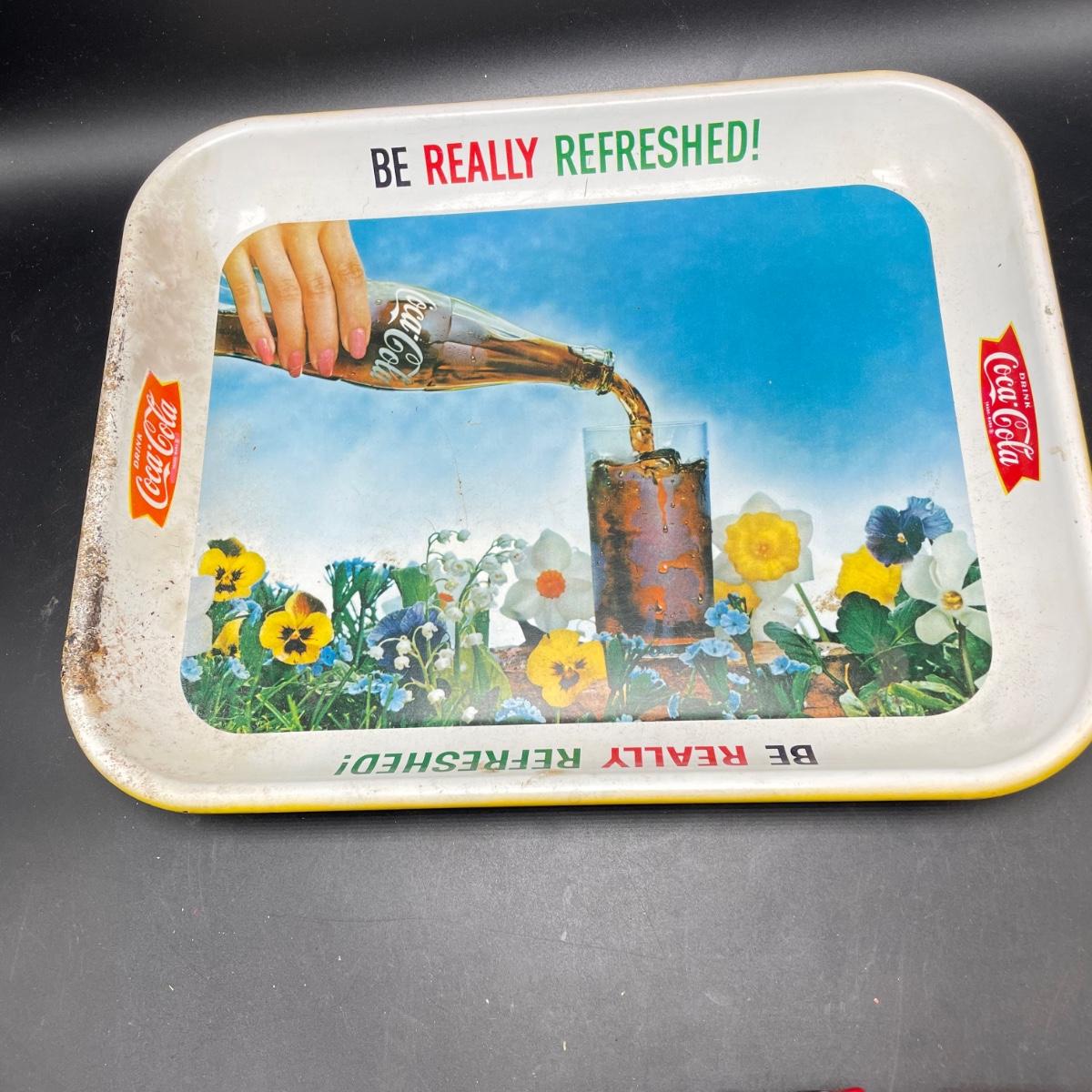 Tin Buddy L Tonka Coca-Cola delivery truck. Truck comes with four bottle crates and hand truck. The hand truck has one handle that is falling off. Lot also contains a thick metal Coca-Cola tray “Be Rally Refreshed” with flowers and flowing soda. See images. Shipping available.