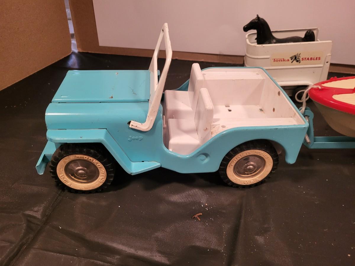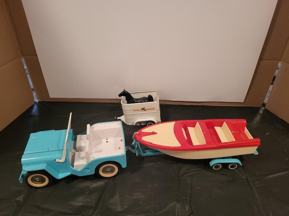 TONKA JEEP, BOAT W/TRAILER AND HORSE TRAILER