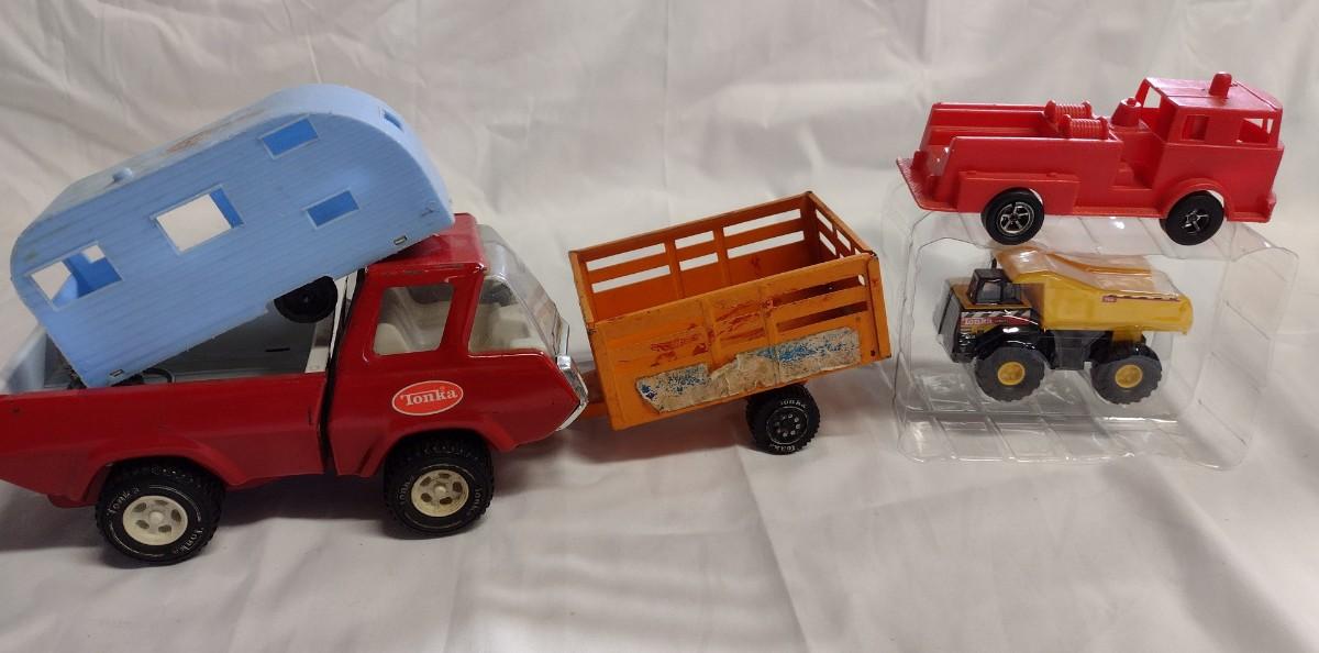 Blue Camp trailer Dump Truck and Fire Truck are Plastic, Orange Trailer a Van Truck are Steel as Shown - Winning Bid Buys All Items Shown, All Item(s) are Sold As Is - Photo's Are Part of the Description - Pickup by Appointment, or Shipping is Available (Buyer Pays)