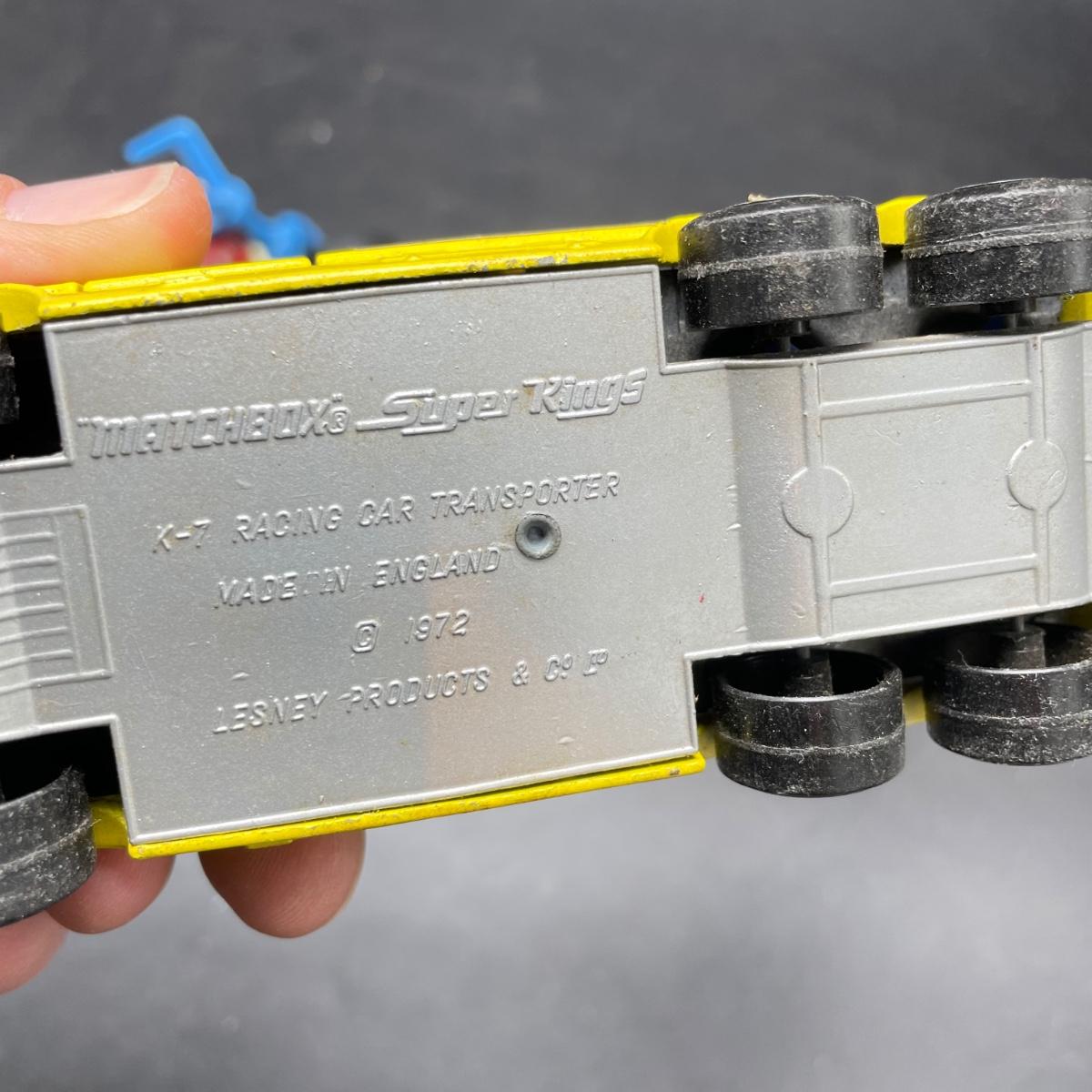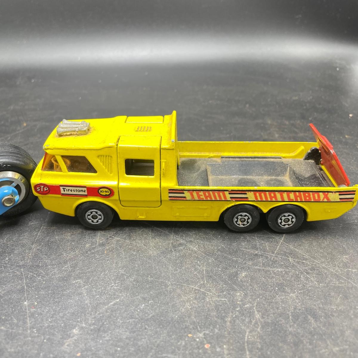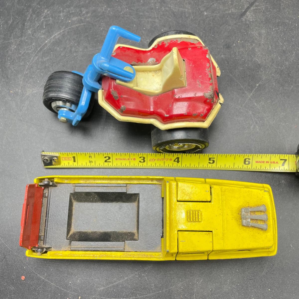 A die cast 1972 Marchbox Super Kings K - 7 Racing Car Transporter with a vintage tin Tonka Trike with hard plastic wheels. See images. Shipping available.