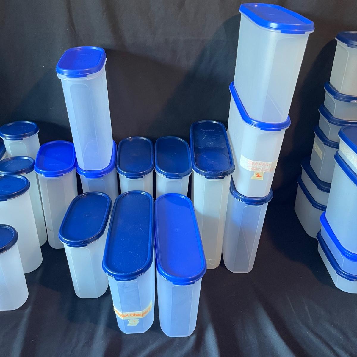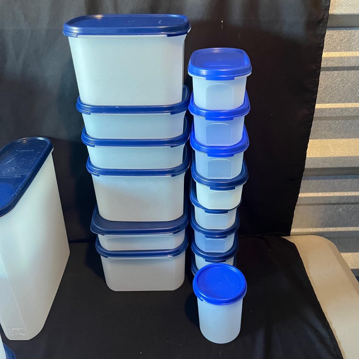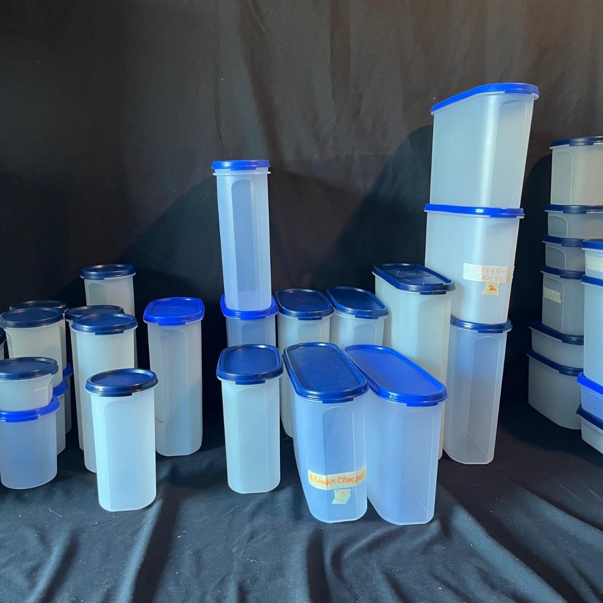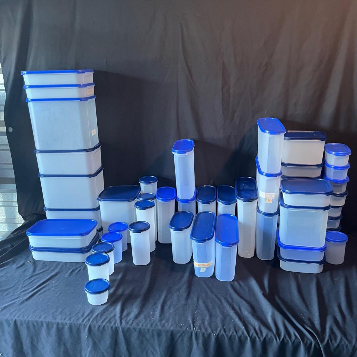 Lot includes fifty Tupperware containers in a variety of sizes and shapes with all including blue matching lids. Largest piece measures 7.5” x 11” x 9”.