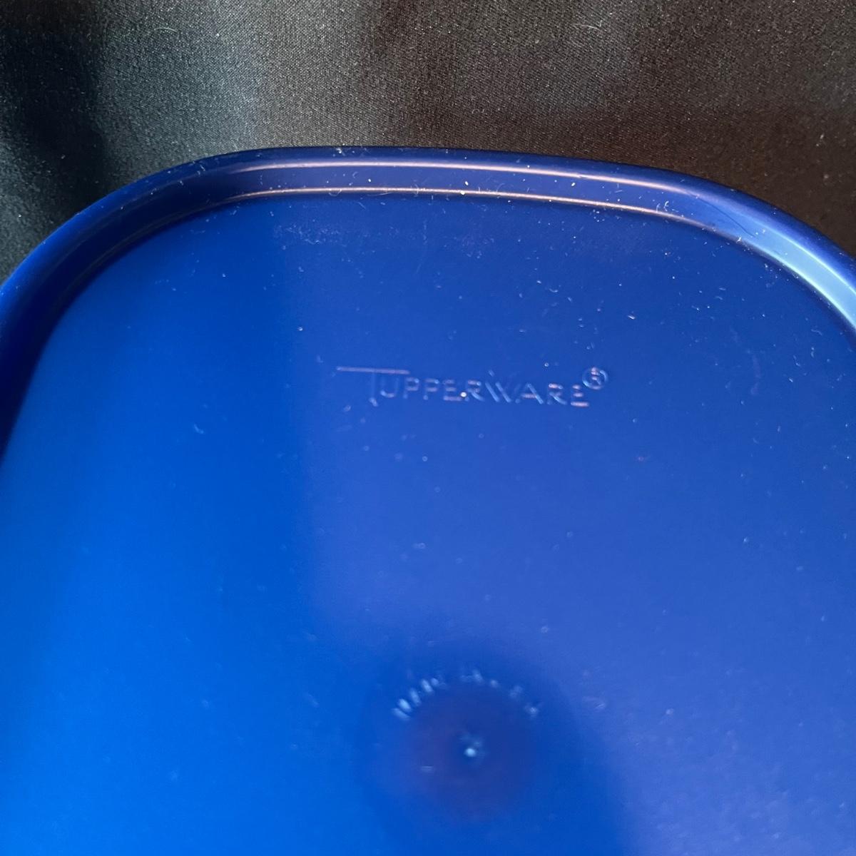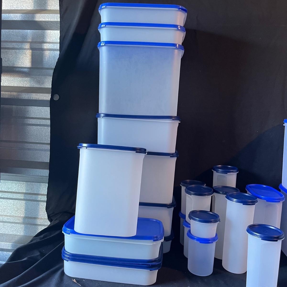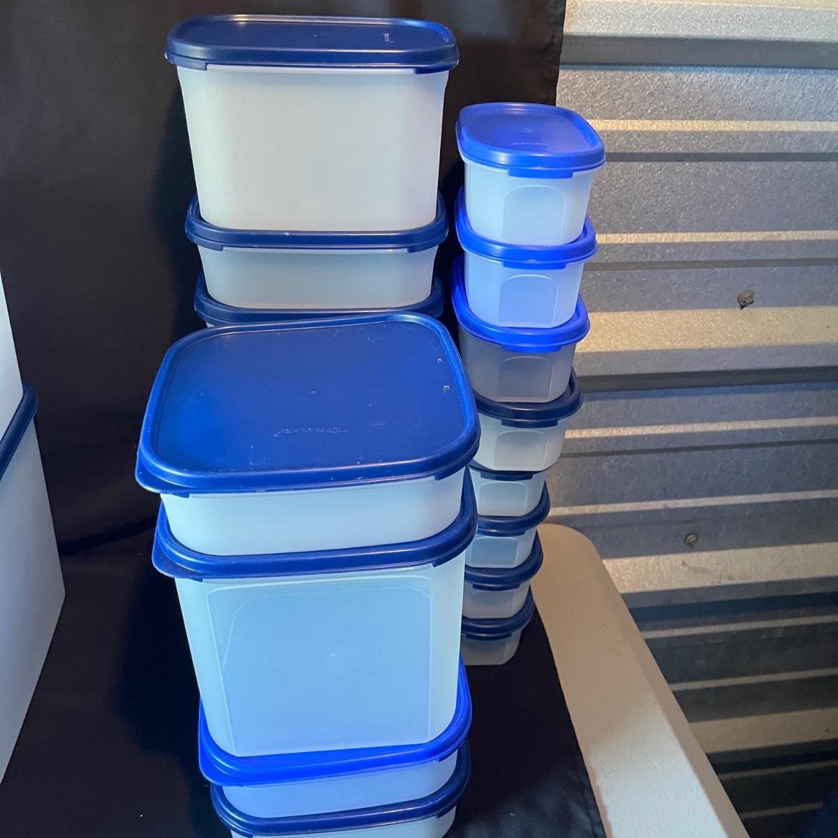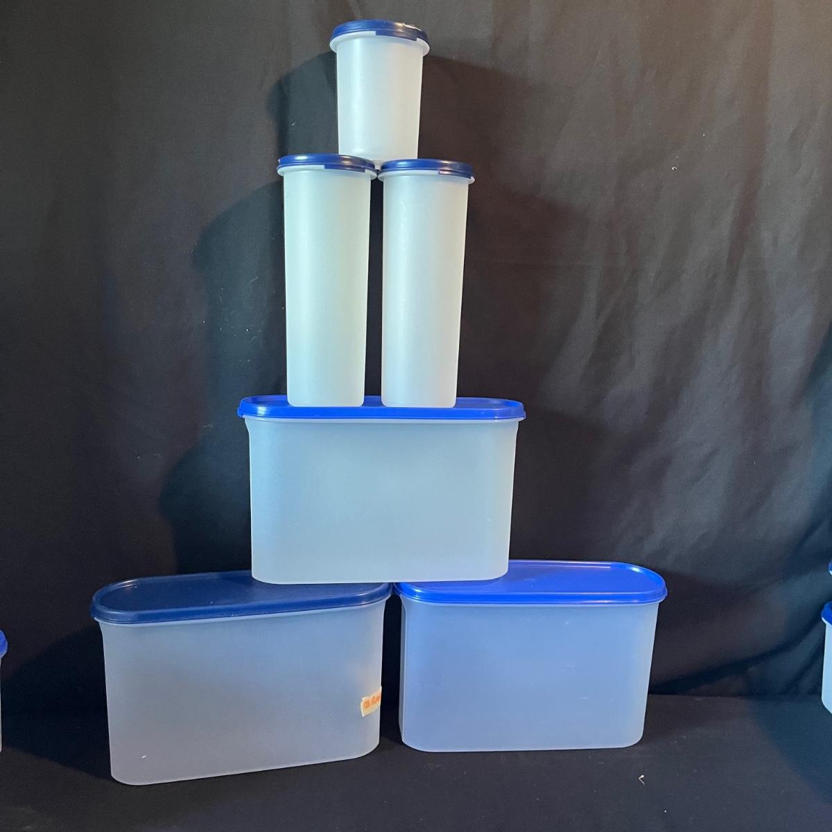 Lot includes fifty Tupperware containers in a variety of sizes and shapes with all including blue matching lids. Largest piece measures 7.5” x 11” x 9”.