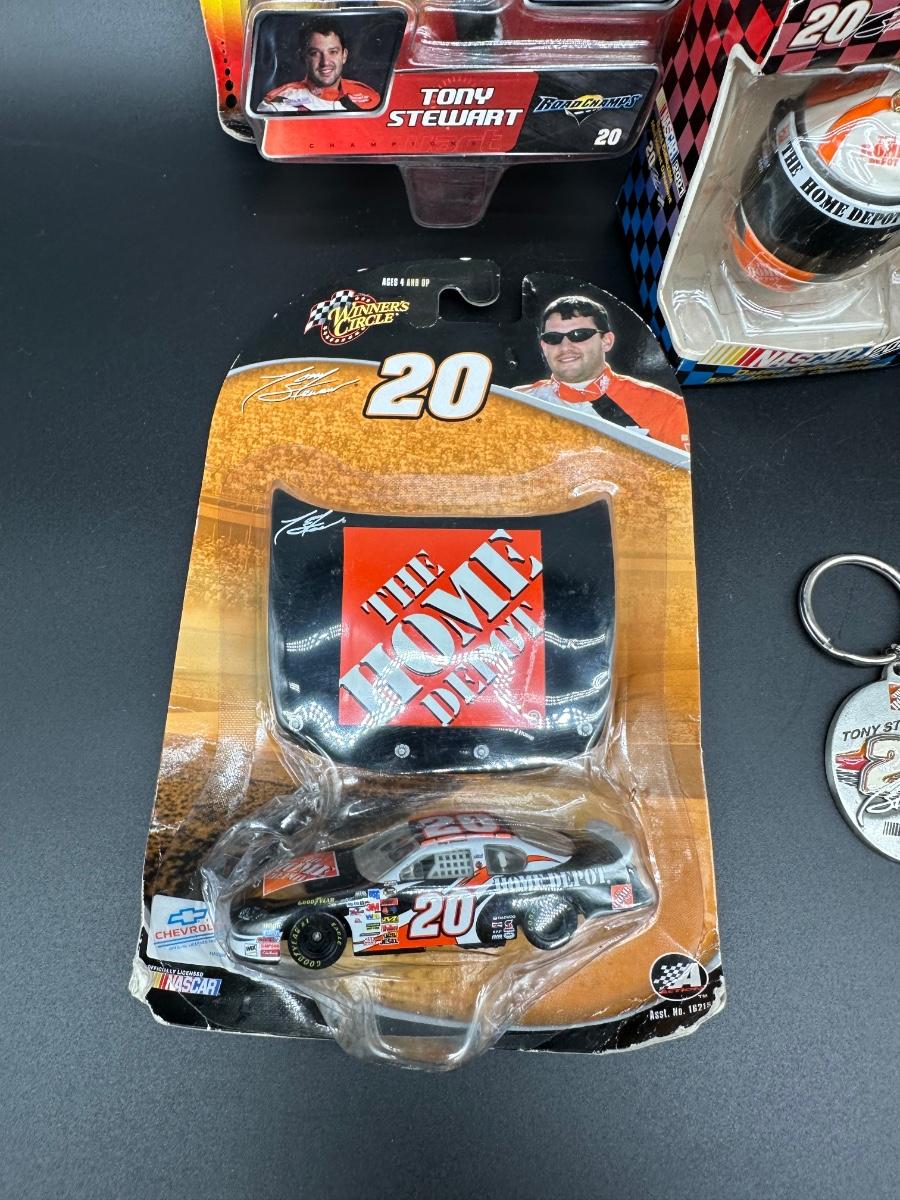 Mixed Tony Stewart #20 NASCAR collectible lot featuring Home Depot–branded memorabilia from the early 2000s. Lot includes a variety of officially licensed items