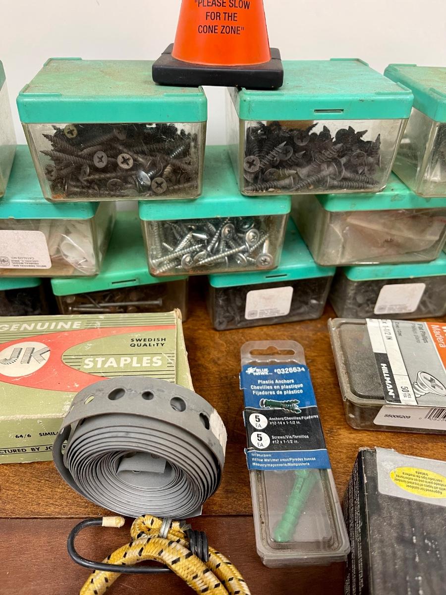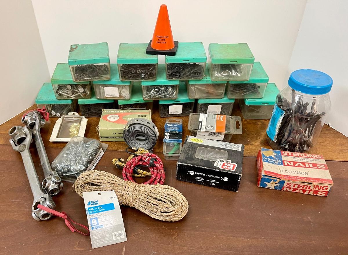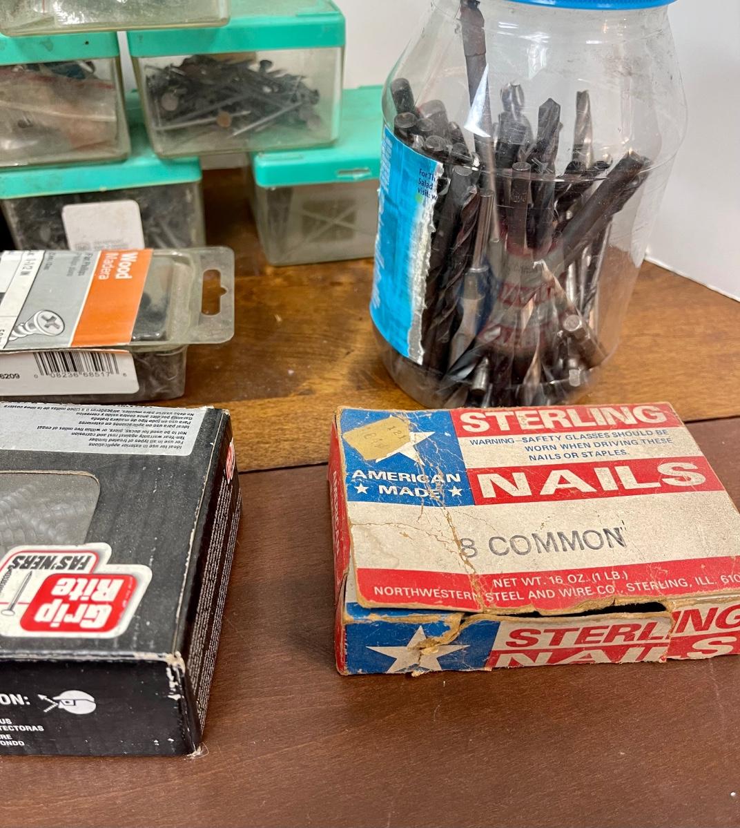Garage Tool Hardware Lot with Organization Containers Nails Screws Wrenches Drill Bits