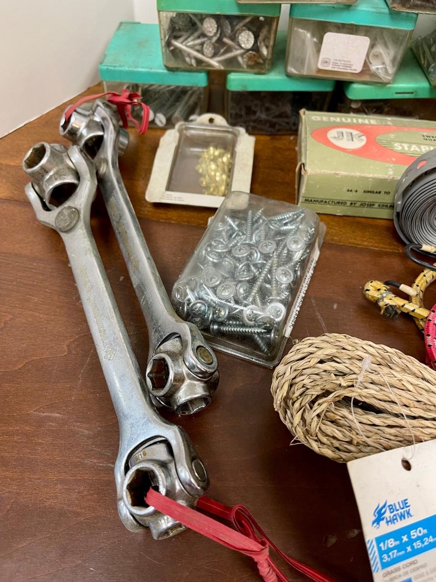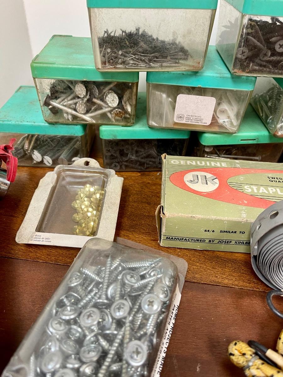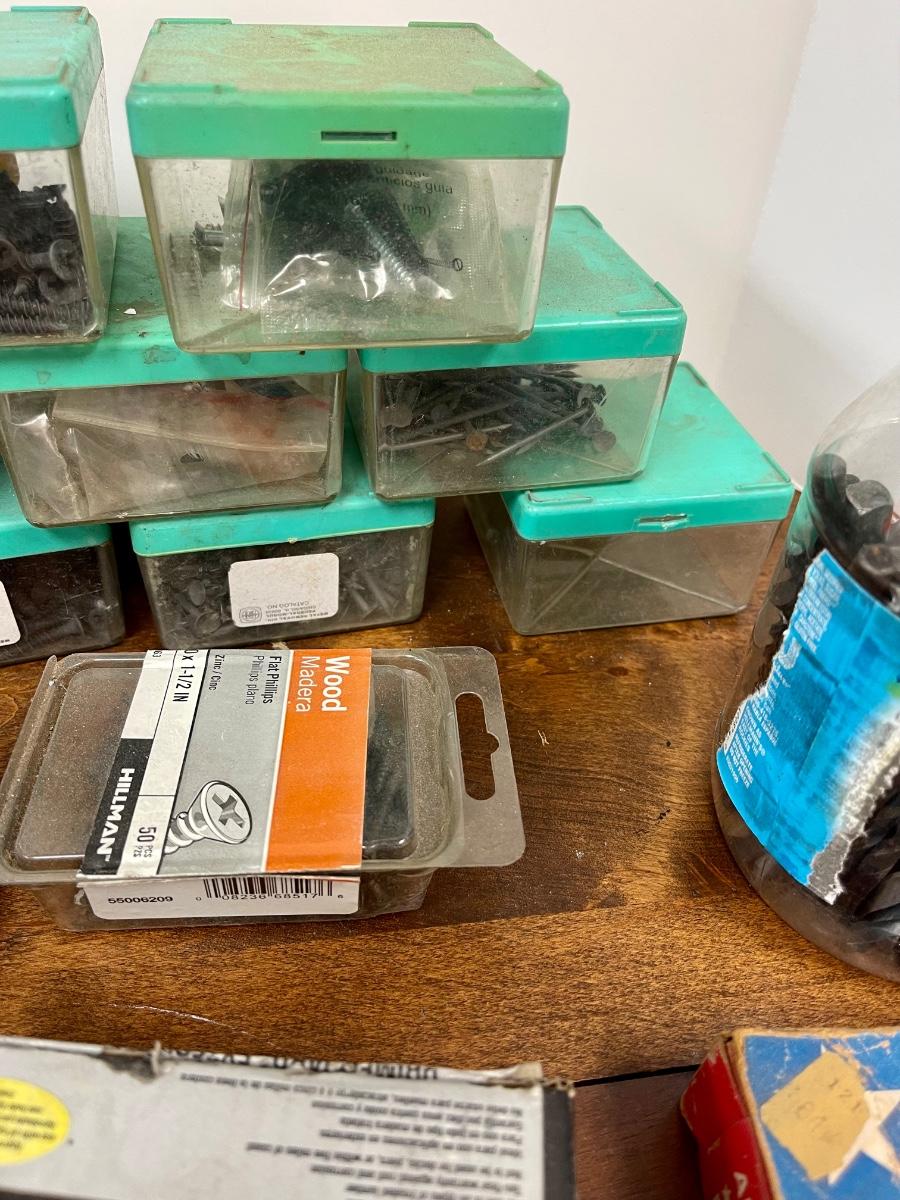 Garage Tool Hardware Lot with Organization Containers Nails Screws Wrenches Drill Bits