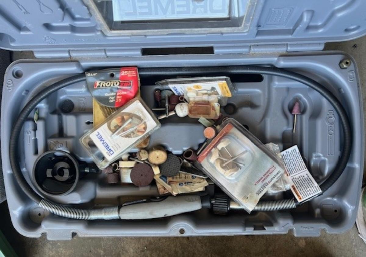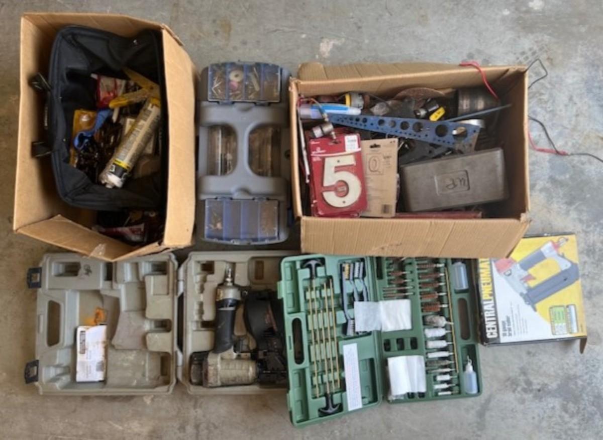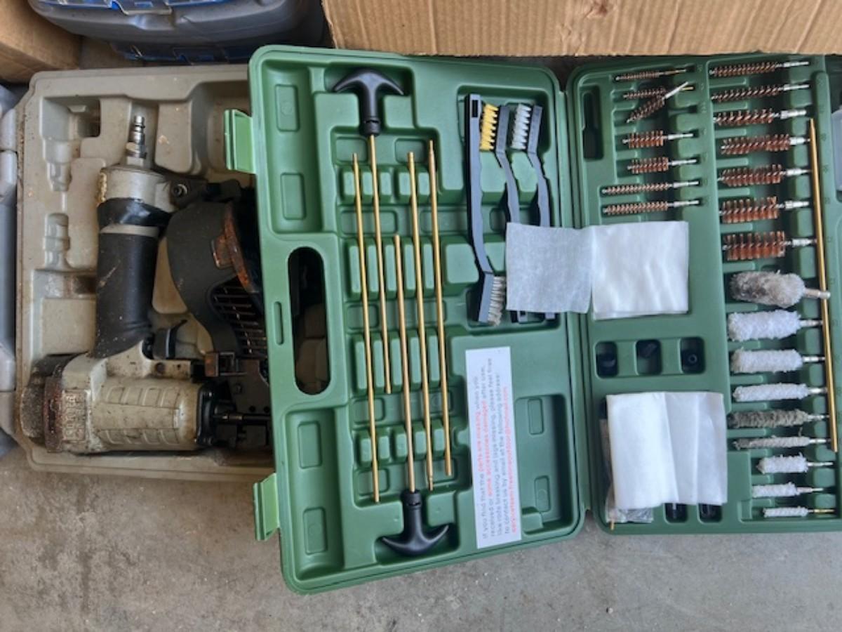 Includes Porter Cable nail gun, Dremel tool with kit, brad nailer, gun cleaning kit, and more.
