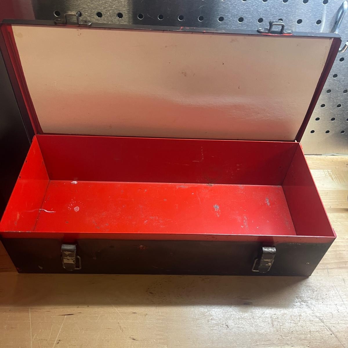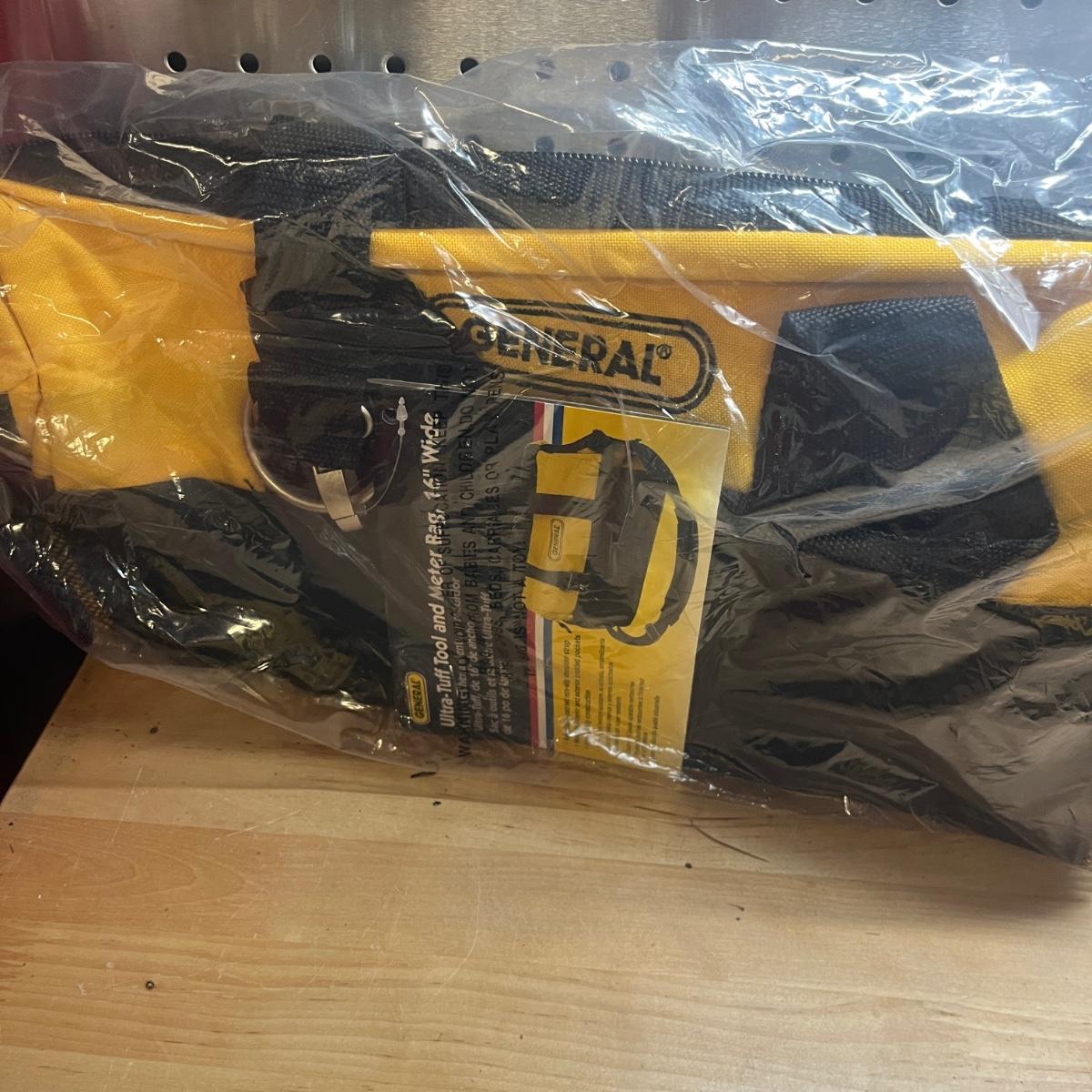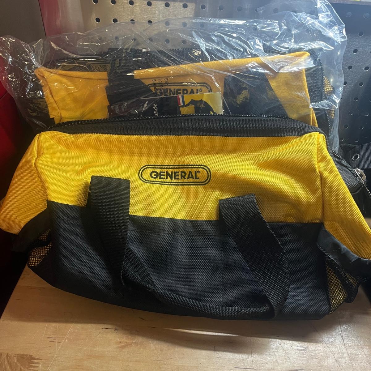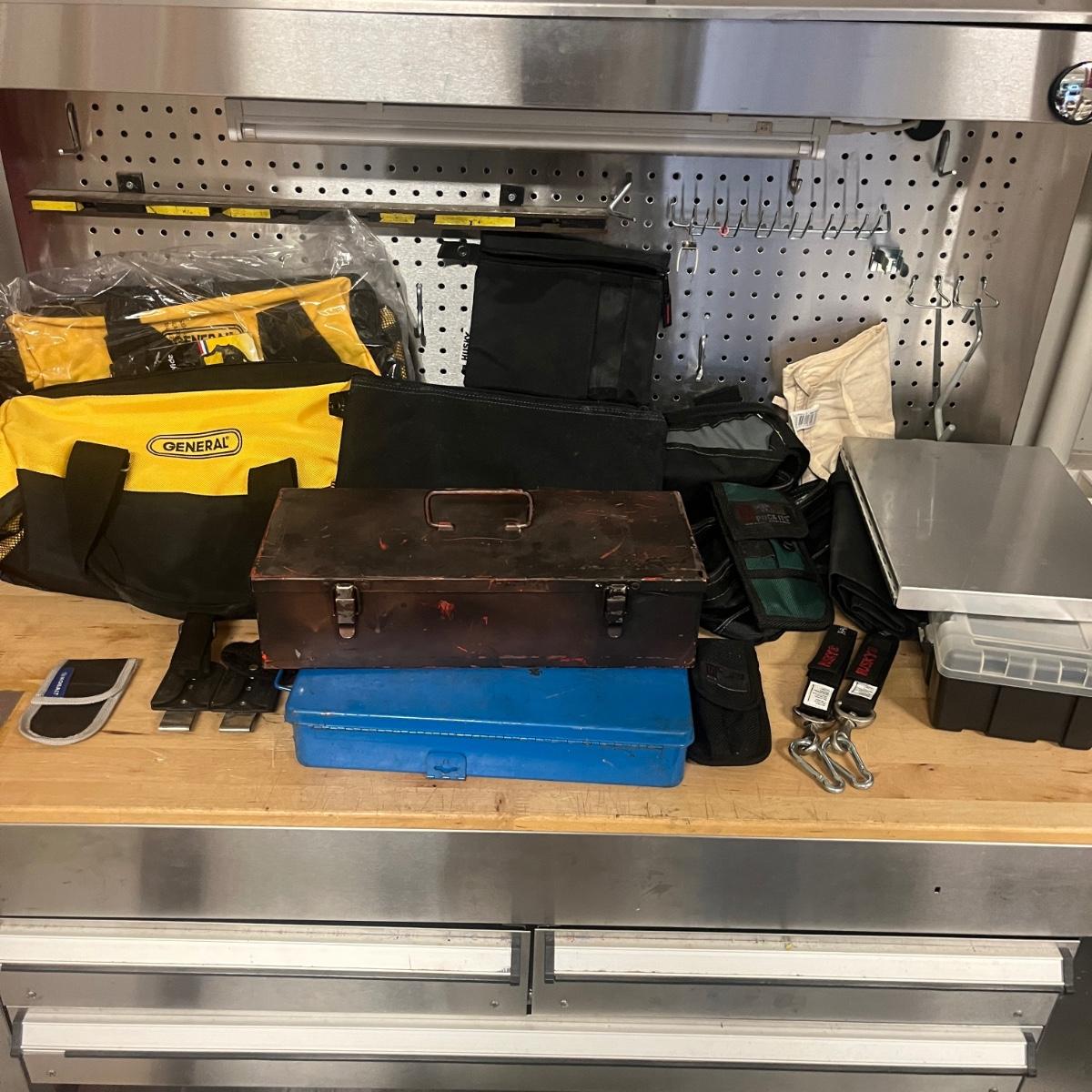 Lot includes two General tool bags, metal toolbox, plastic storage organizer, metal box, metal paper holder, tool belt belt clips and more. Tool bags measure 16” x 9” x 12”H when open.