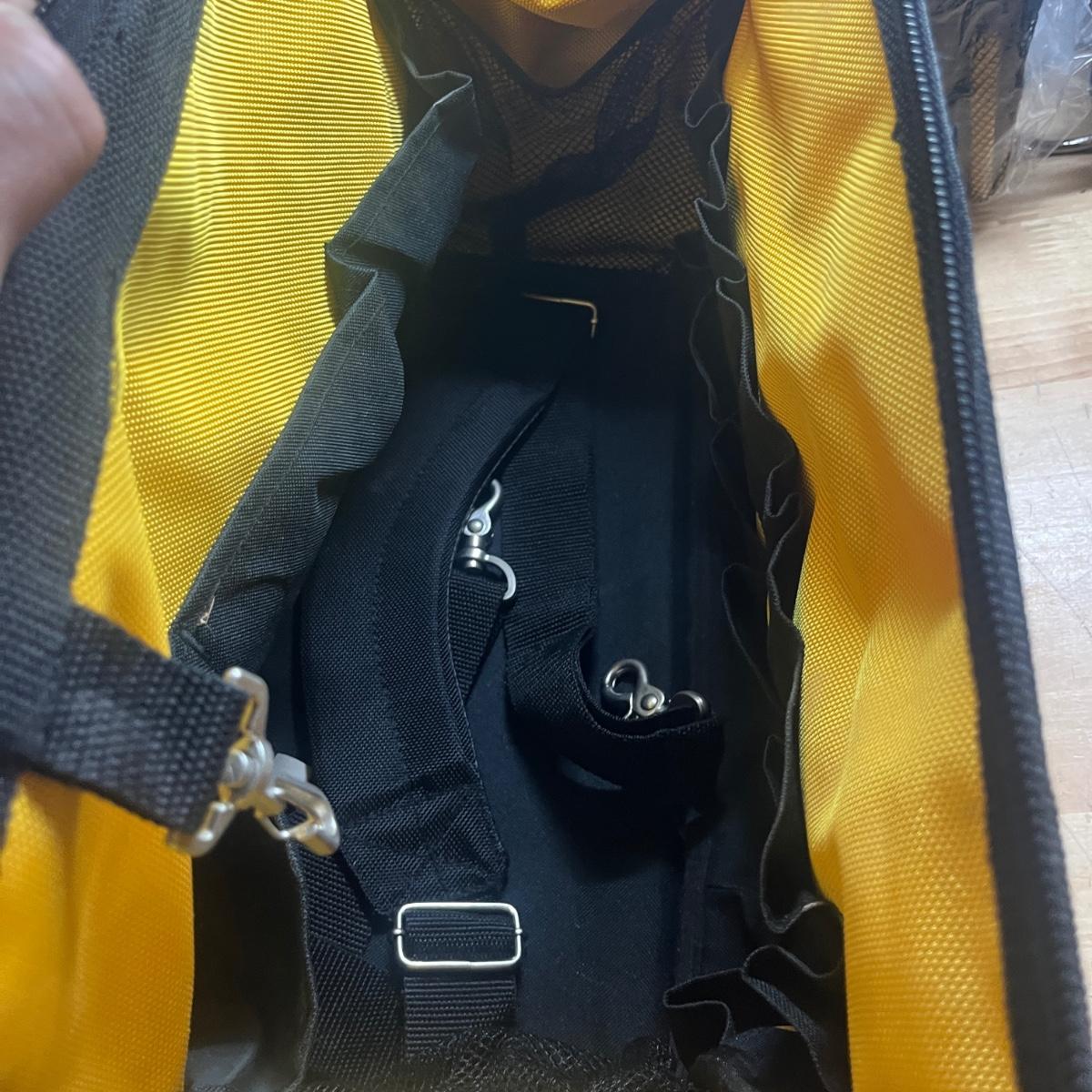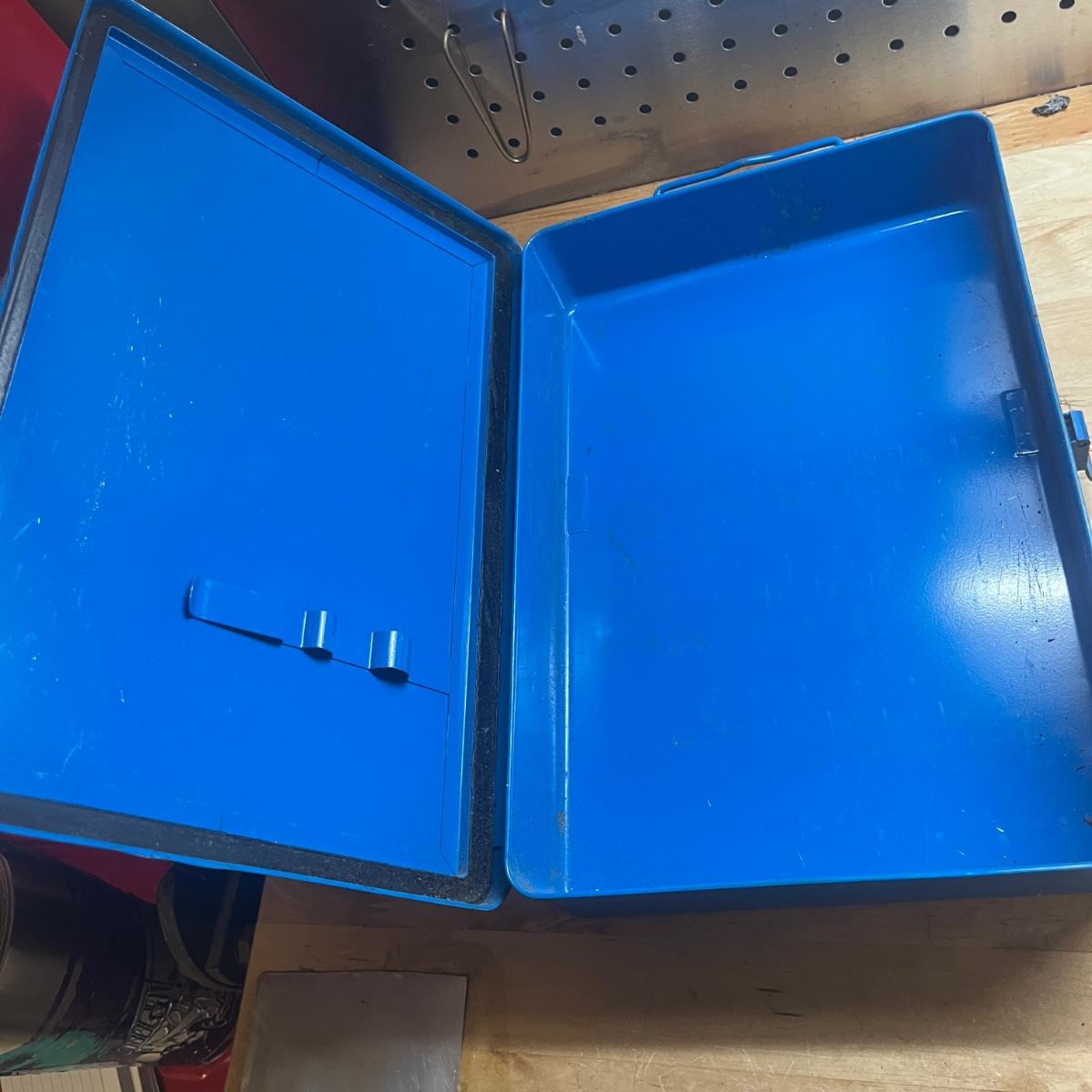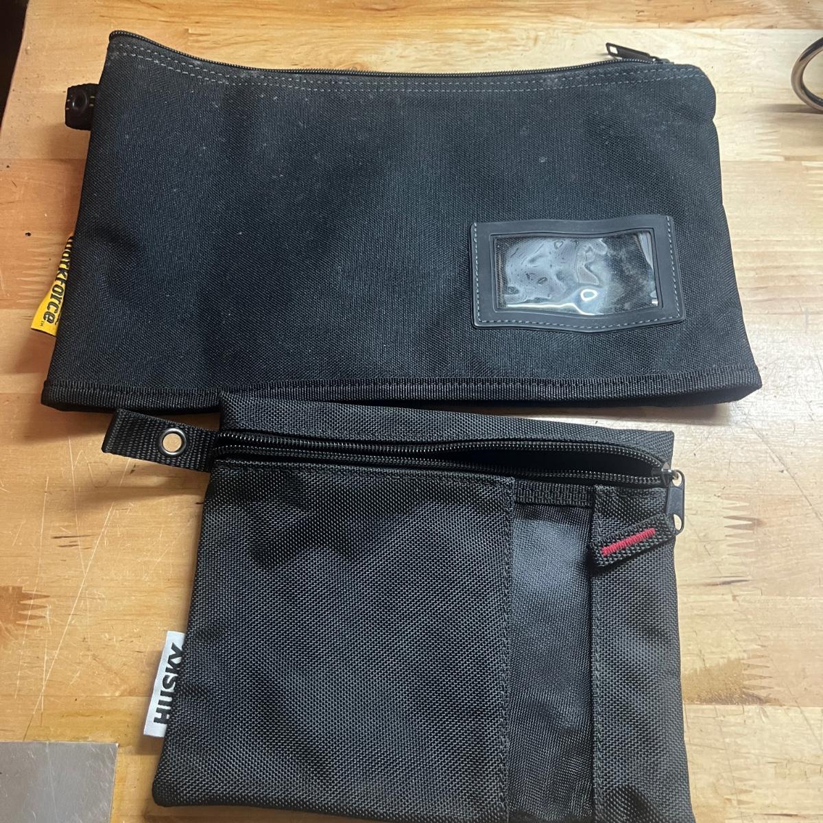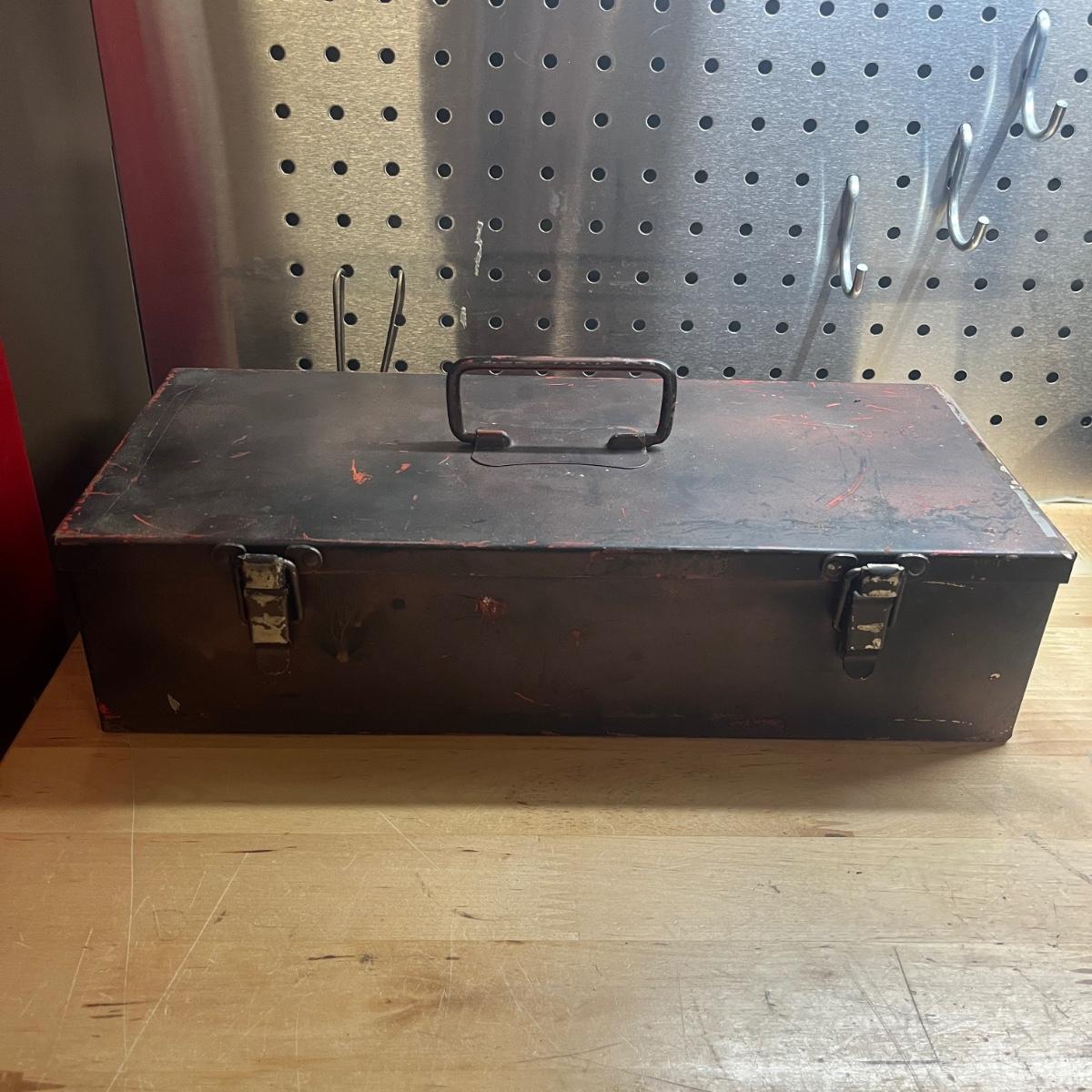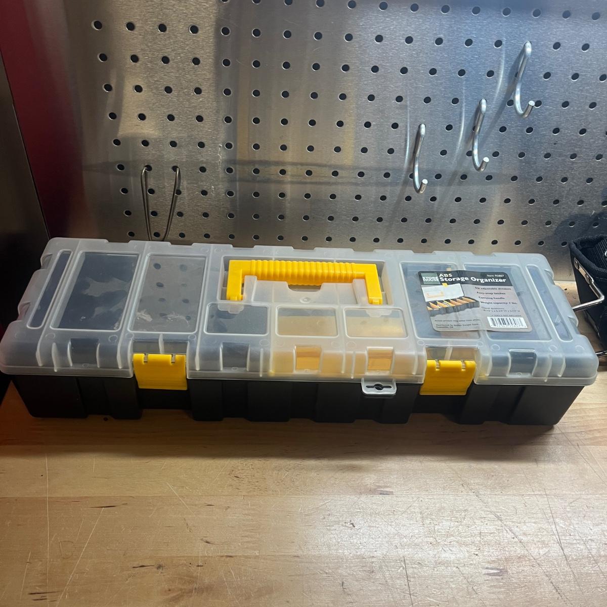 Lot includes two General tool bags, metal toolbox, plastic storage organizer, metal box, metal paper holder, tool belt belt clips and more. Tool bags measure 16” x 9” x 12”H when open.