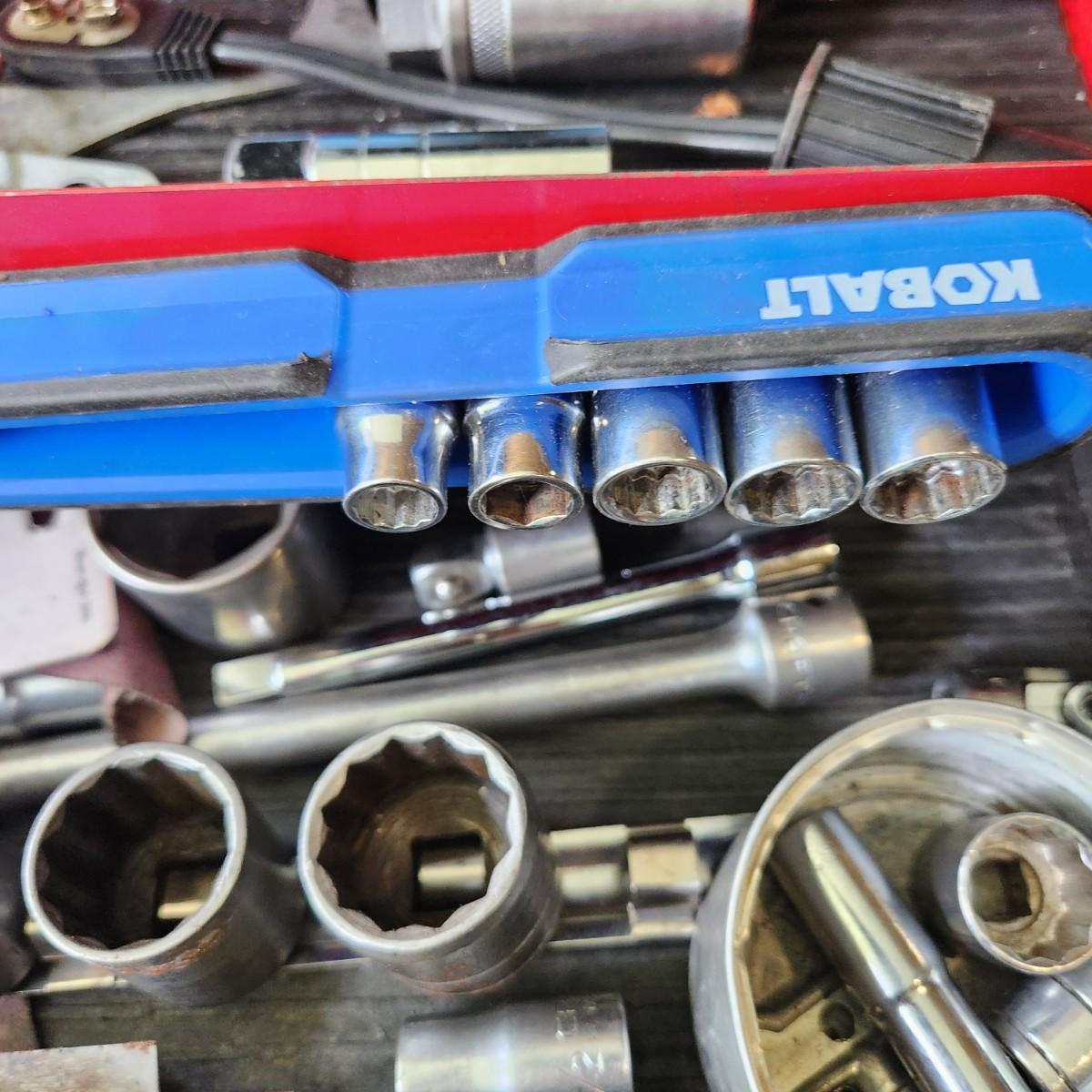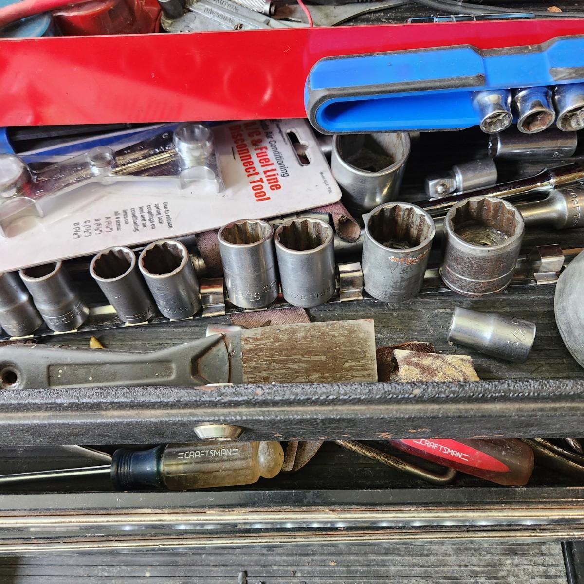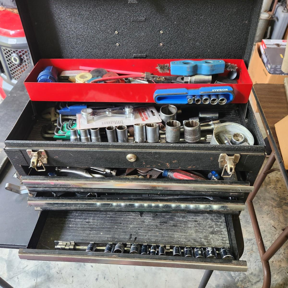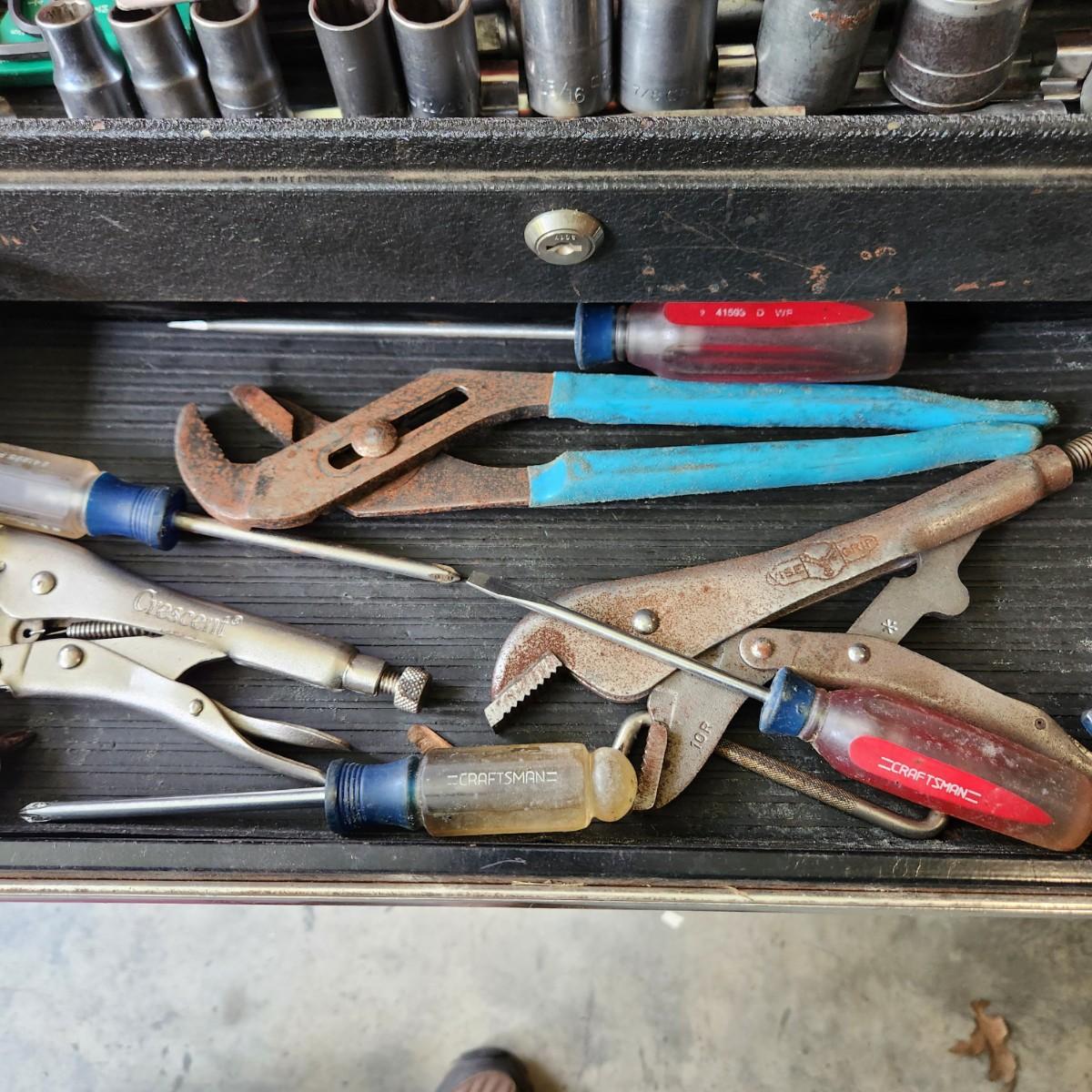 Tool box Loaded with Tools as Pictured Sockets , Vise Grips Channelocks