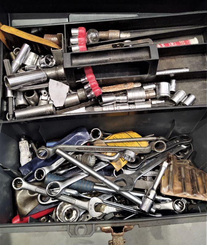 lot 100 -Tool box of assorted wrenches, sockets, etc.