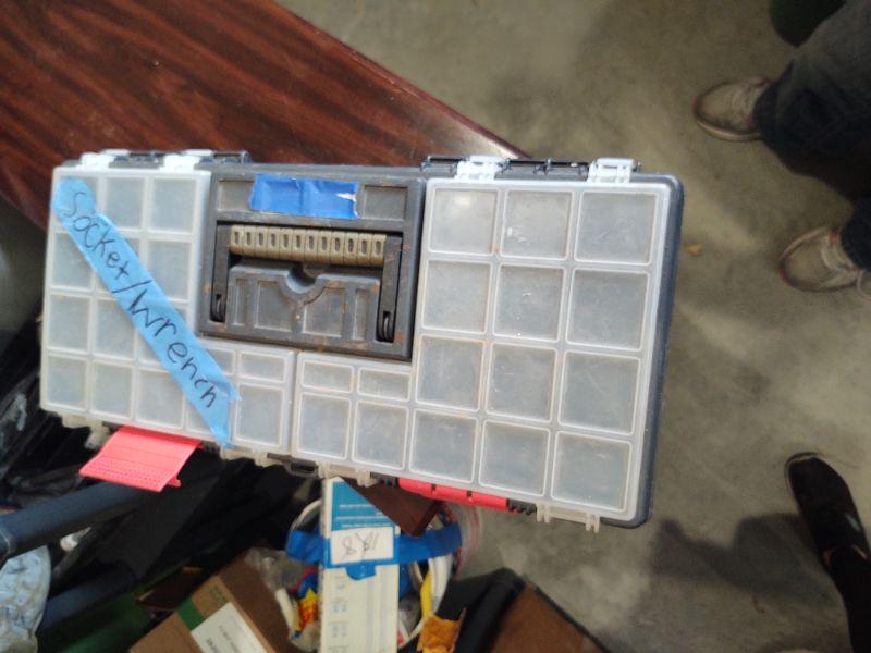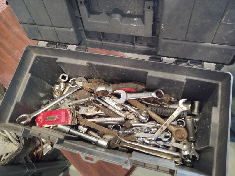 Tool box of assorted wrenches, sockets, drill bits, etc. (50+)