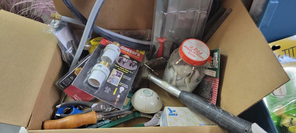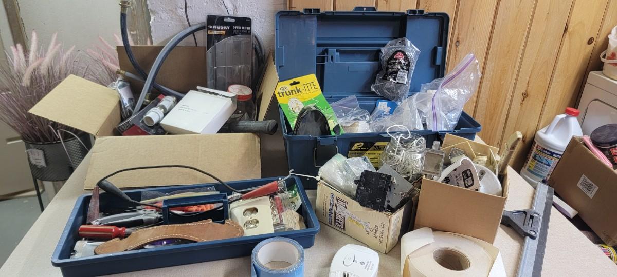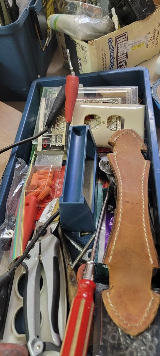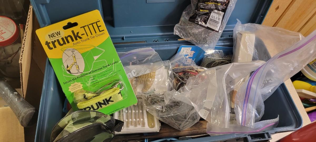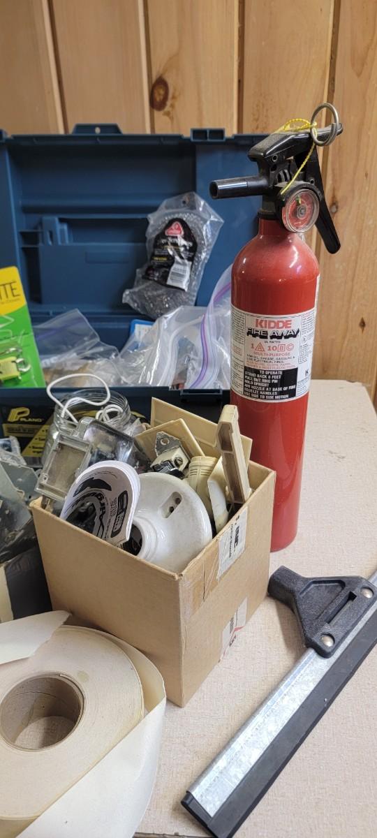 Tool box full of miscellaneous items. Fire extinguisher and more