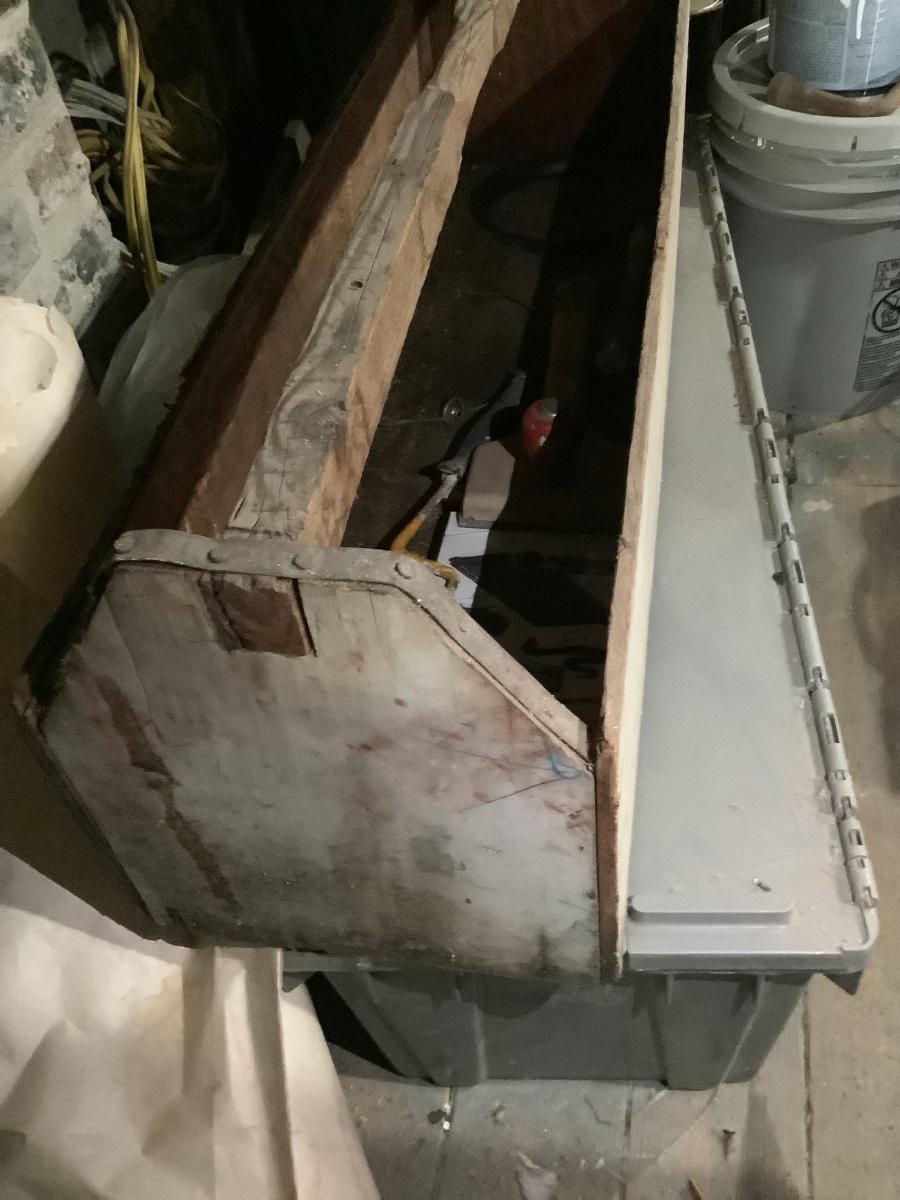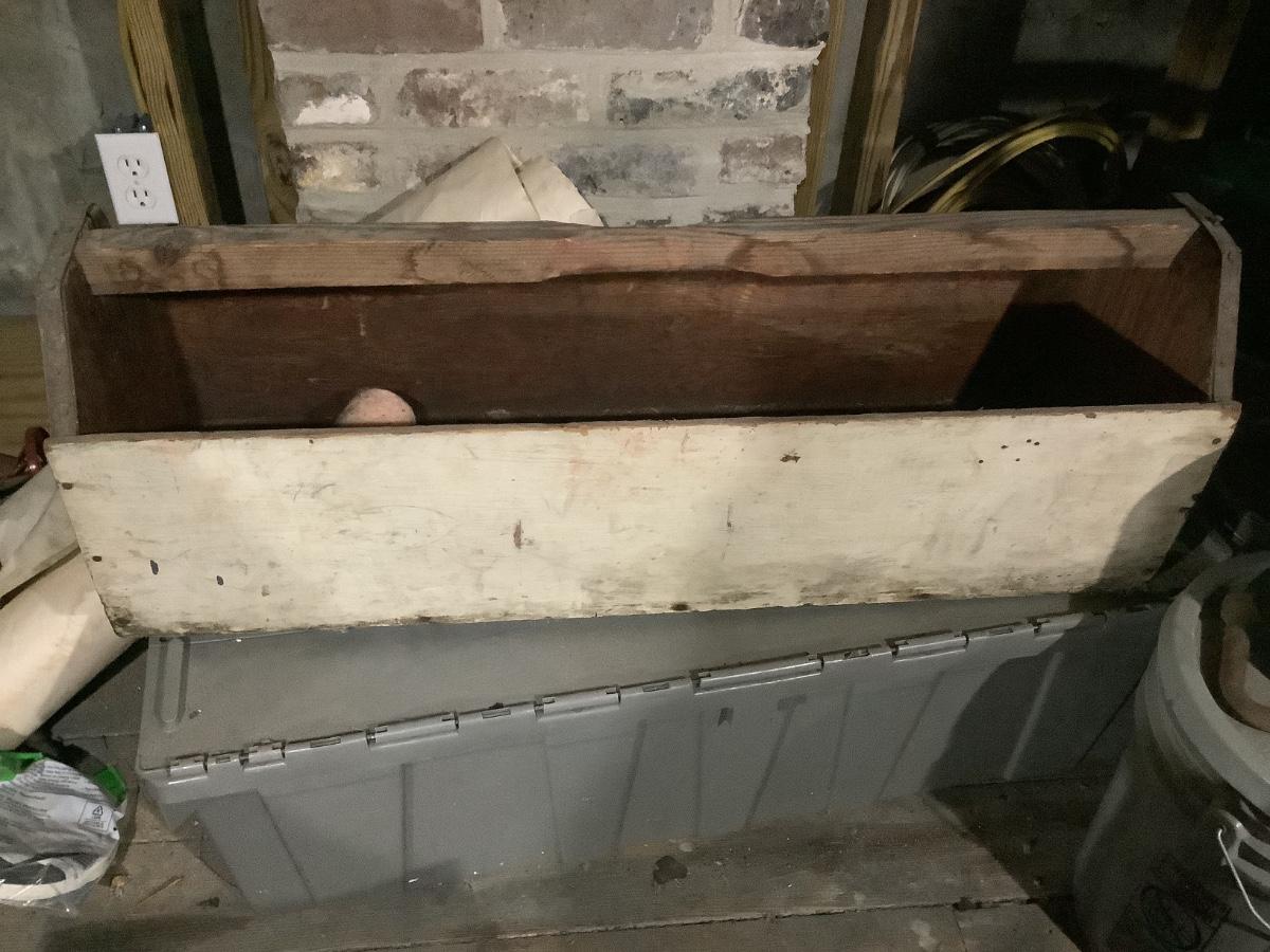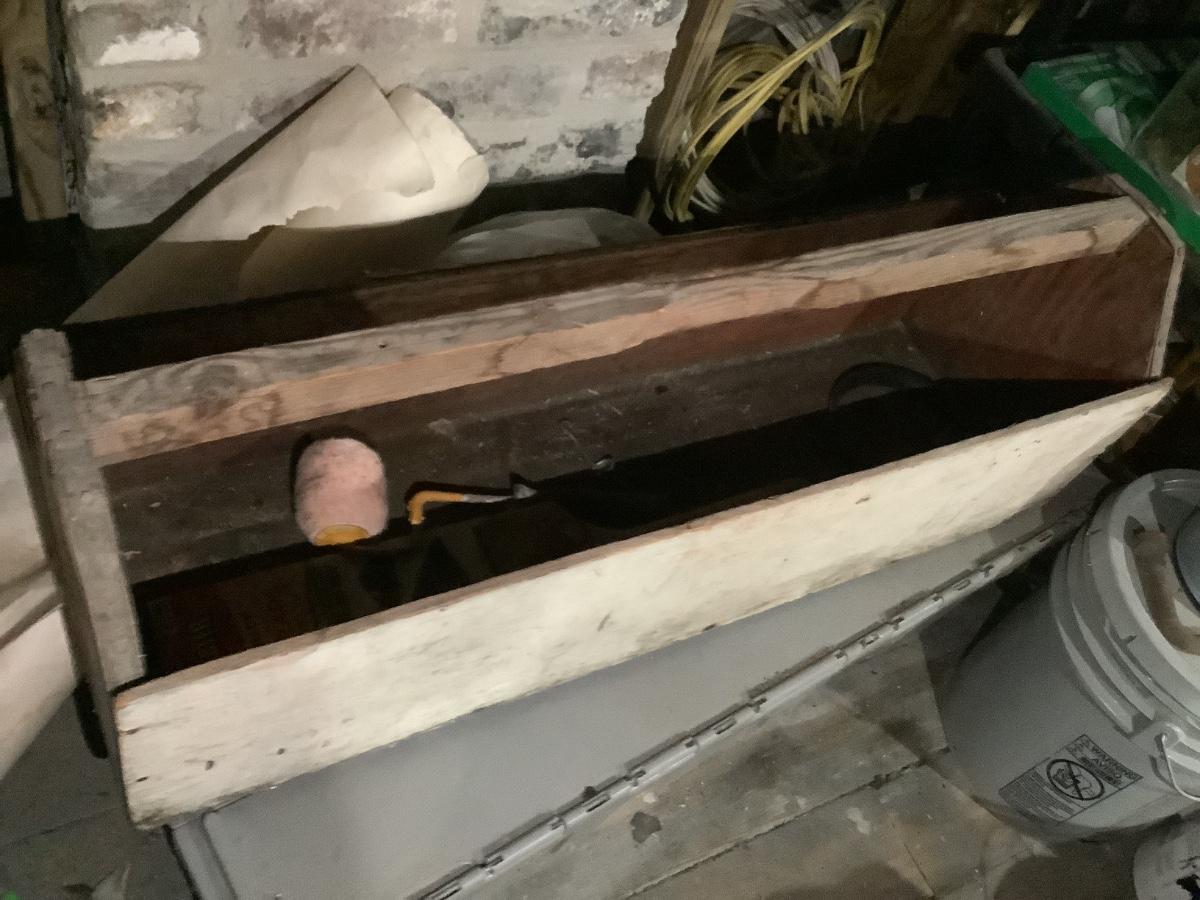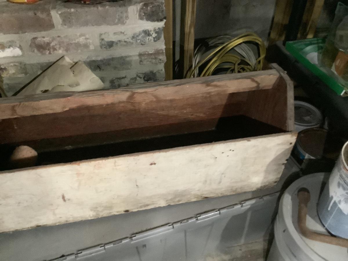 Old meets the new- sturdy old wooden tool box 36”L. 10 1/2”W. 2” H