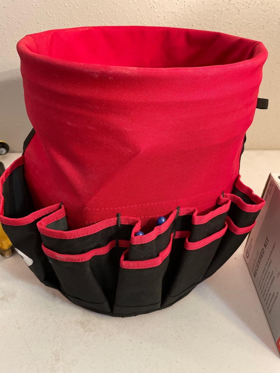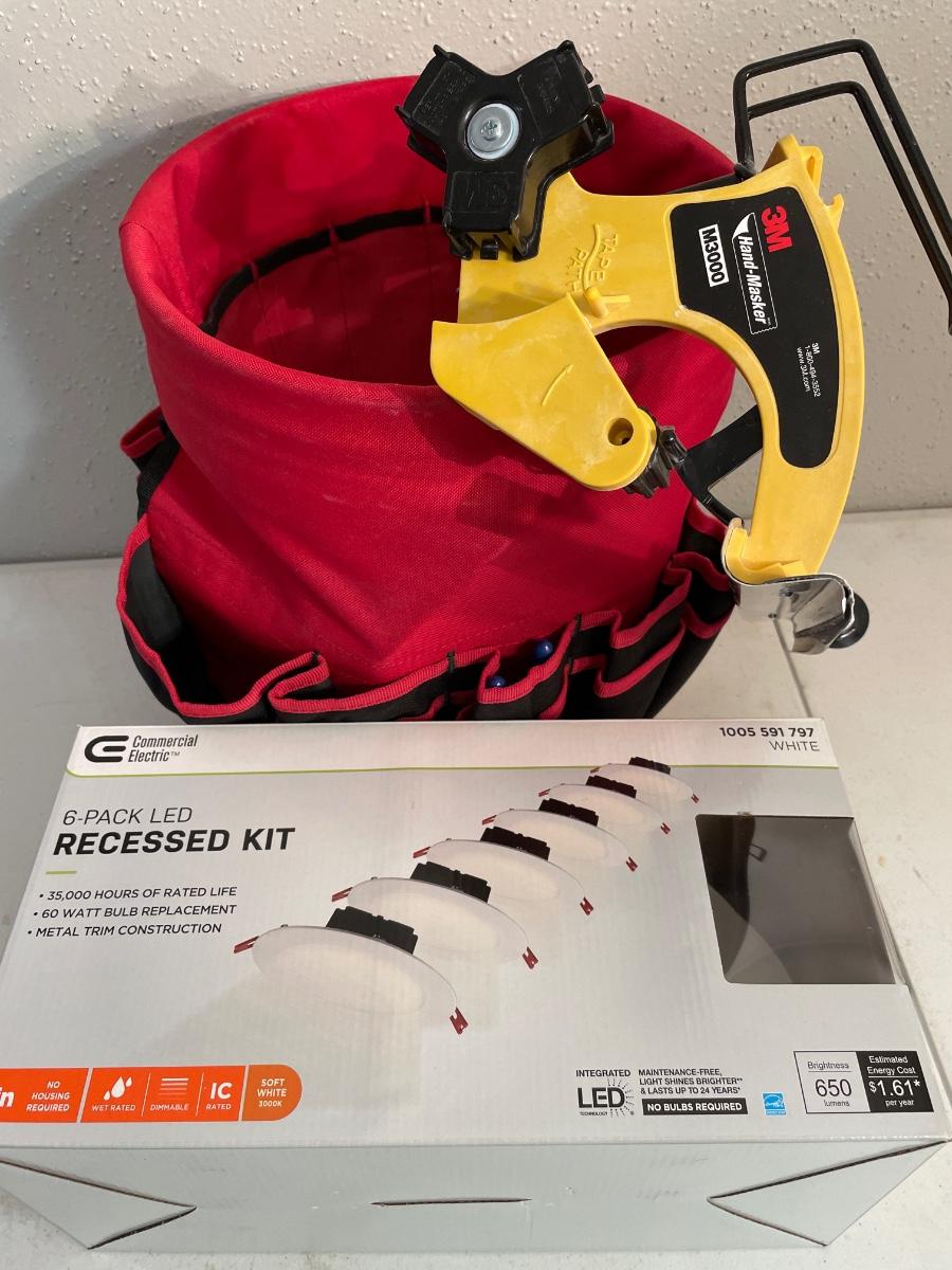 Tool bucket with tools, includes a six pack, LED, recessed, kit lighting, and a 3M hand master