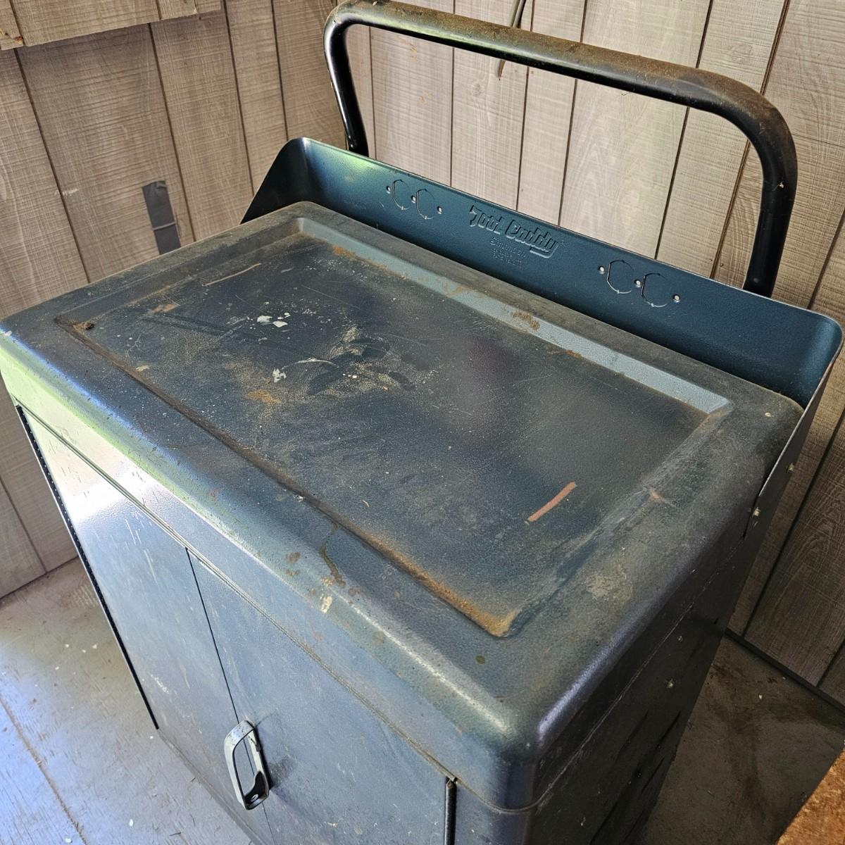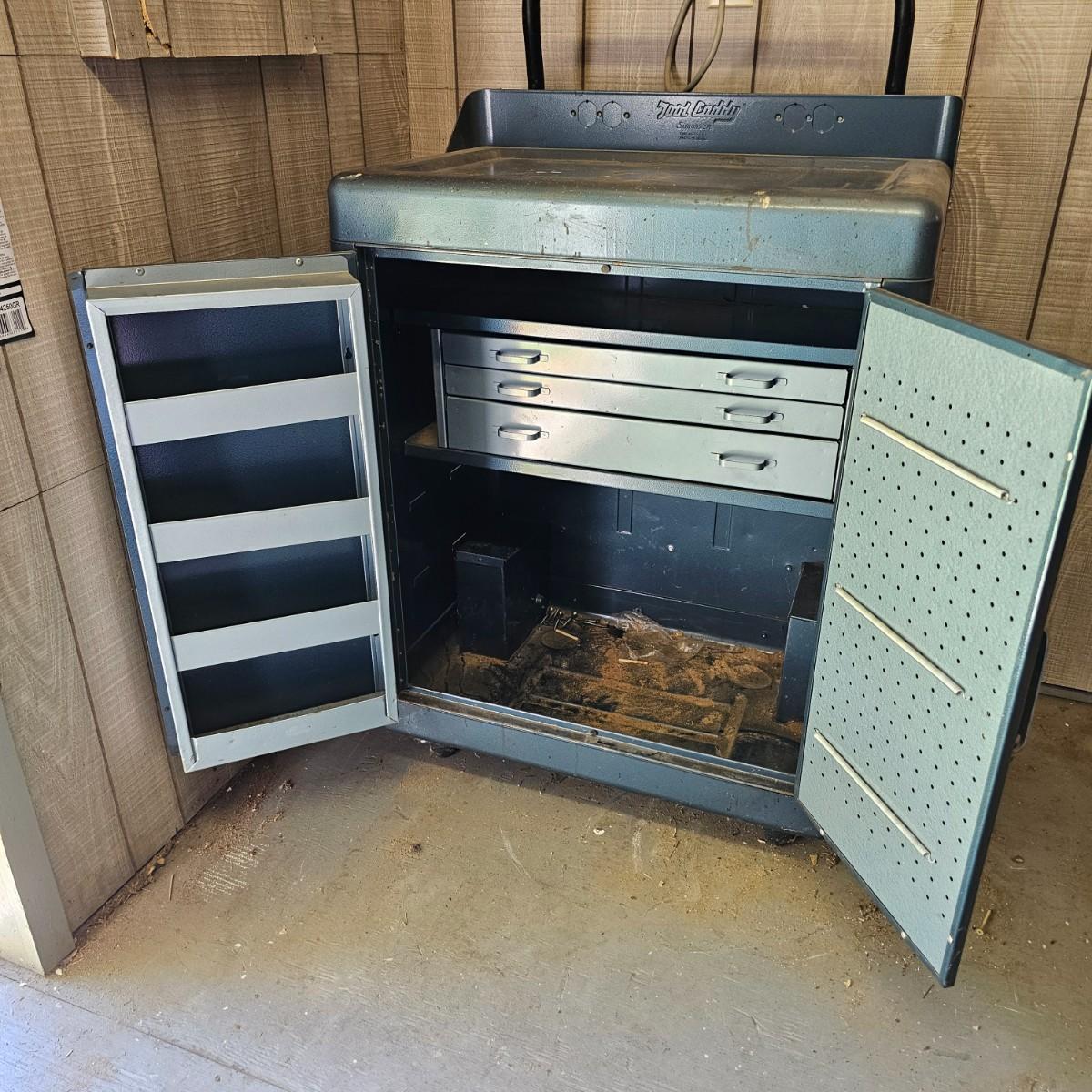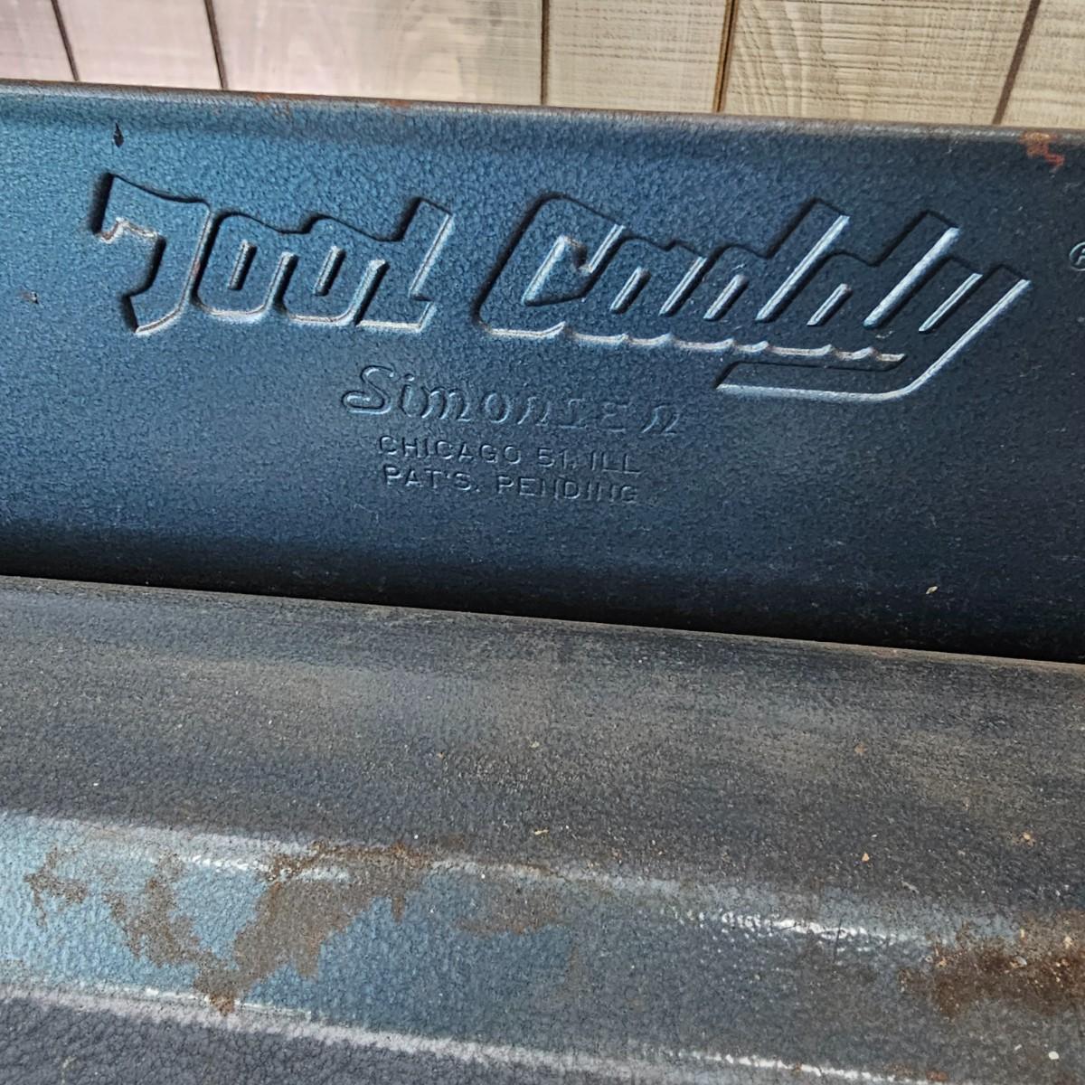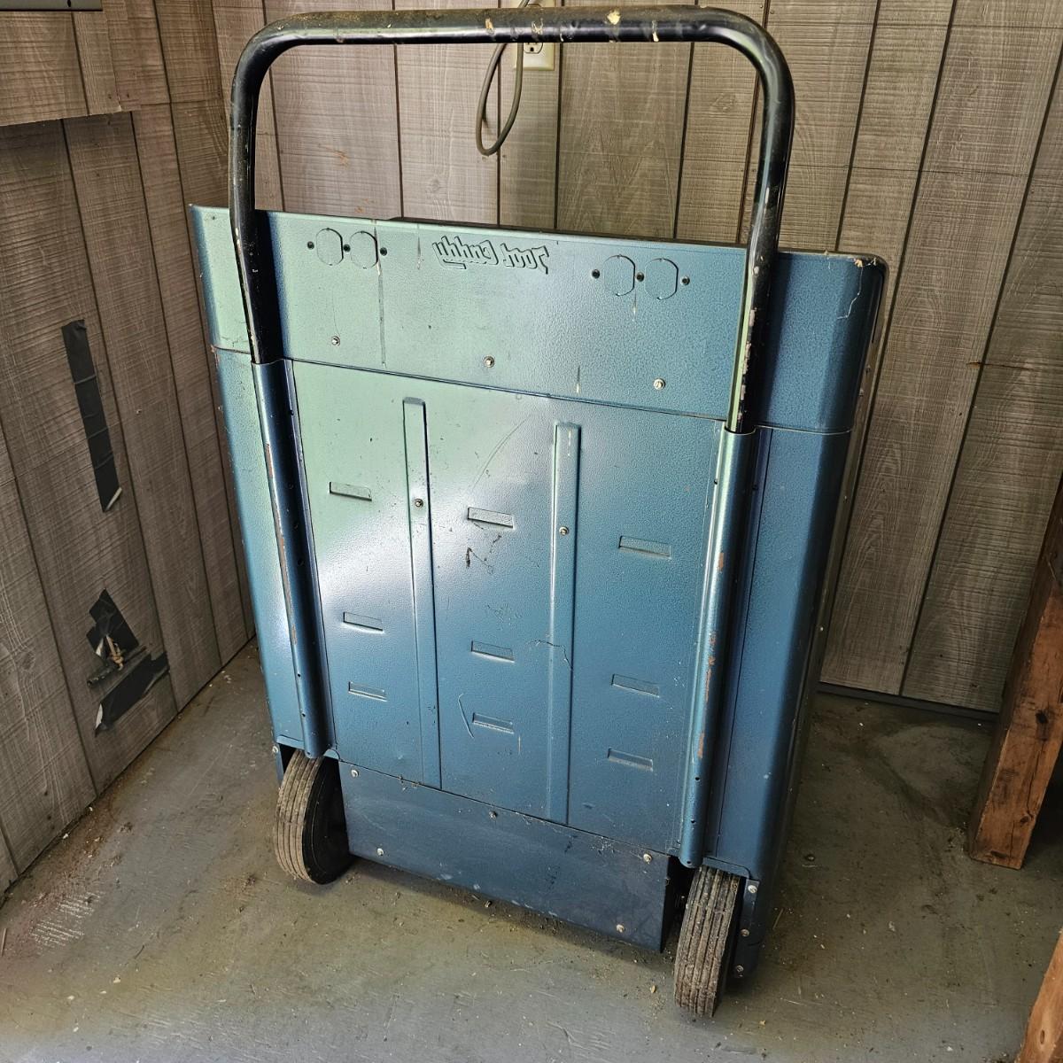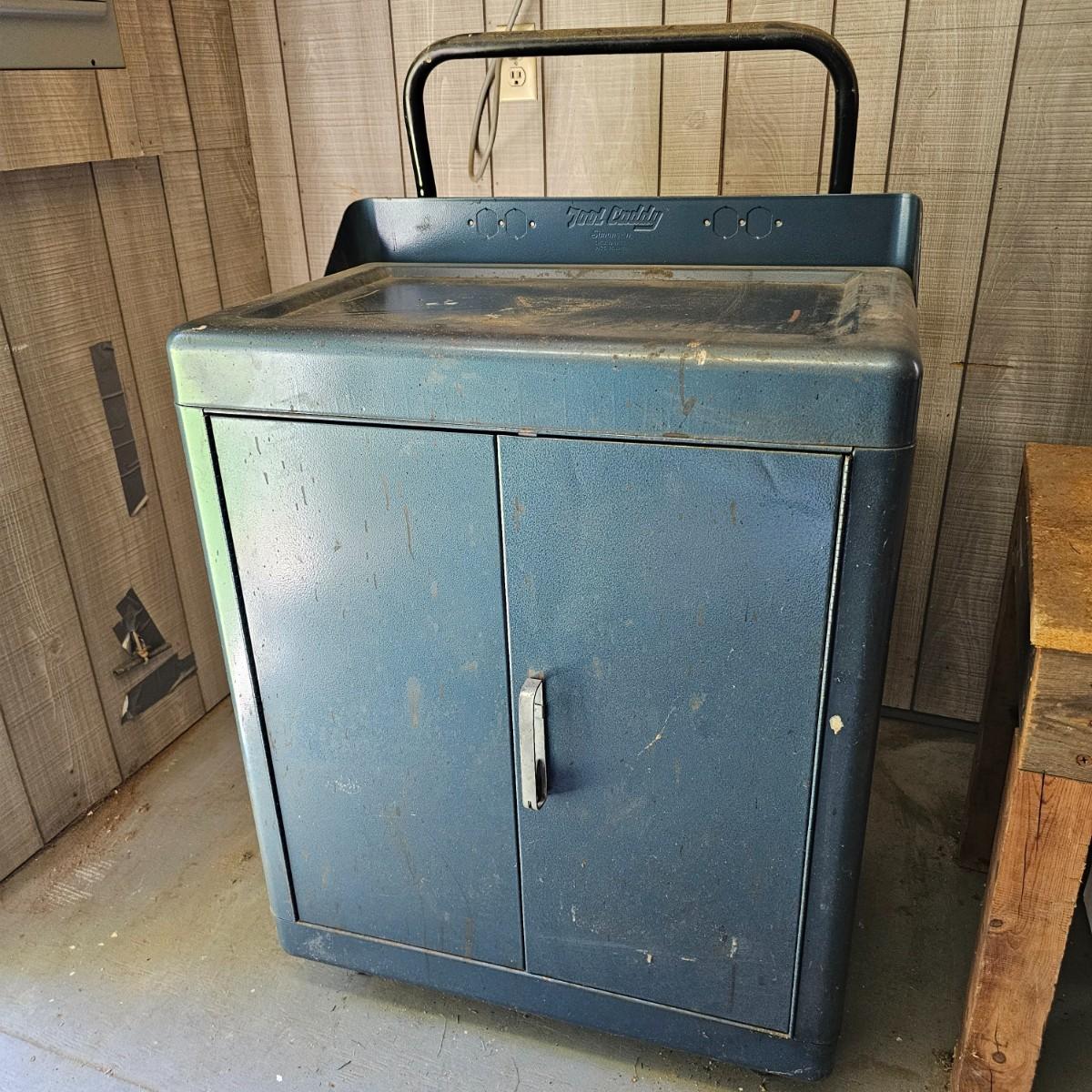 All steel Simonsen tool caddy and work top, this unit has storage and mobility to boot. Large handle on back allows for rolling via hard rubber wheels. Just tilt back and go. Also has two doors on front, one unlocks both sides and inside each door has shelf/tool holders. Large storage in bottom, and a three drawer tool box up top. Unit measures 29" x 22" x 46"H, has some scuff and wear marks on the outside. See photos for details. Local pickup only.