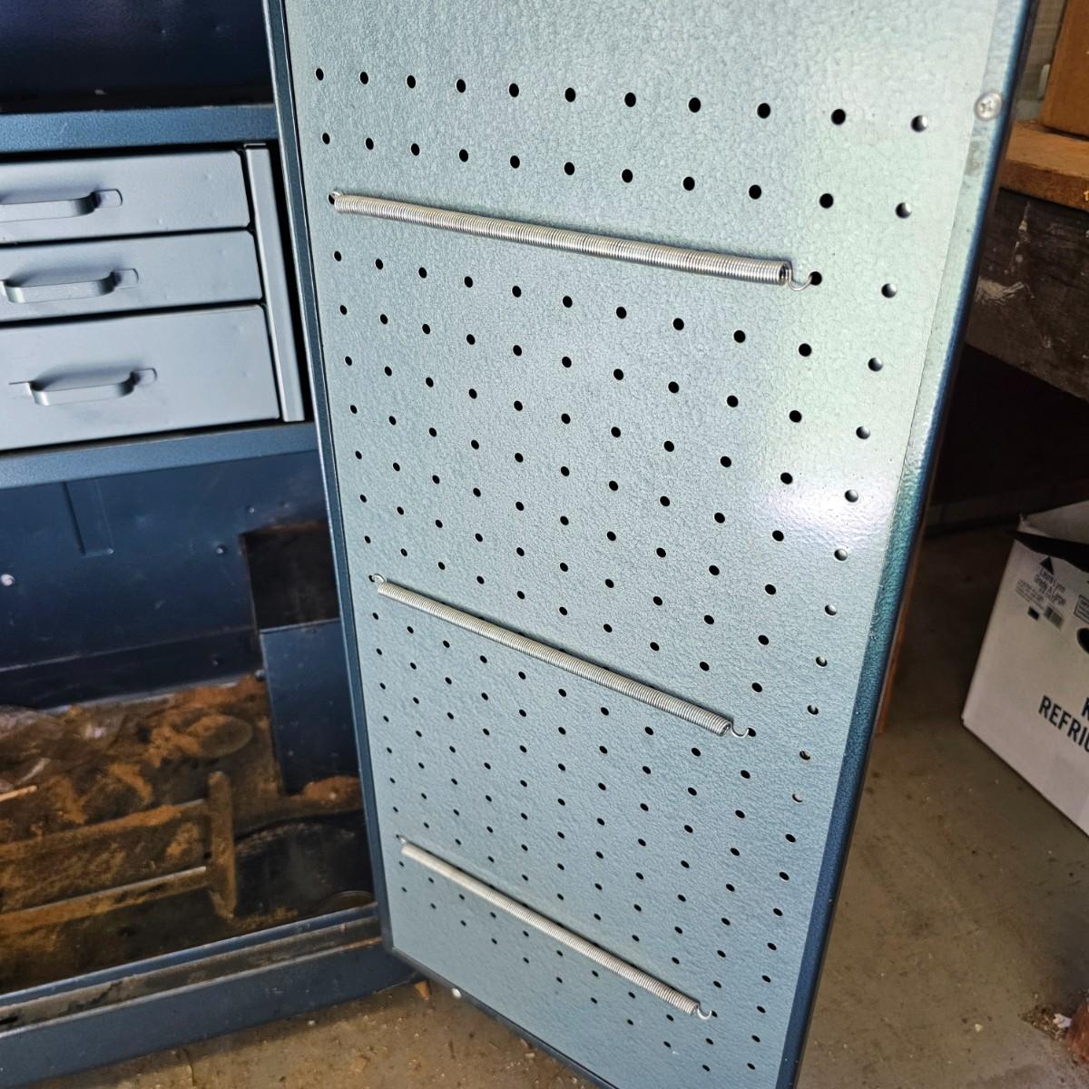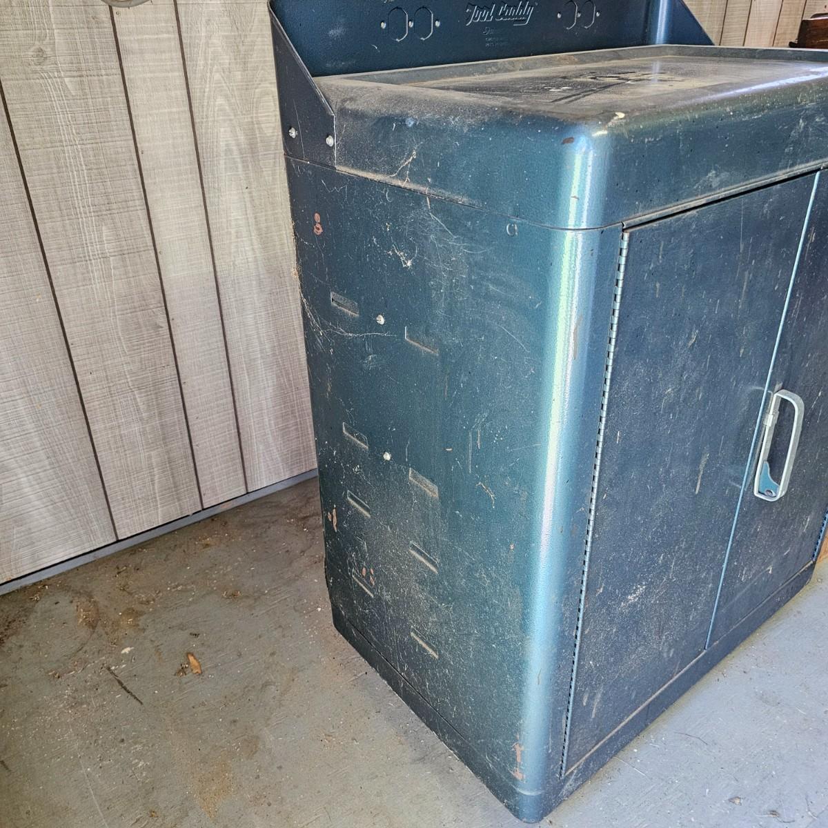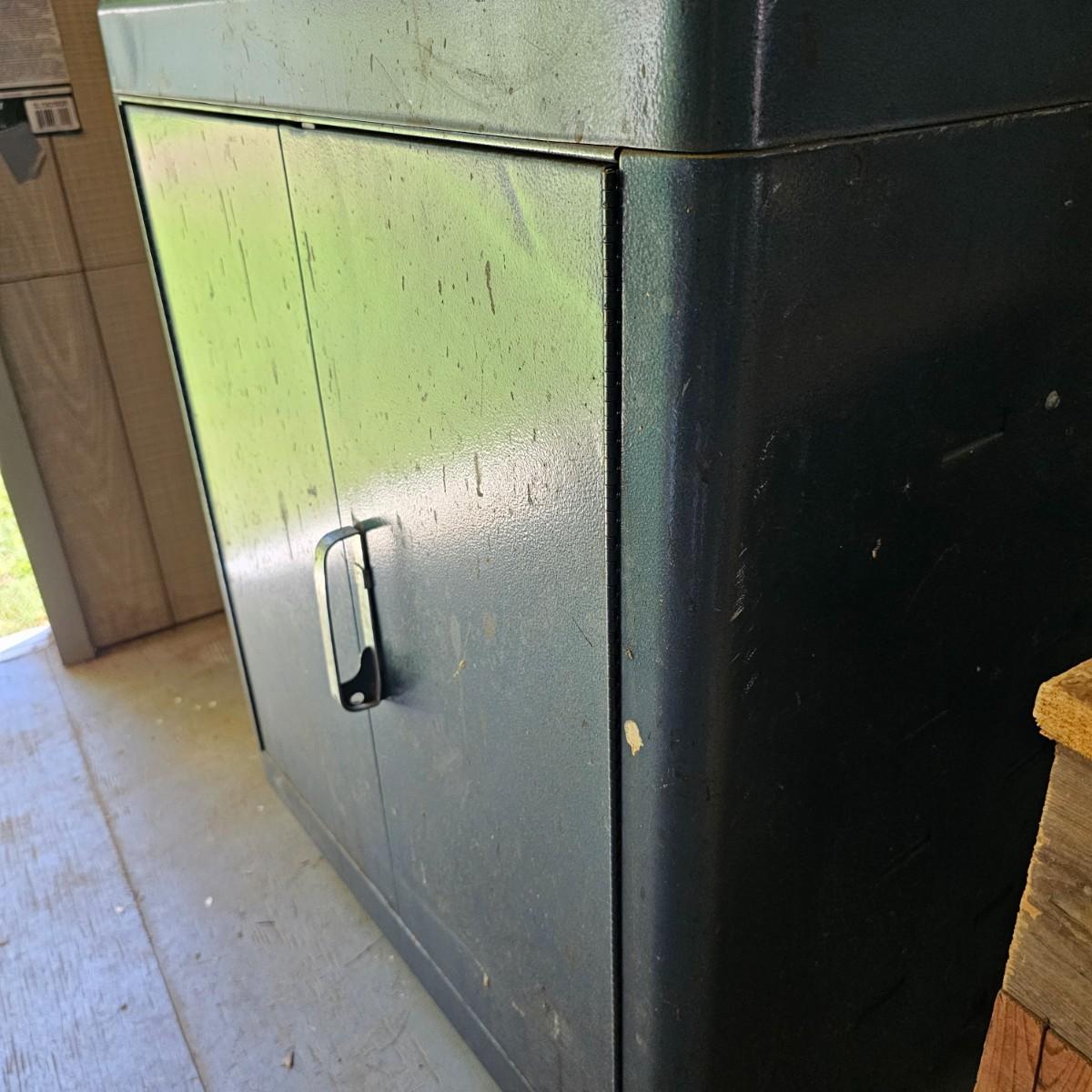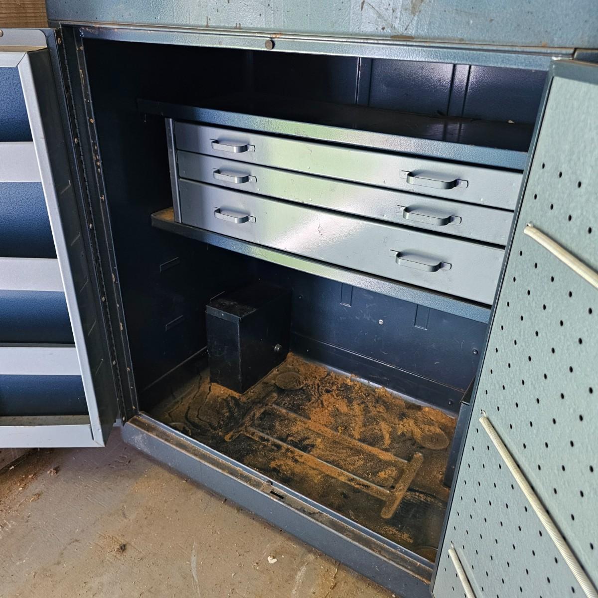 All steel Simonsen tool caddy and work top, this unit has storage and mobility to boot. Large handle on back allows for rolling via hard rubber wheels. Just tilt back and go. Also has two doors on front, one unlocks both sides and inside each door has shelf/tool holders. Large storage in bottom, and a three drawer tool box up top. Unit measures 29" x 22" x 46"H, has some scuff and wear marks on the outside. See photos for details. Local pickup only.