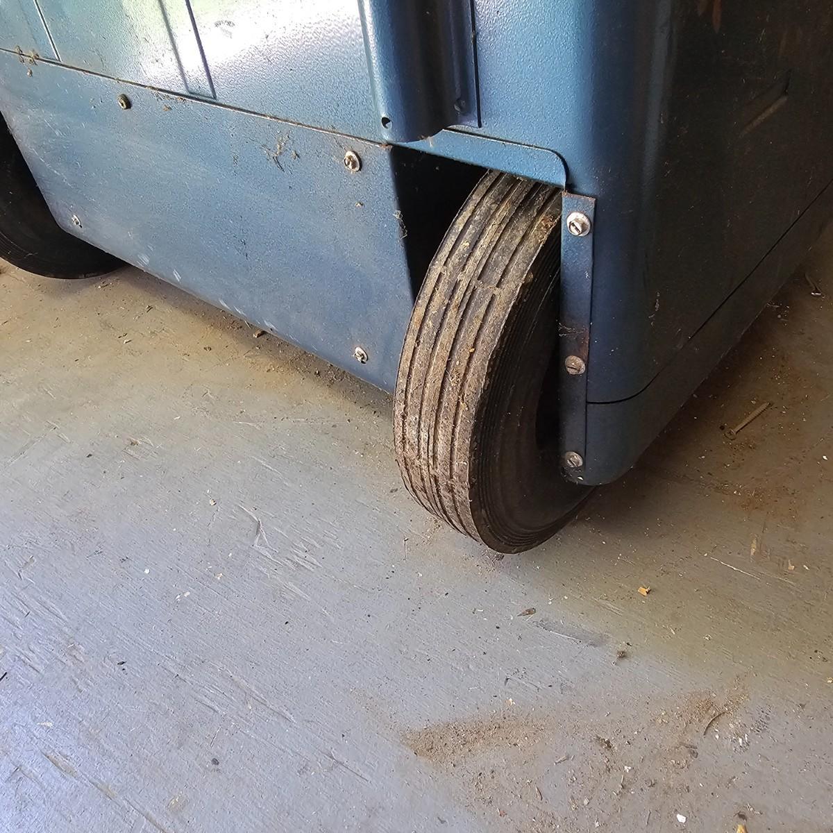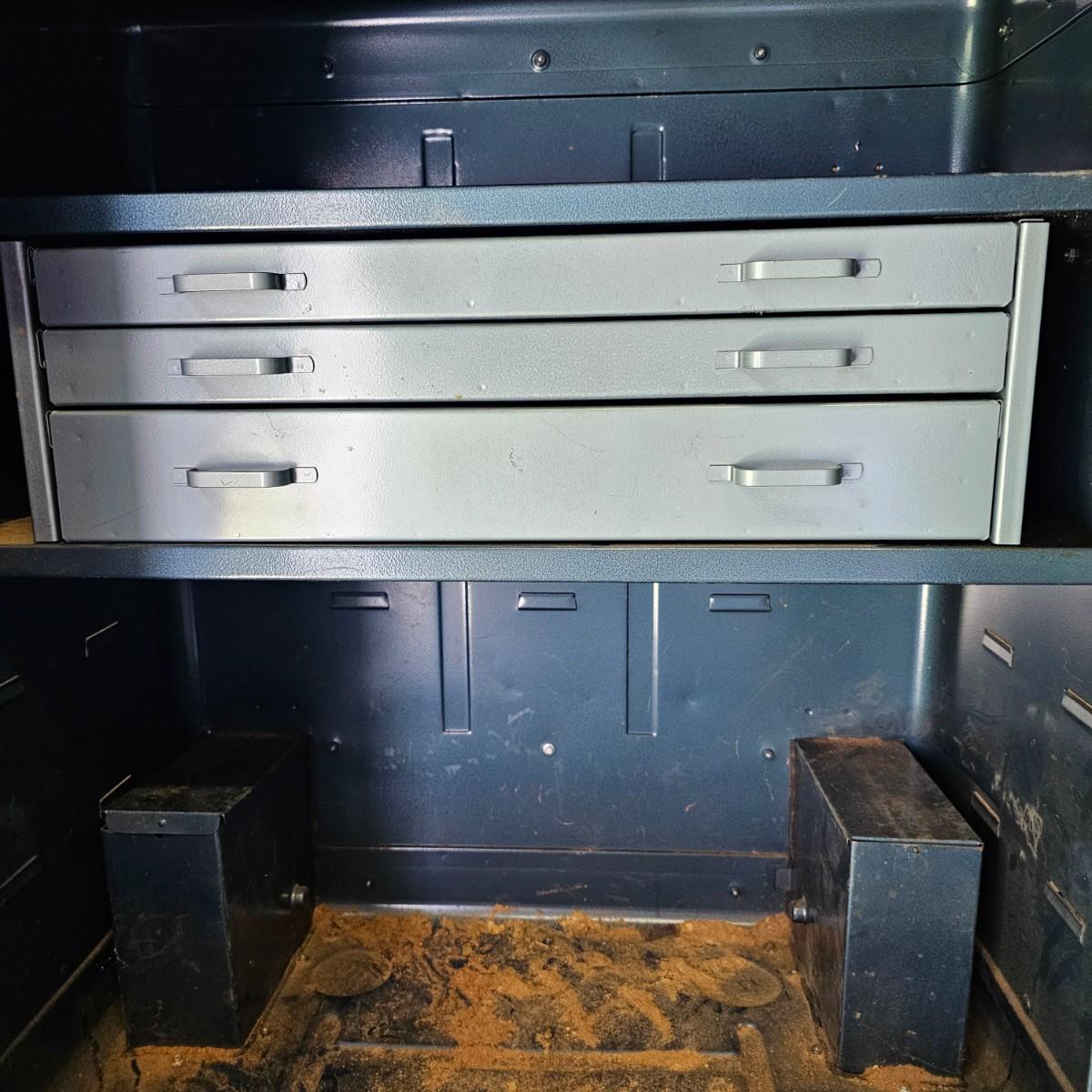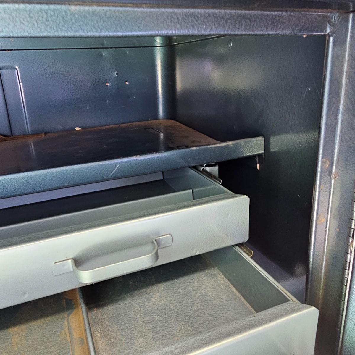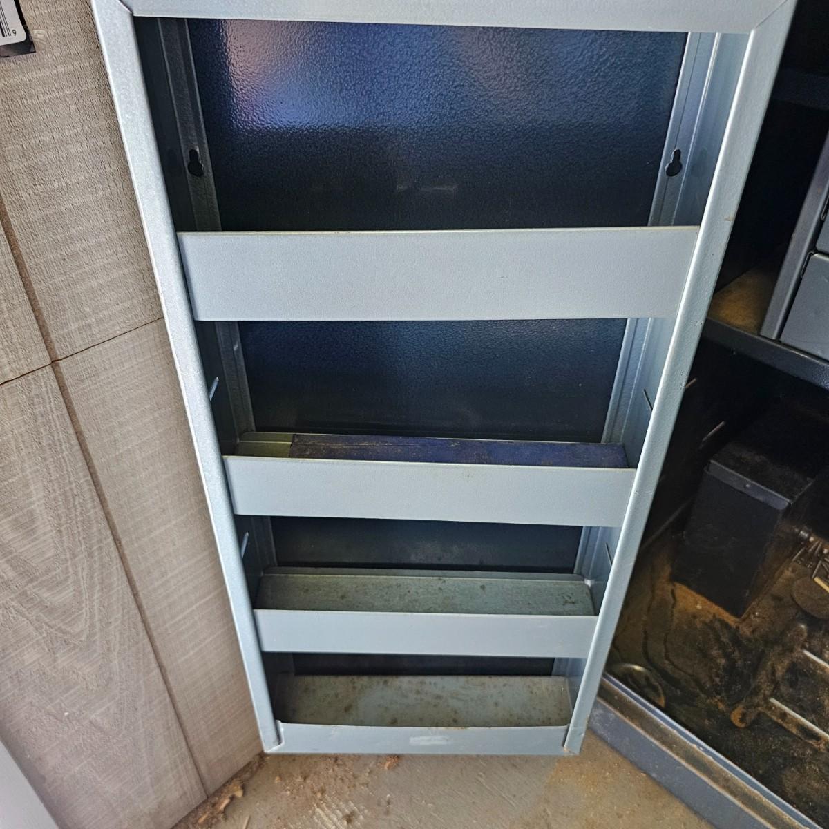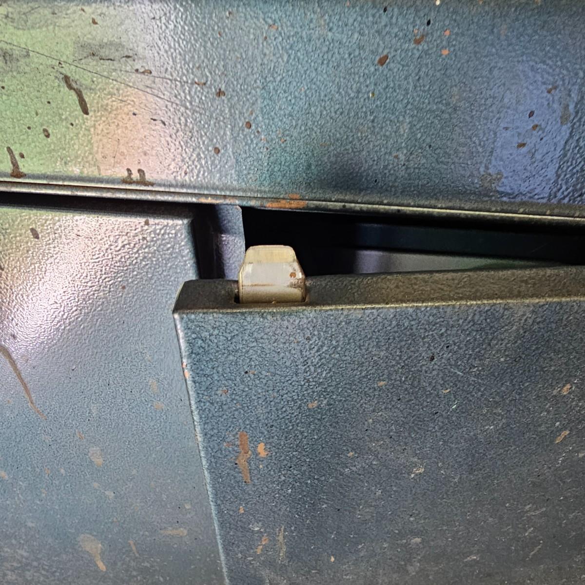 All steel Simonsen tool caddy and work top, this unit has storage and mobility to boot. Large handle on back allows for rolling via hard rubber wheels. Just tilt back and go. Also has two doors on front, one unlocks both sides and inside each door has shelf/tool holders. Large storage in bottom, and a three drawer tool box up top. Unit measures 29" x 22" x 46"H, has some scuff and wear marks on the outside. See photos for details. Local pickup only.