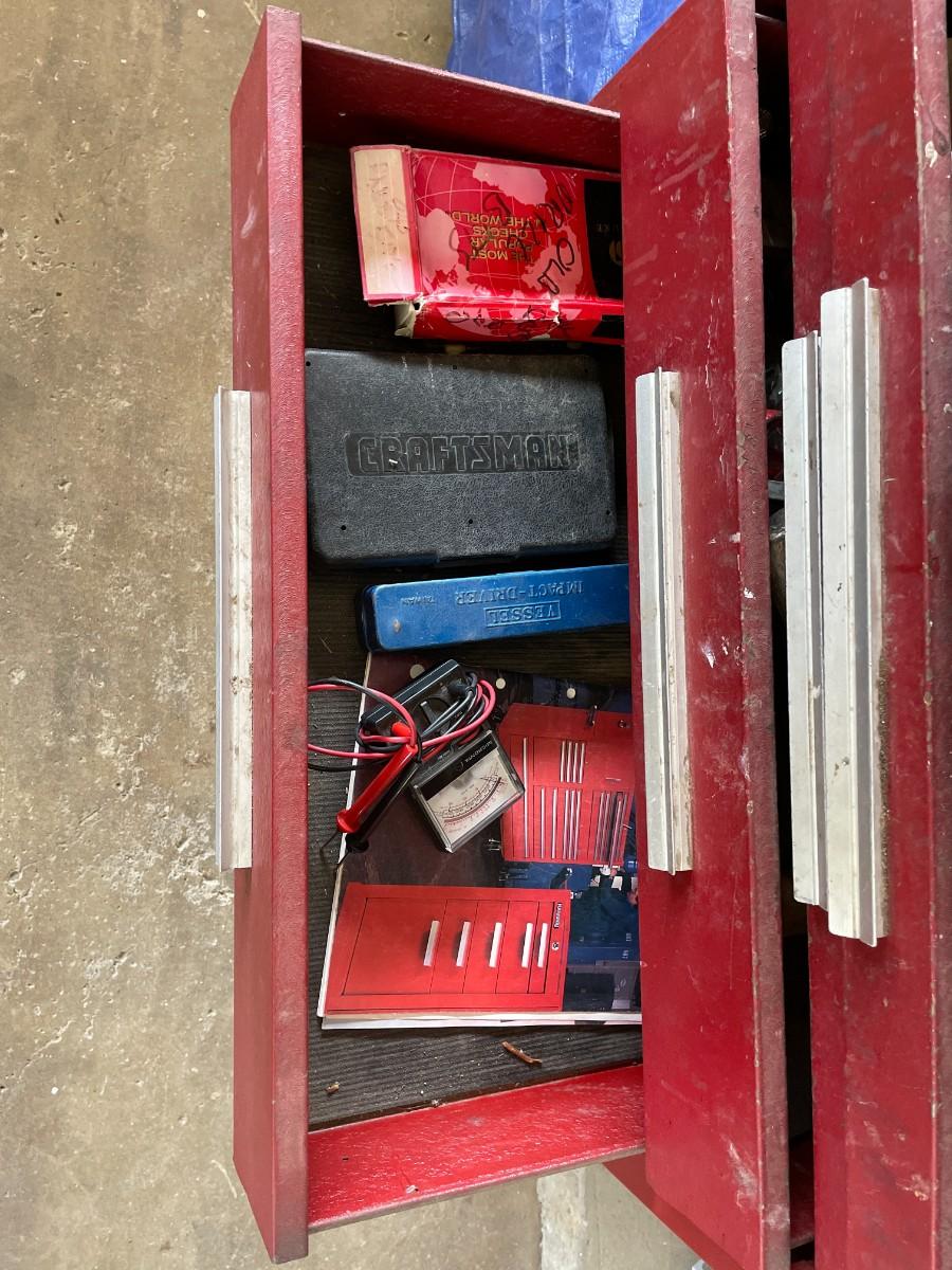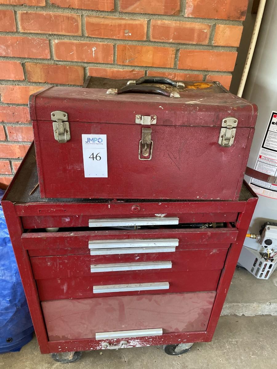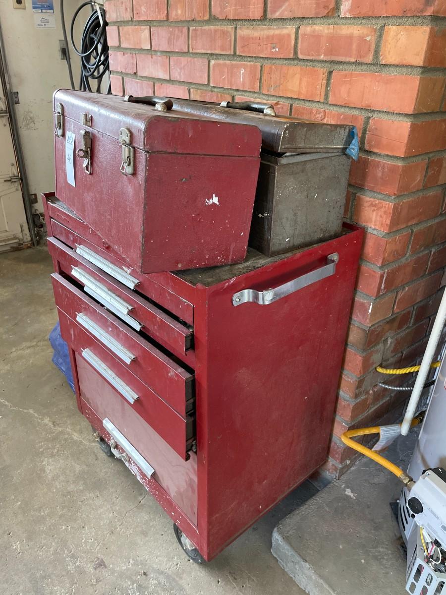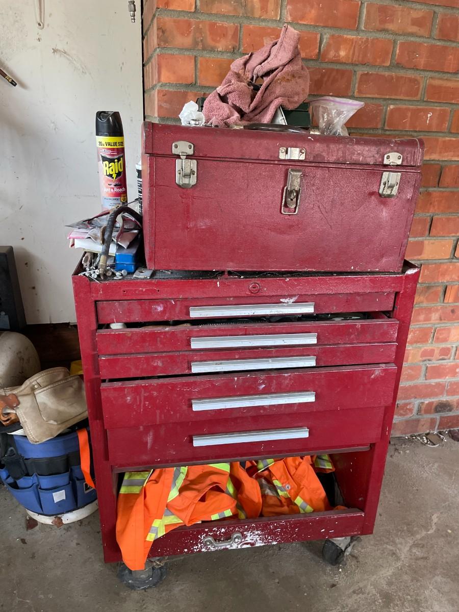 Tool Cabinet with 5 drawers and large bottom cabinet, on casters and 2 tool chest. Contents included. Very heavy - bring help.