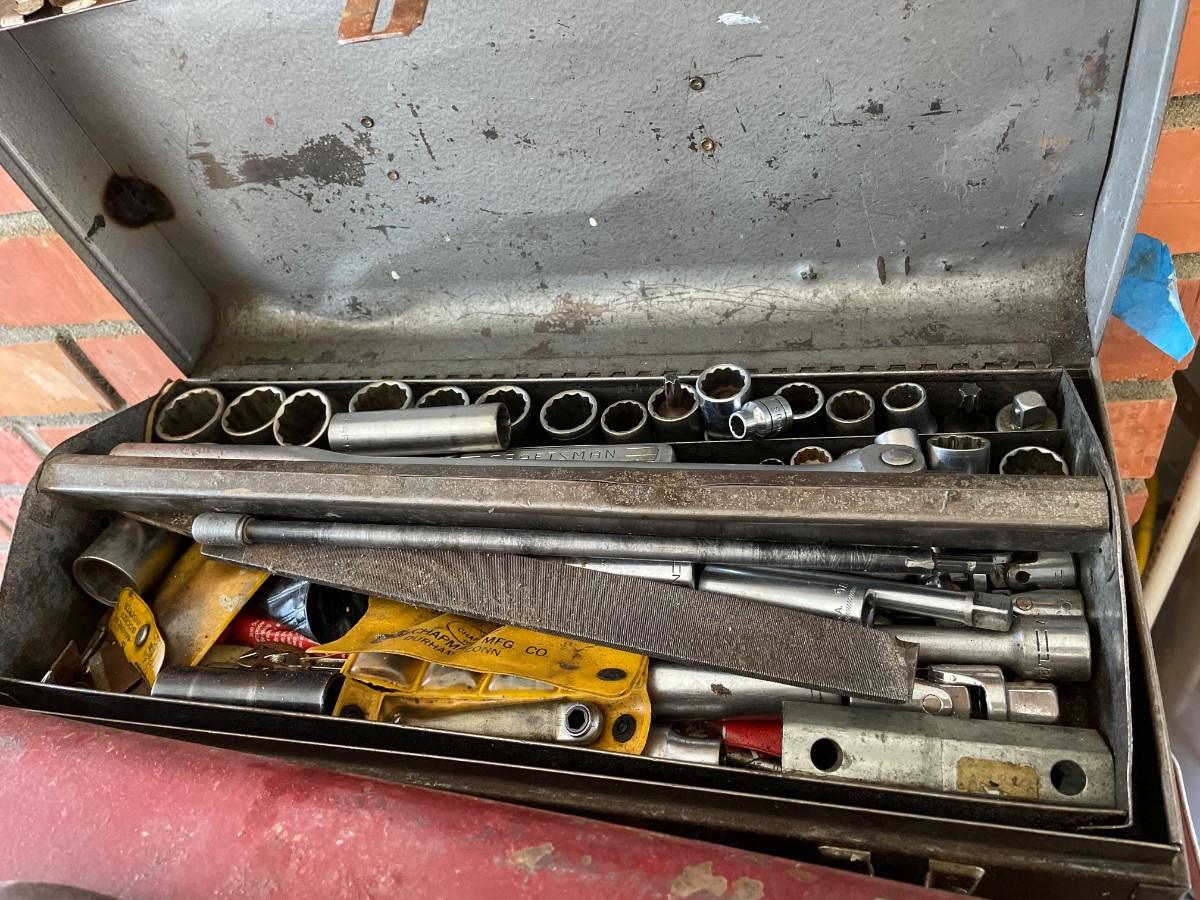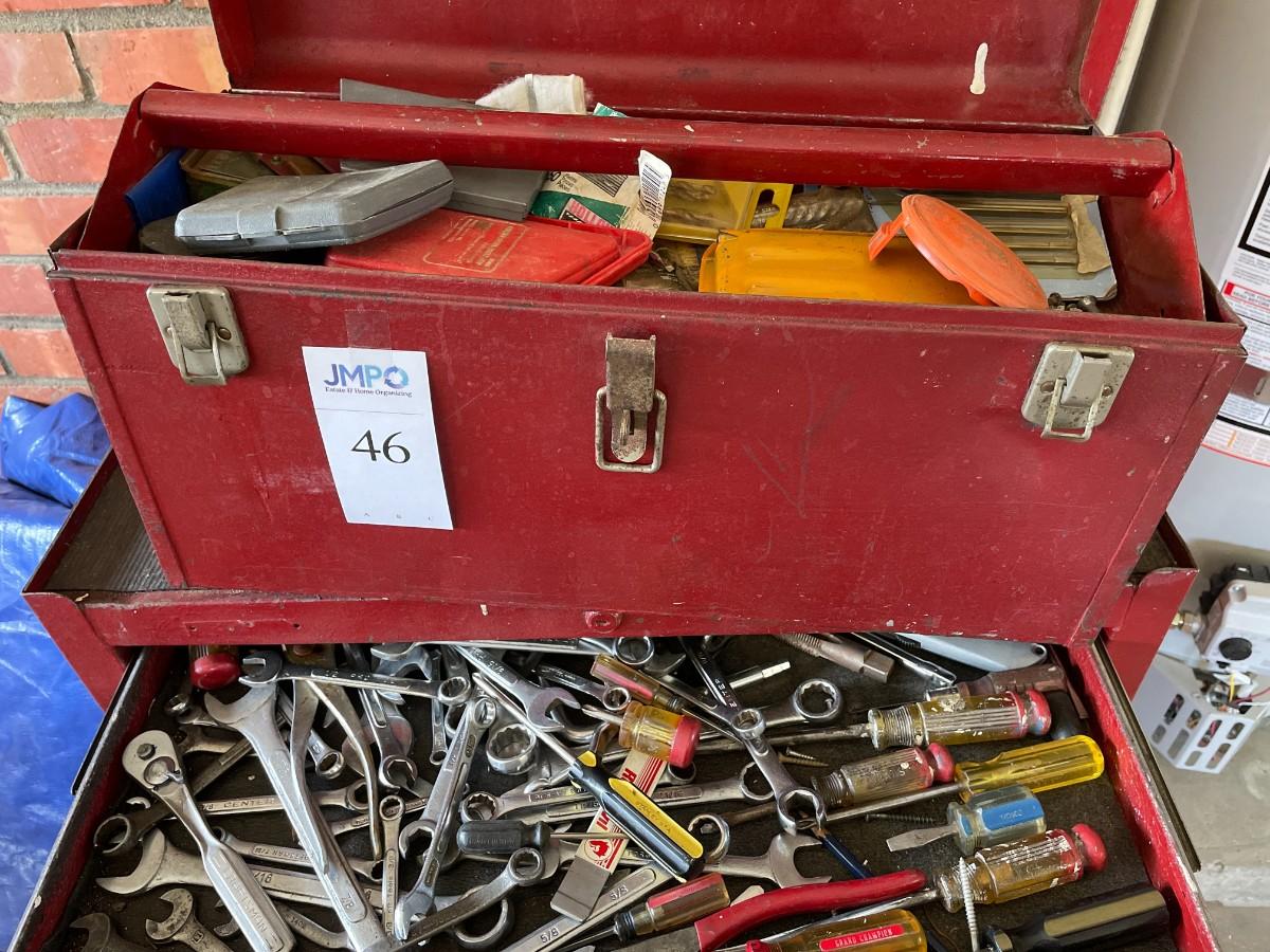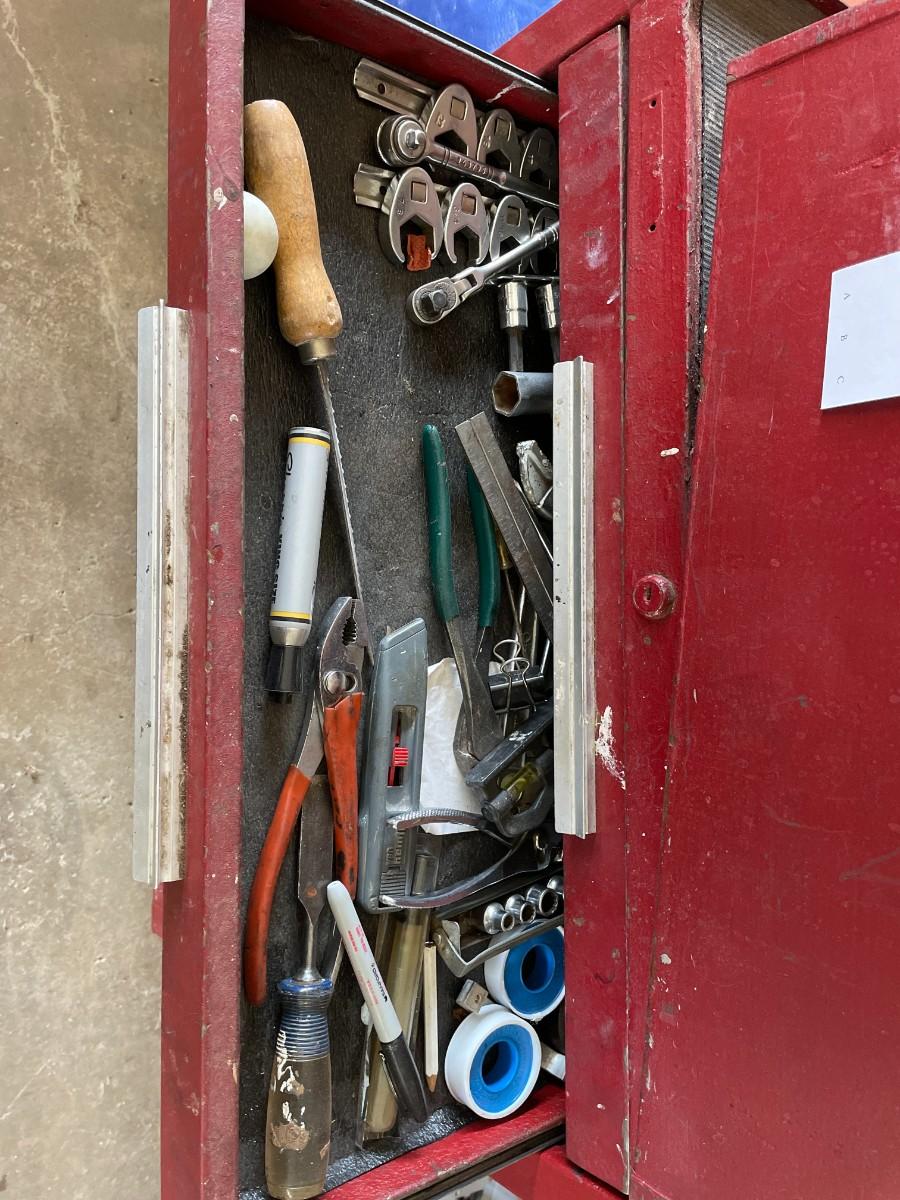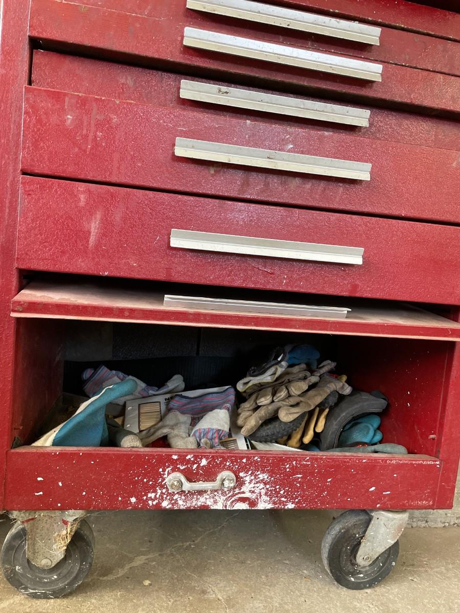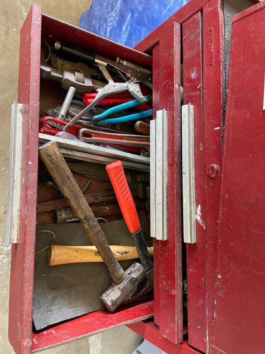 Tool Cabinet with 5 drawers and large bottom cabinet, on casters and 2 tool chest. Contents included. Very heavy - bring help.