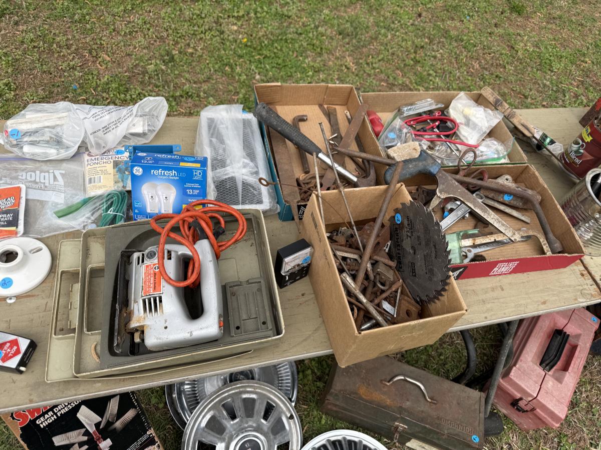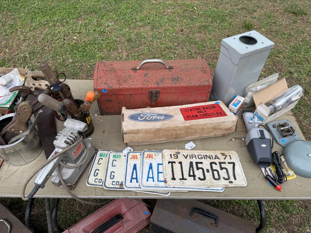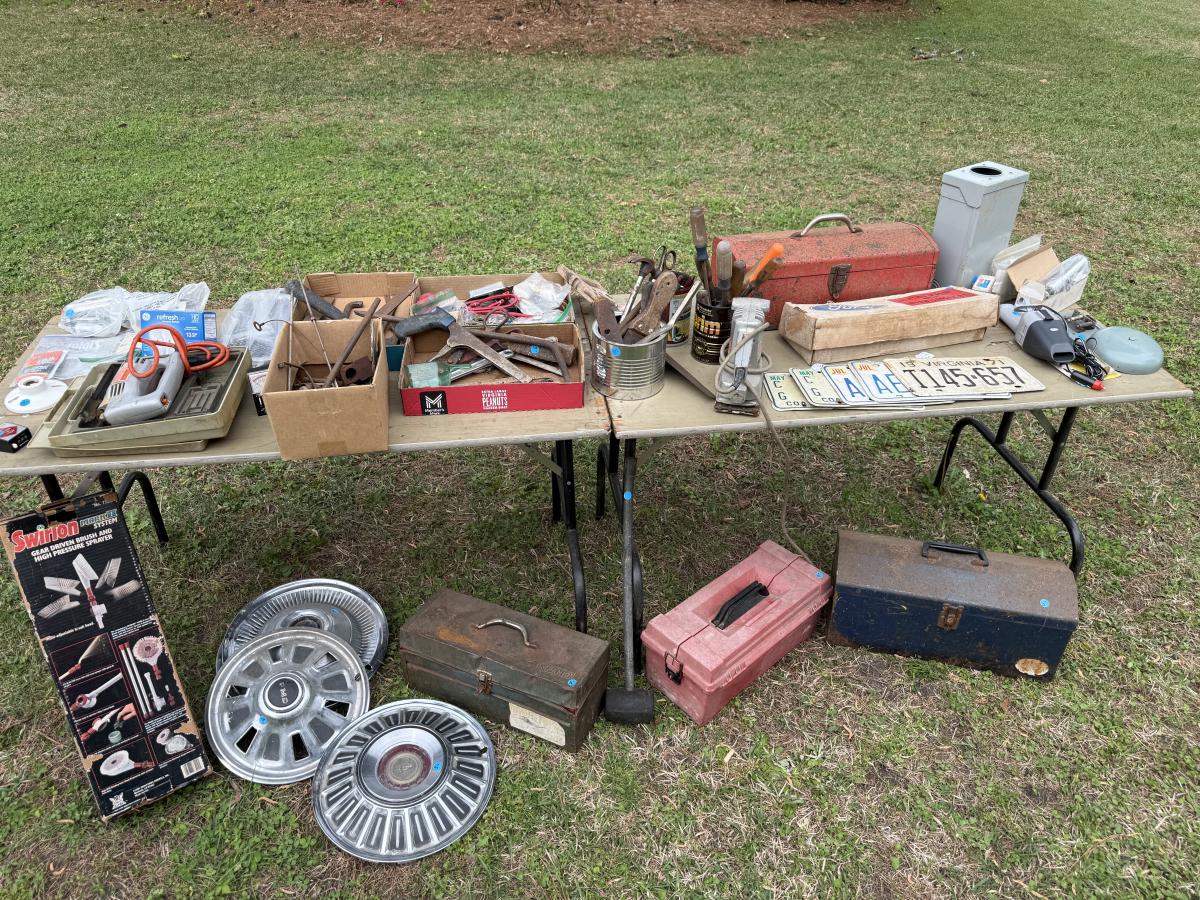 Hand & power tools, tool boxes, vintage hubcaps, license plates, etc