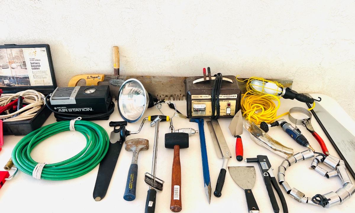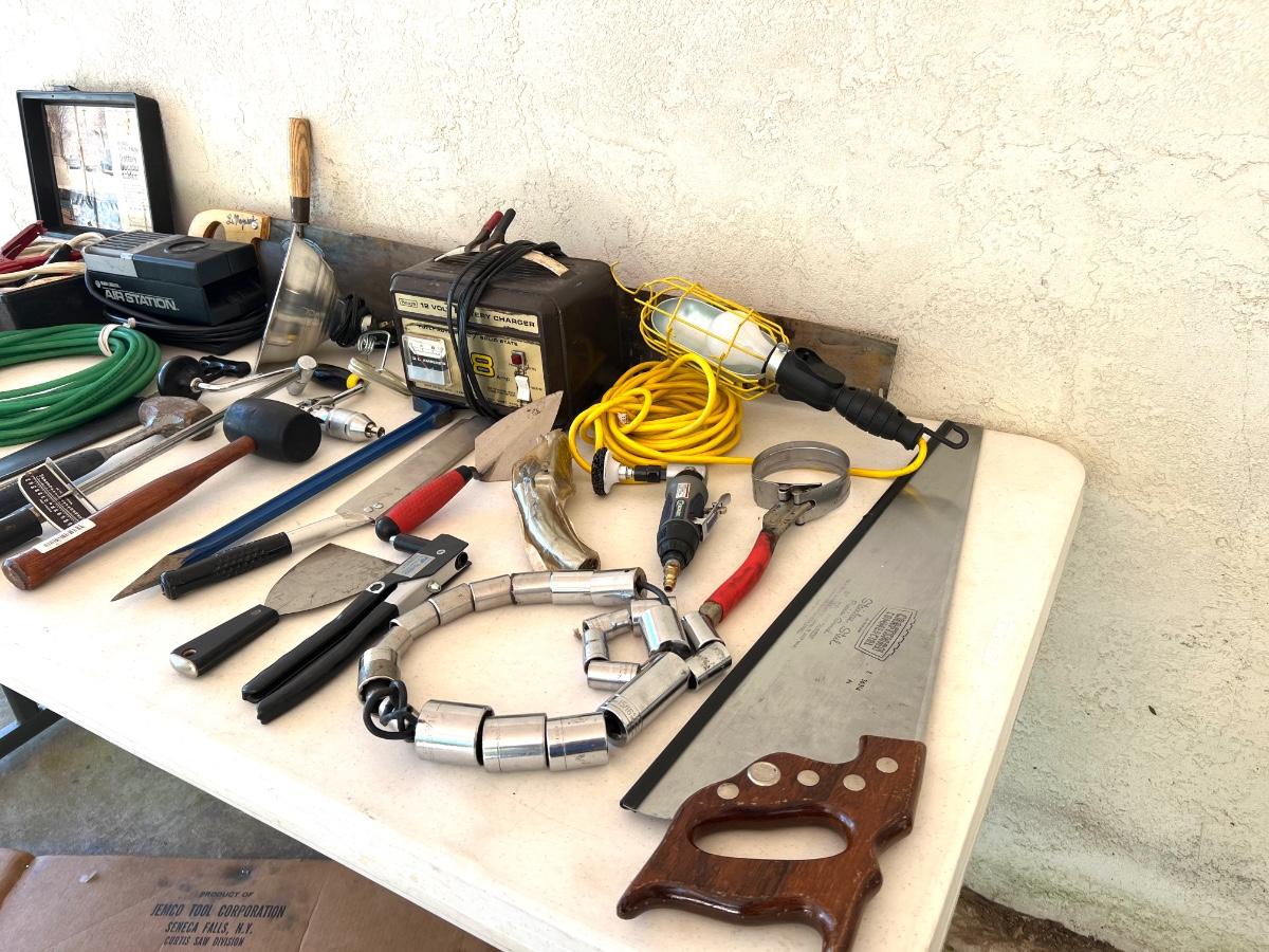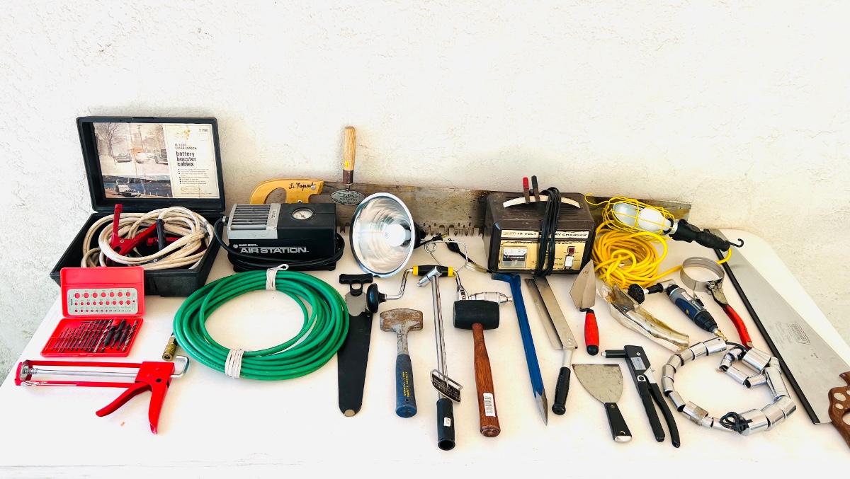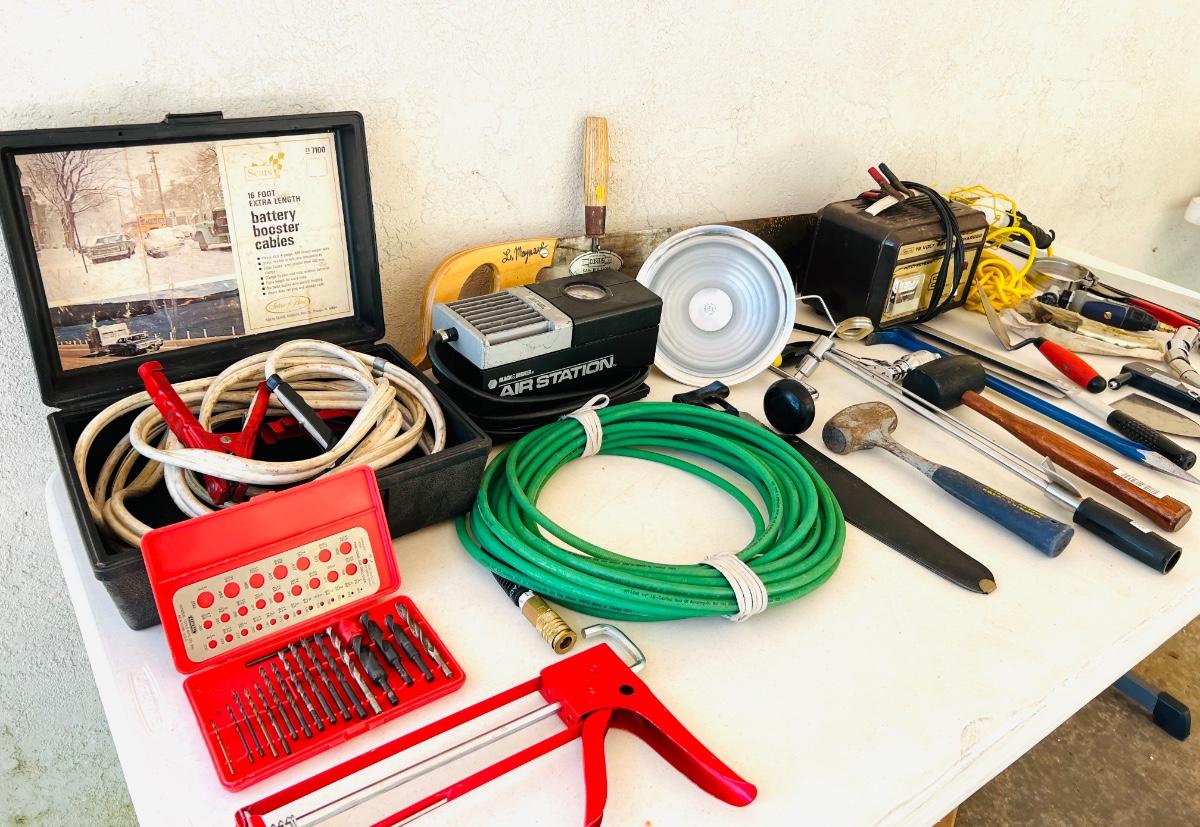 Miscellaneous Tool Lot 2. Everything you see on the tables. Air compressor tested and works. Battery charger not tested.