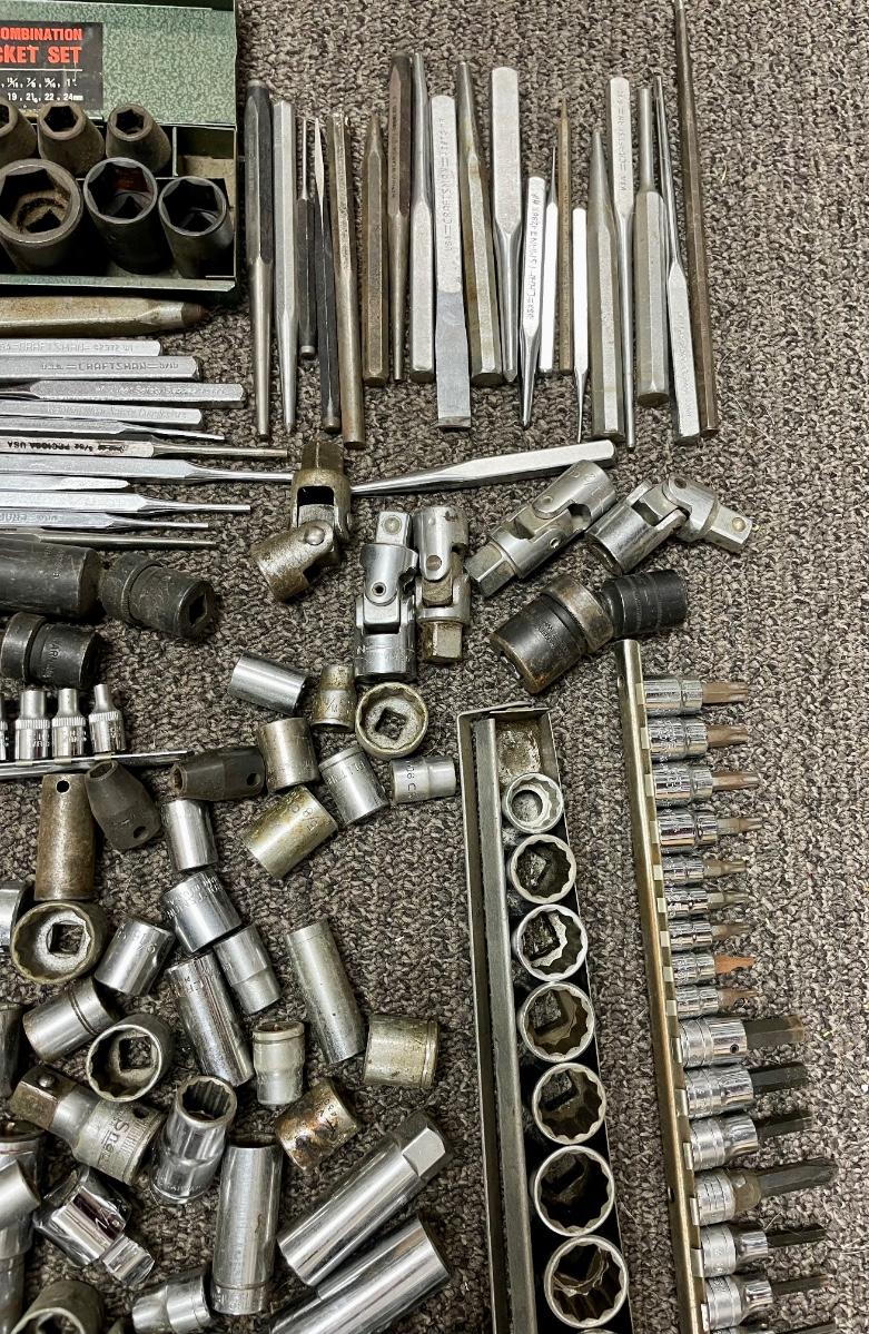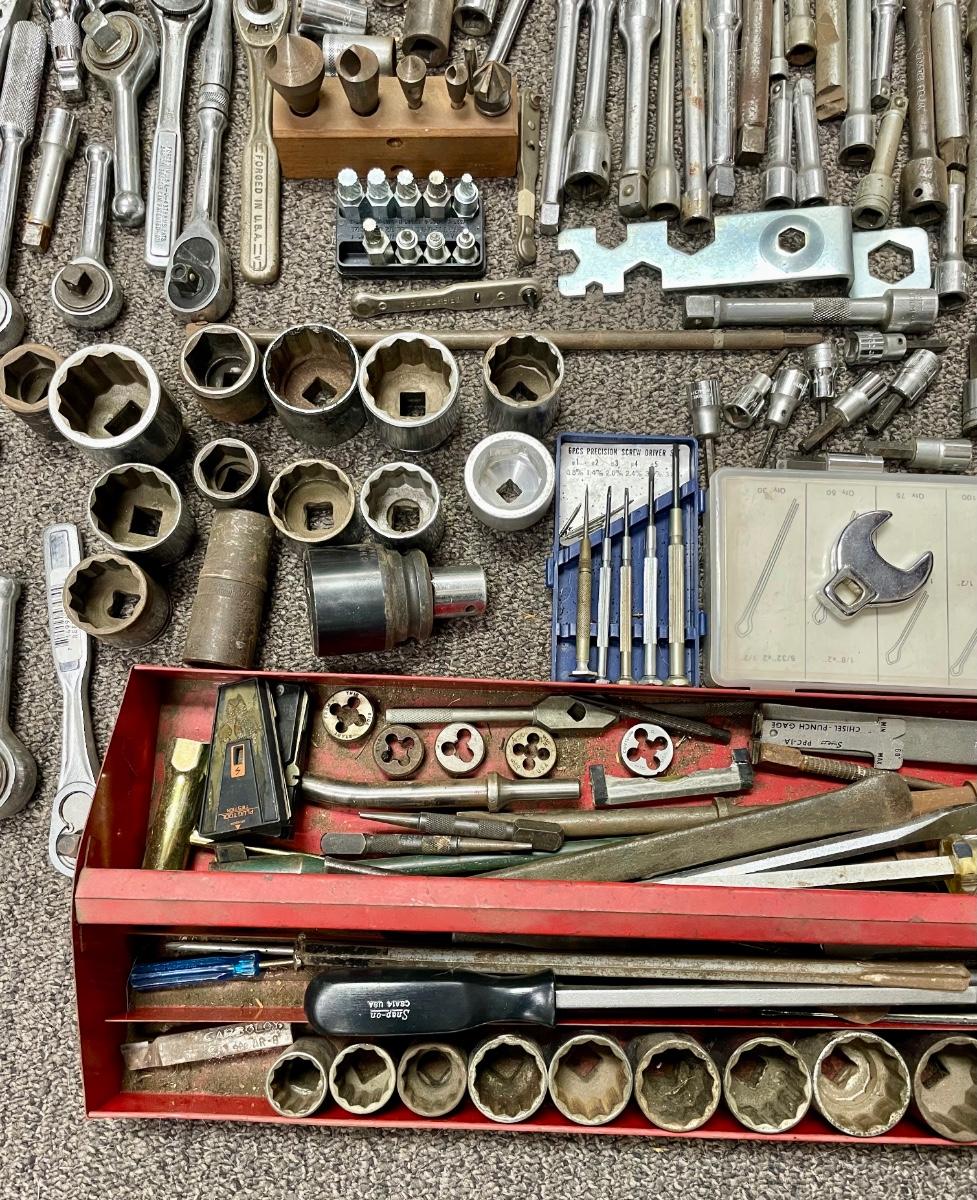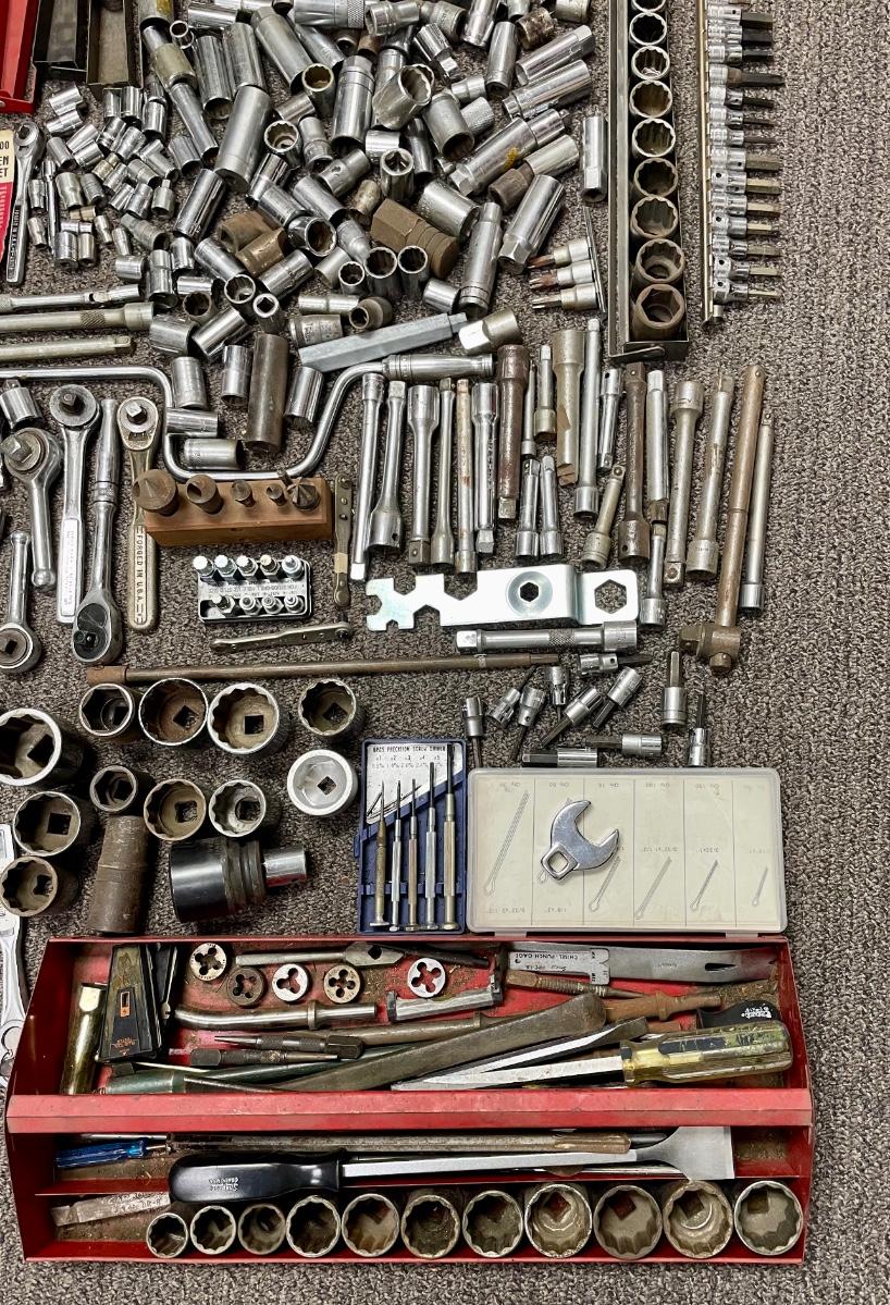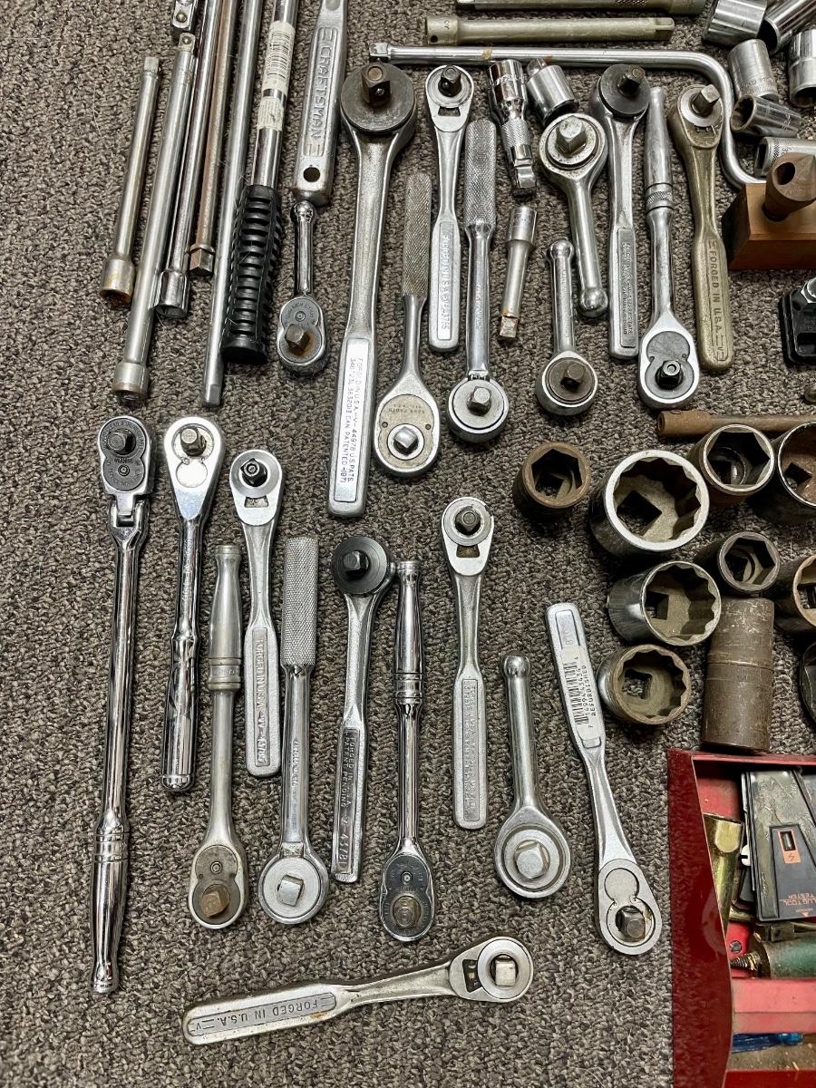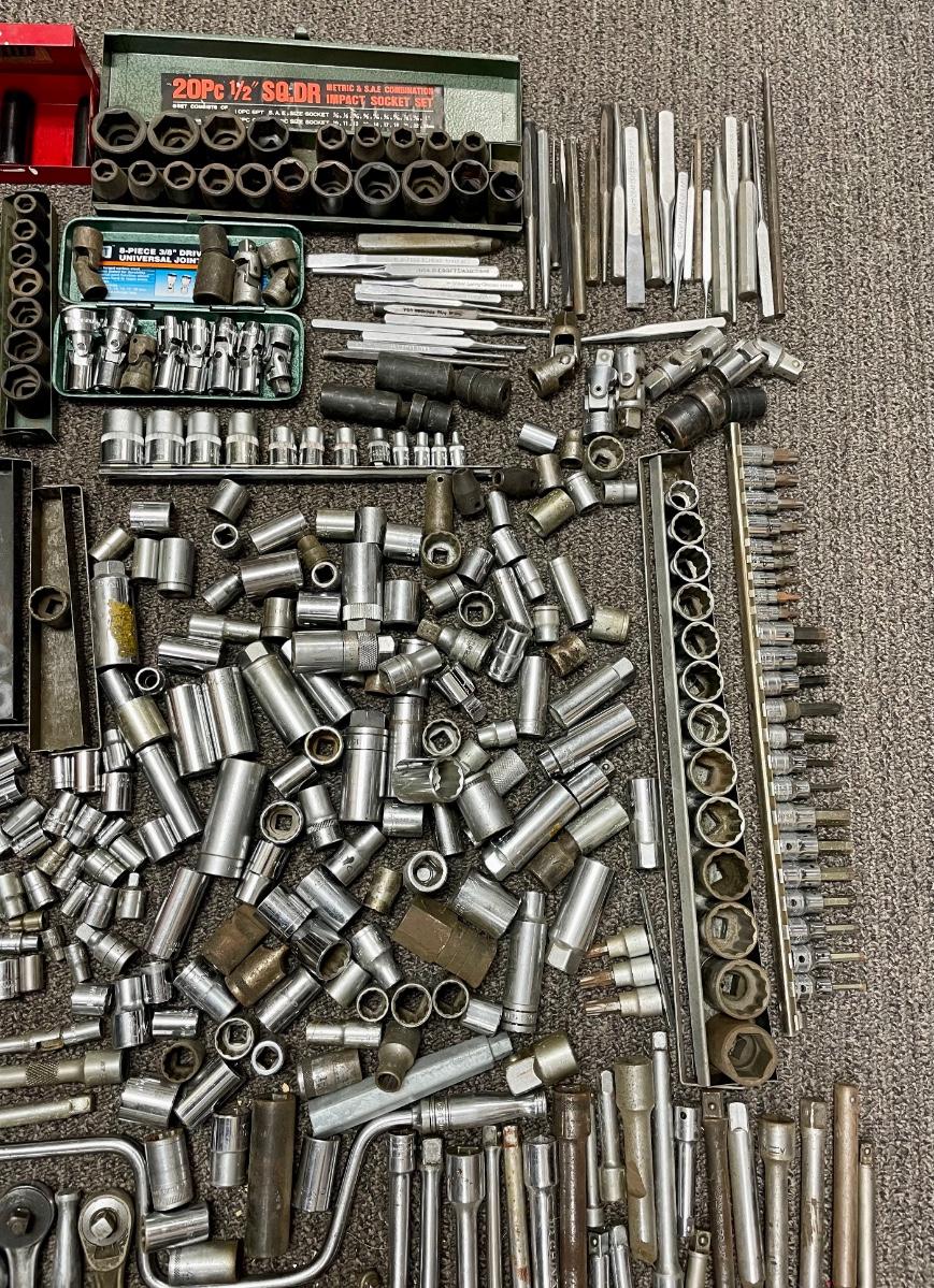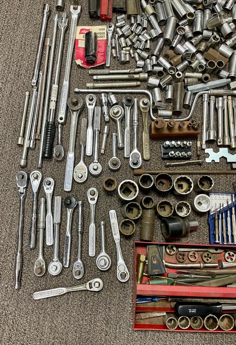 This lot primarily consists of sockets and socket wrenches, but many other items are included, look closely at the photos for more details. Hundreds of items.