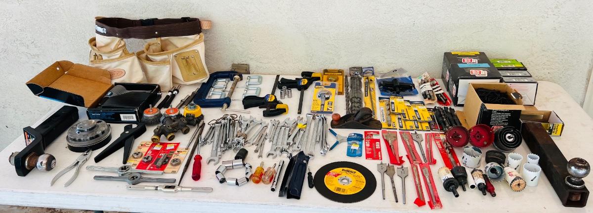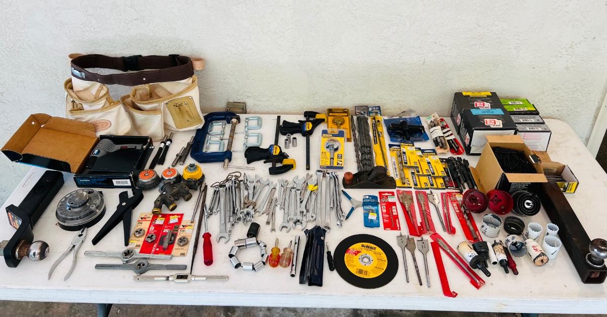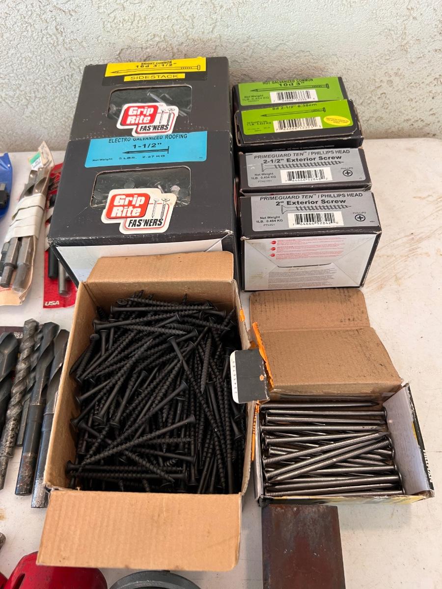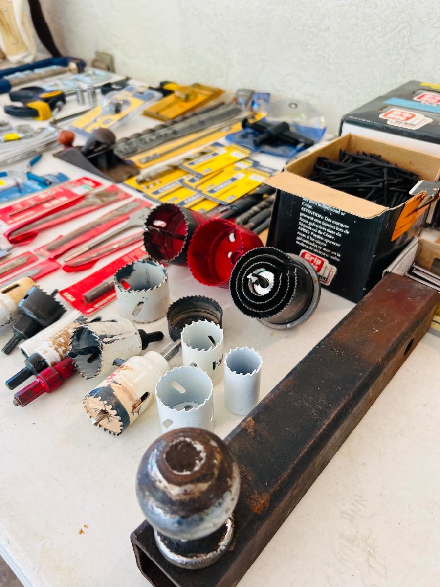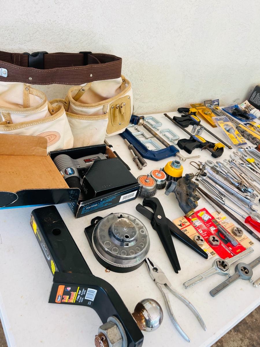 Tool Lot #4. This tool lot includes hitches, various nails/screws (some are new), and so much more. See pictures. Everything is being sold as a lot except the table.