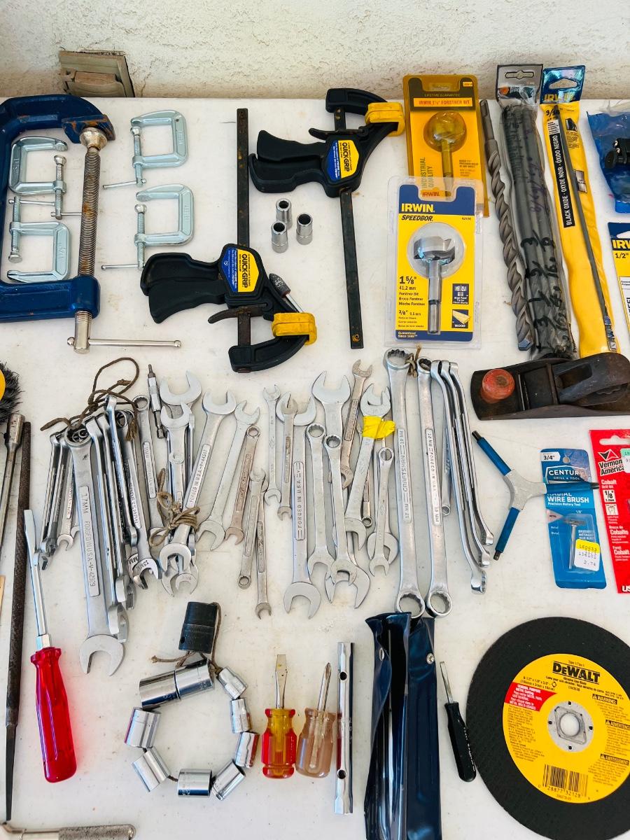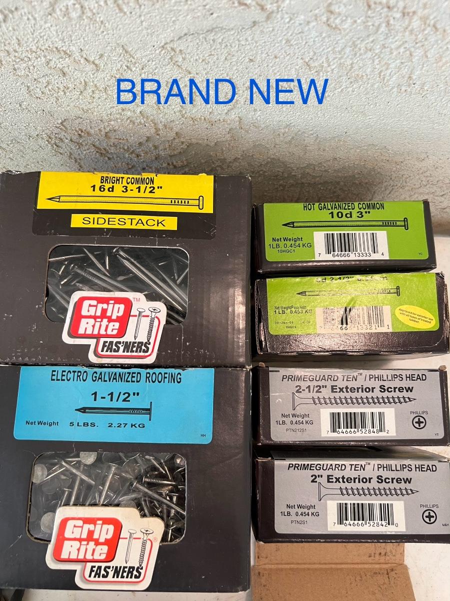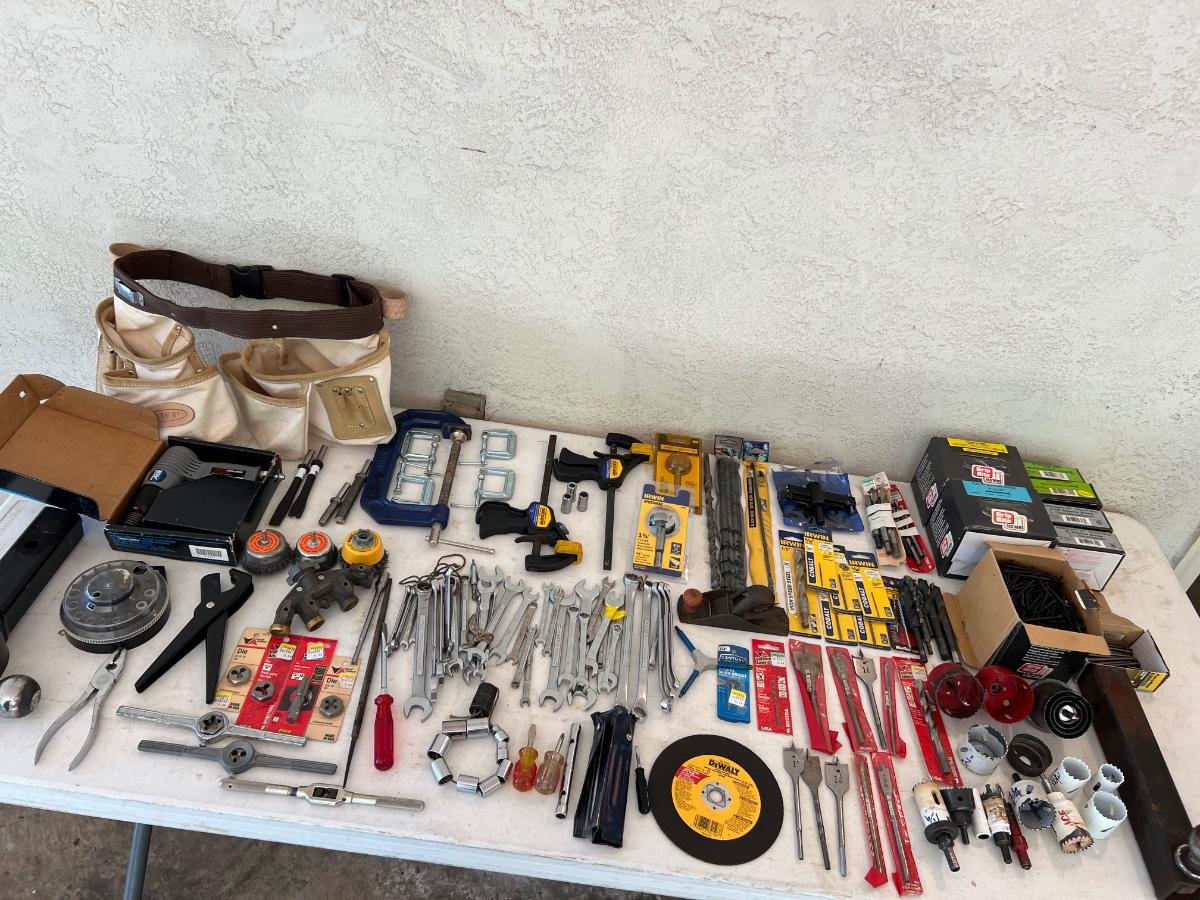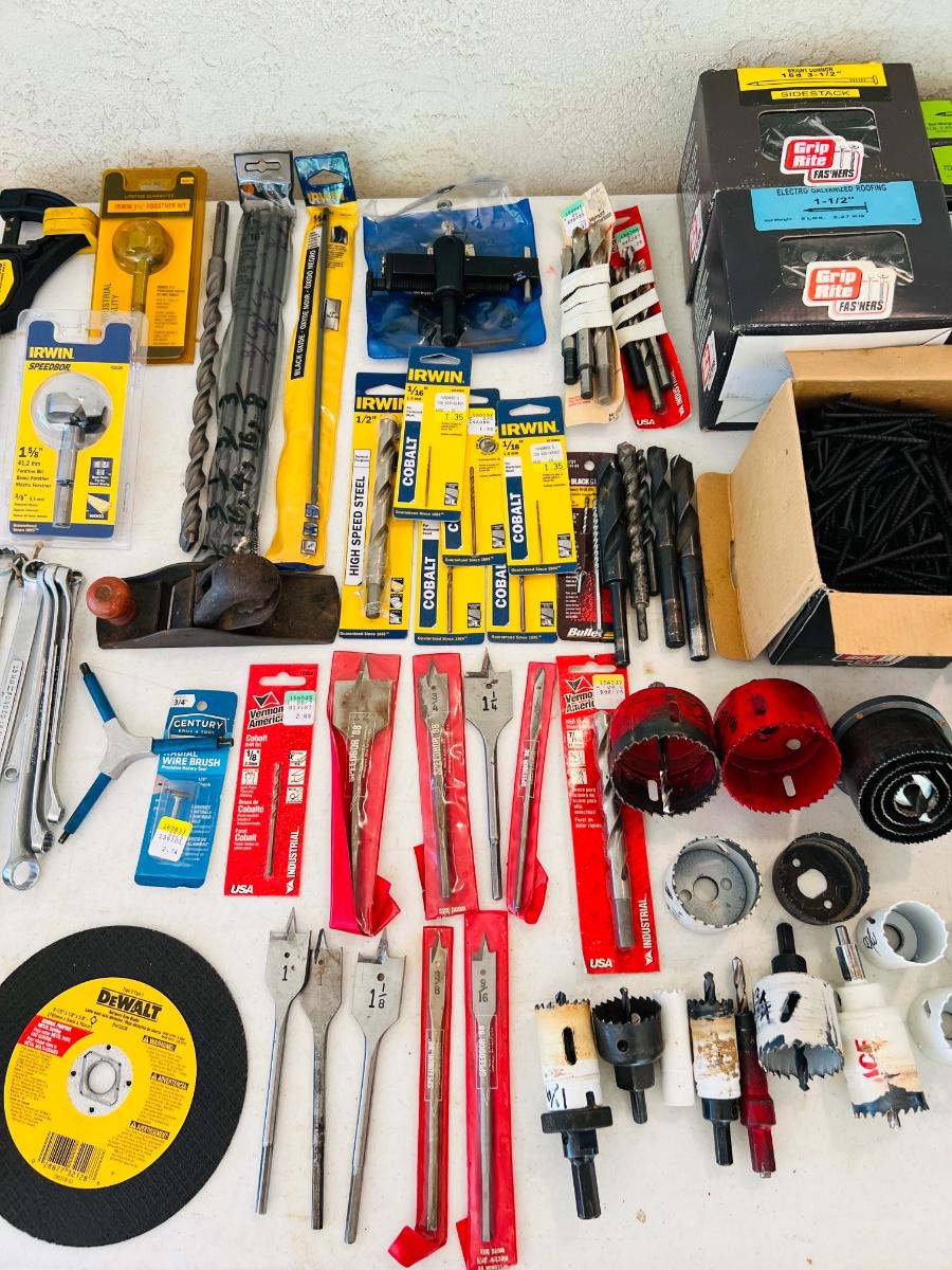 Tool Lot #4. This tool lot includes hitches, various nails/screws (some are new), and so much more. See pictures. Everything is being sold as a lot except the table.