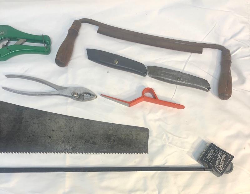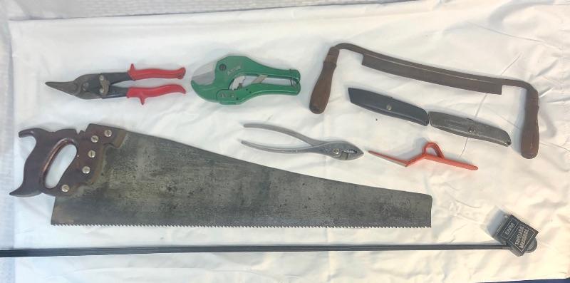 Lot of 9 hand tools: hand saw, 2-handled wood scraper/ shaver, pliers, Alltrade pvc cutter, Wiss left-hand M1 metal snips, 2 retractable Stanley box cutters, Disston abraded, ENM tapeless measure on stick.
