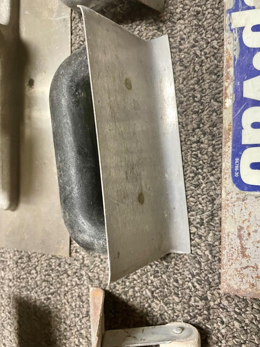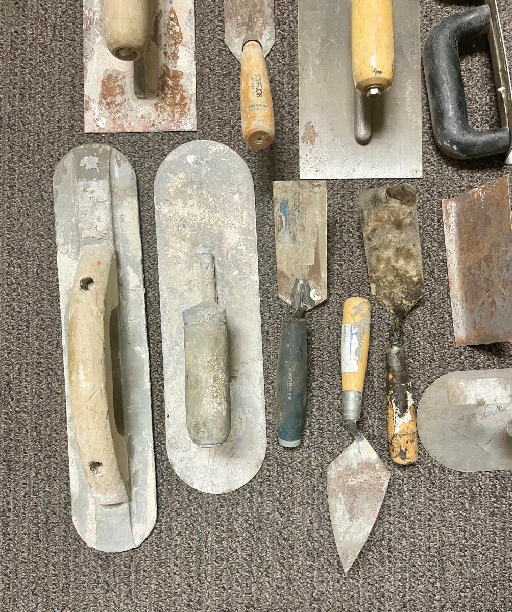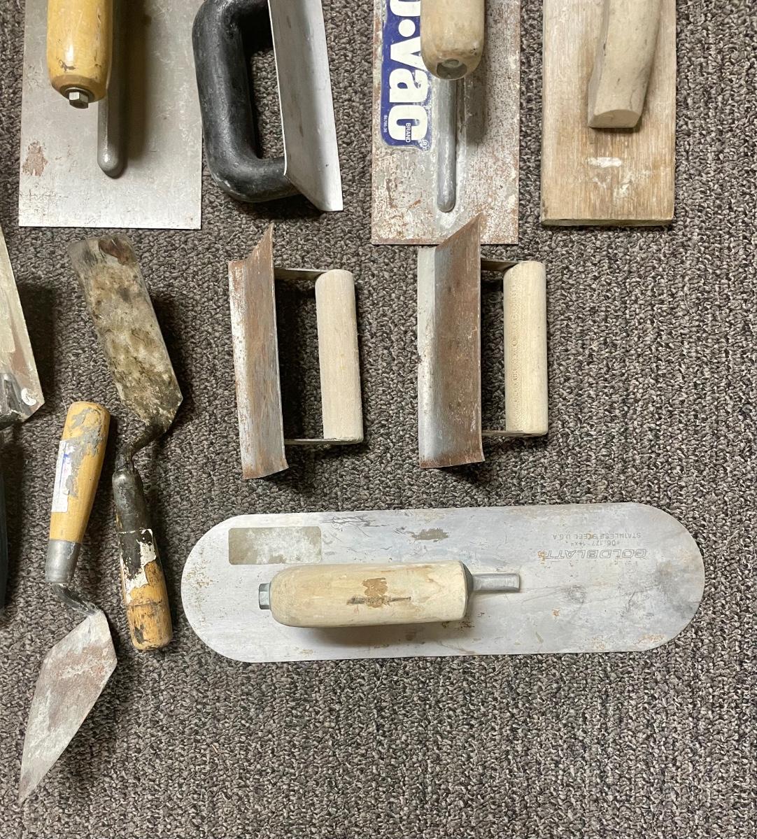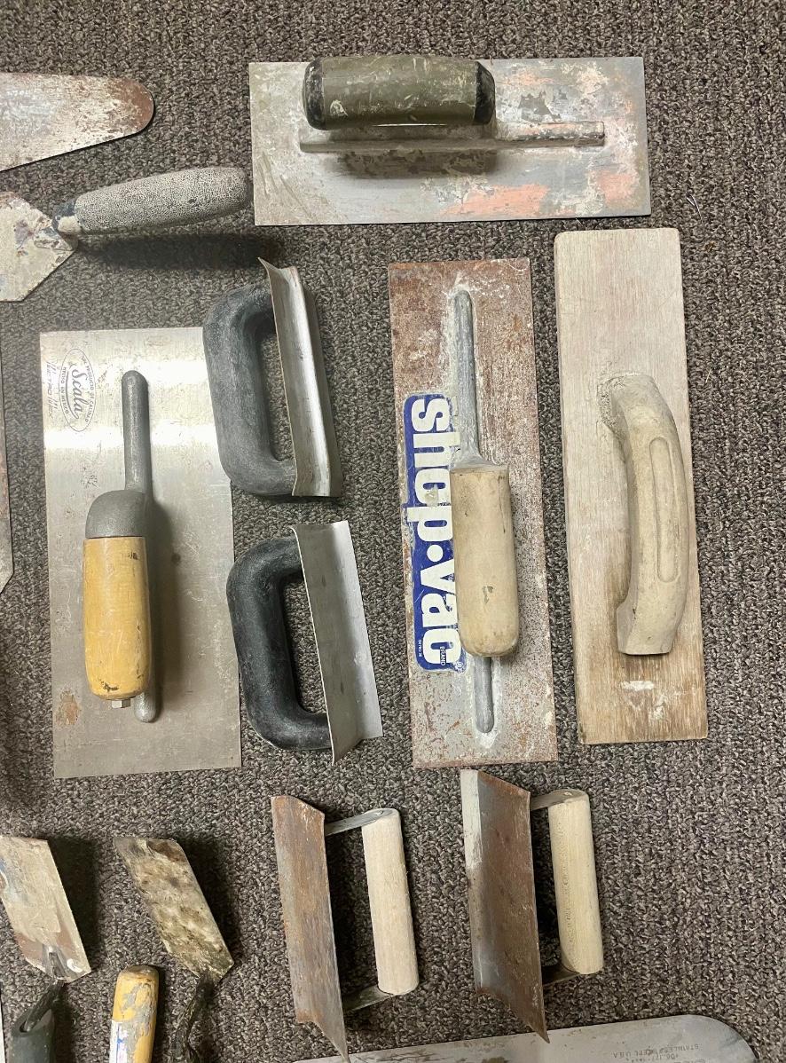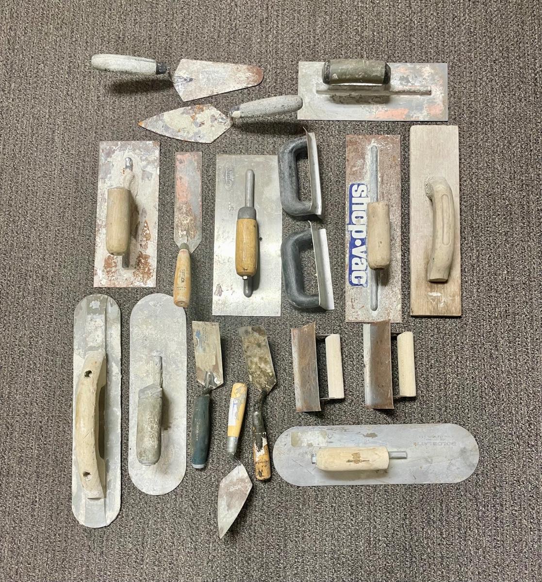 18 items, including triangular pointed masonry trowels, edging trowels, concrete floats, see photos for what's included.