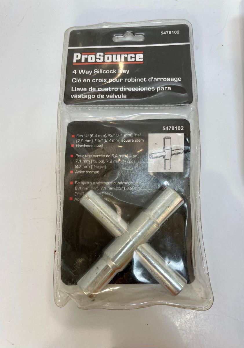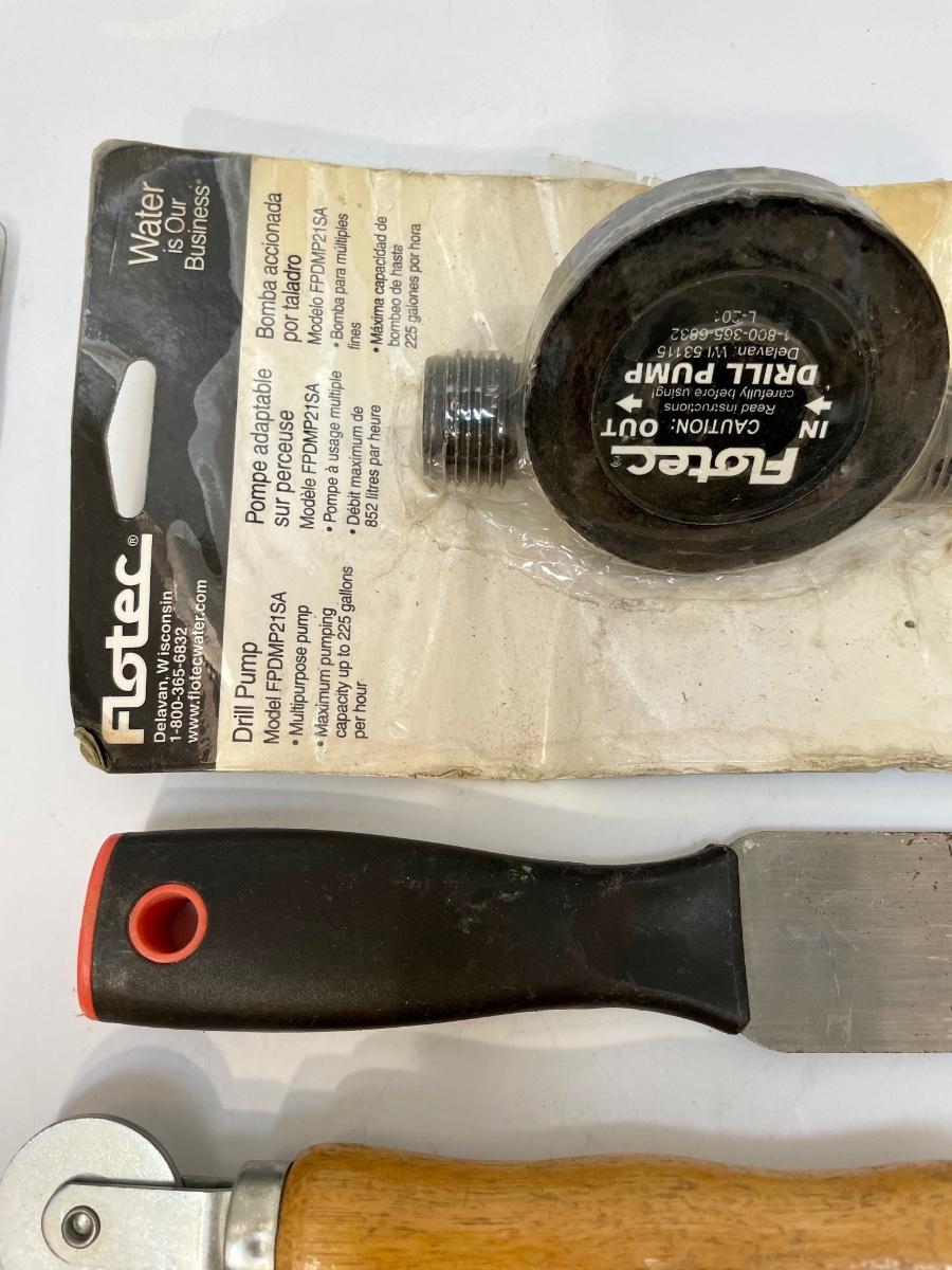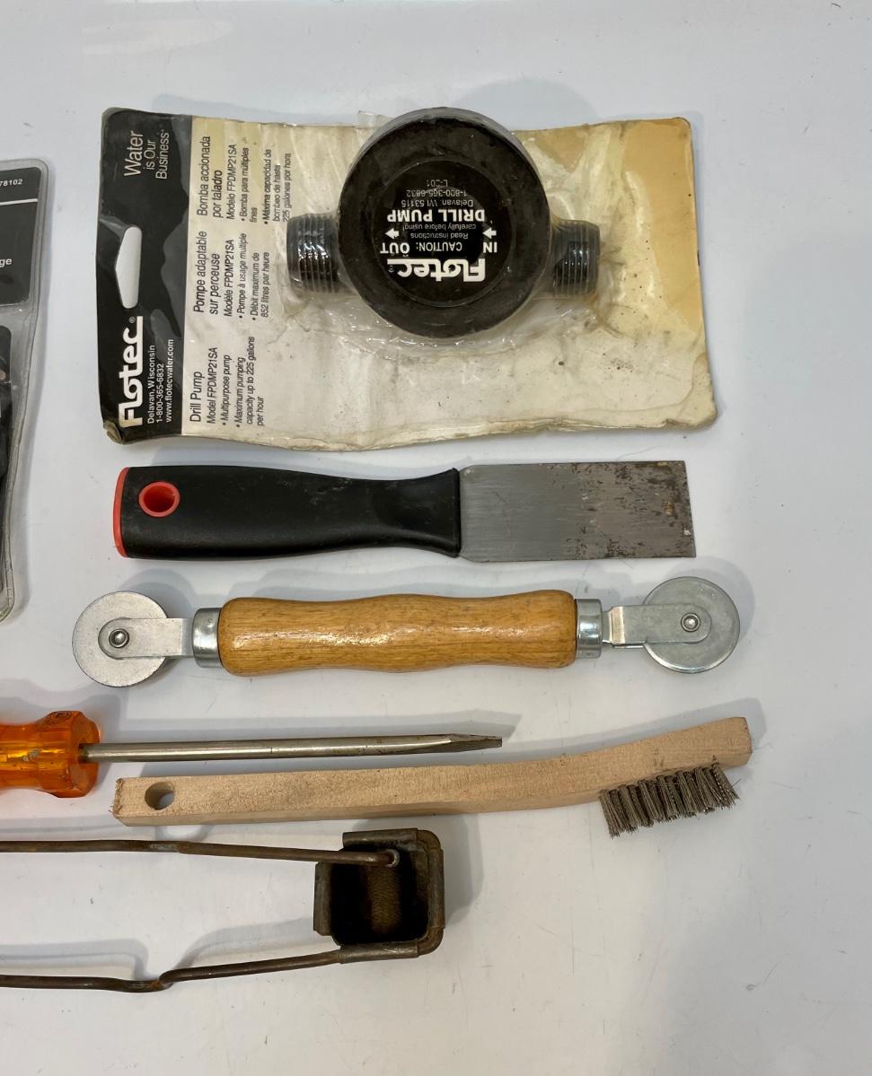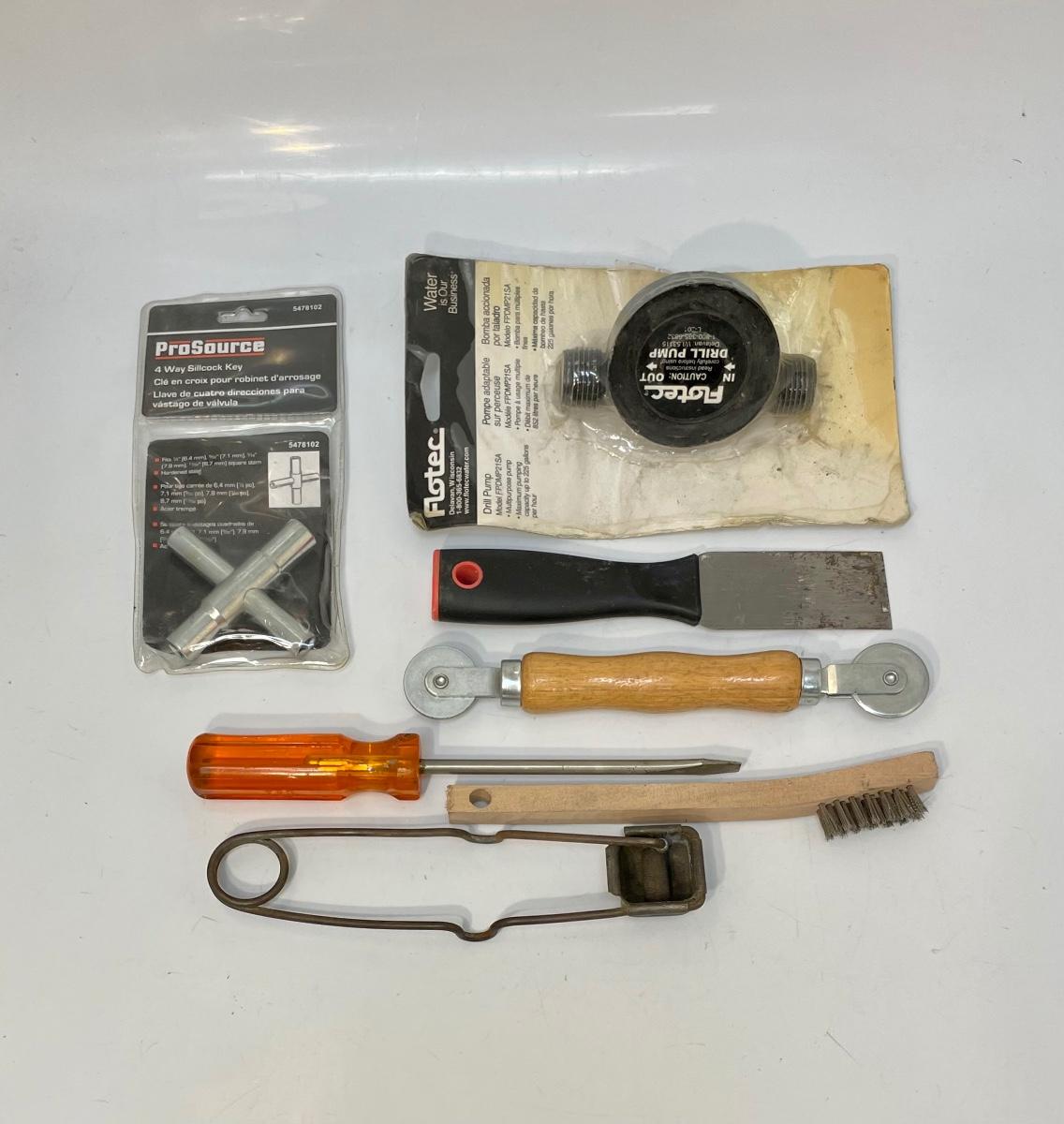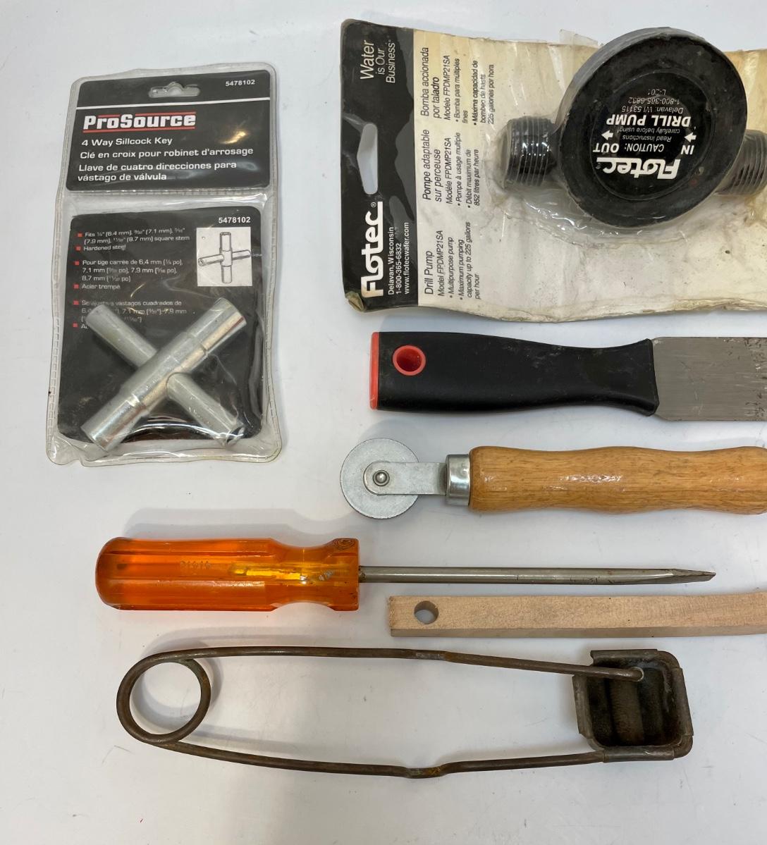 Lot of miscellaneous tools: Plumber’s sillcock key tool, screen repair tool, brazing torch striker, drill driven pump, small wire brush, putty knife, and screwdriver.