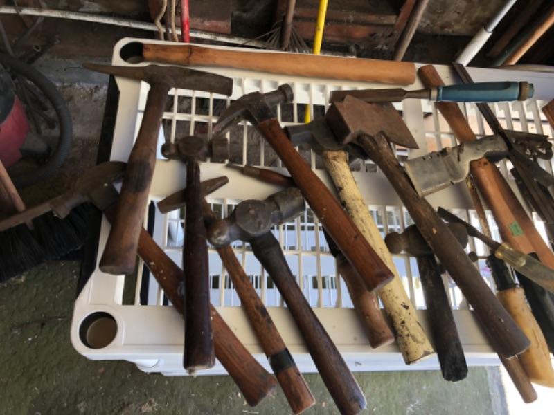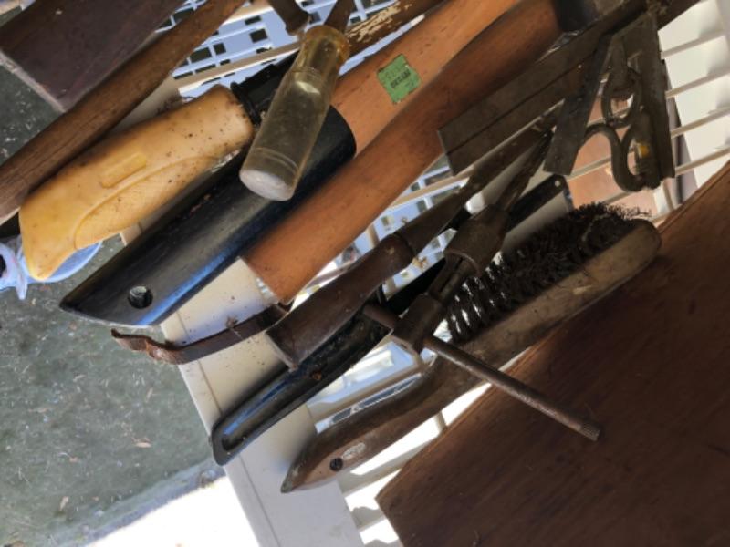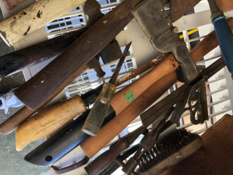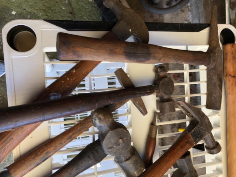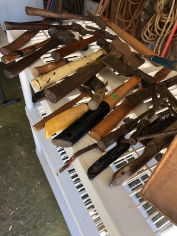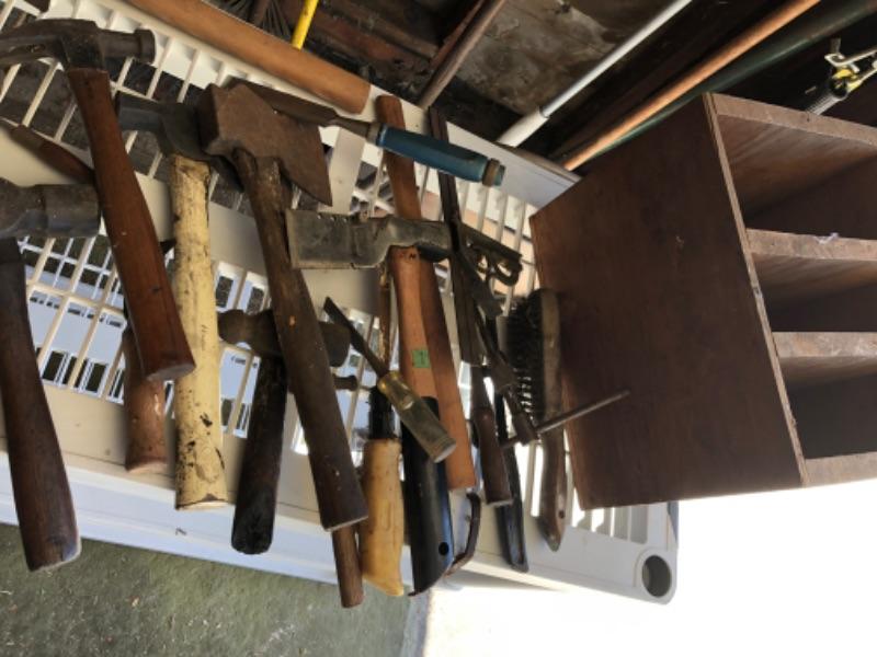 Hammers, chiselers, hatchet, pick, plane together with wood divided box. Tools pictured are what is included.