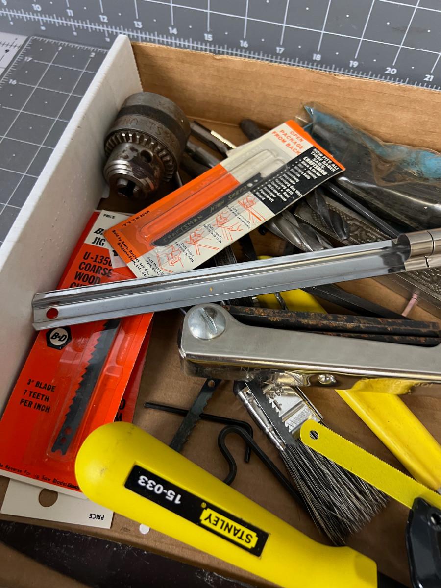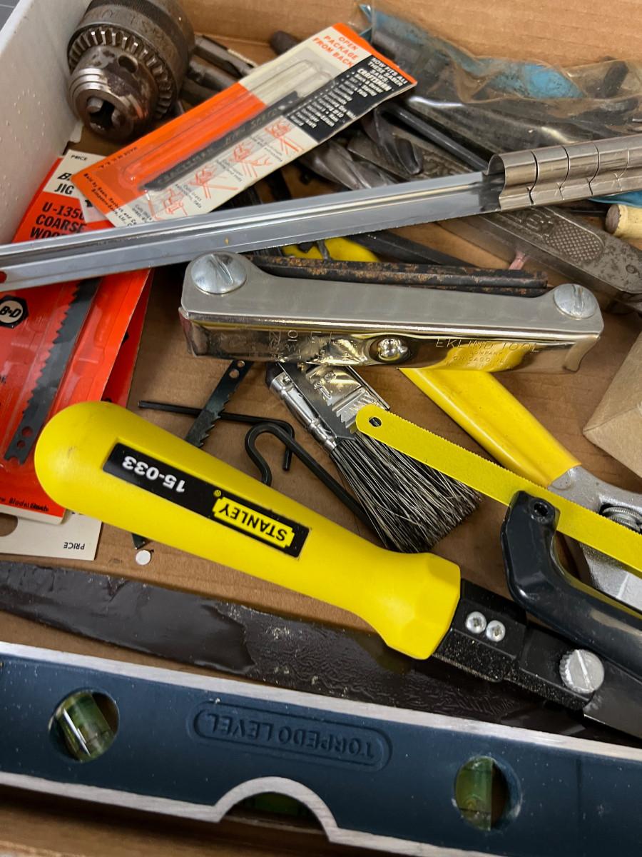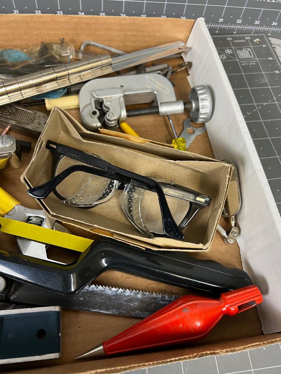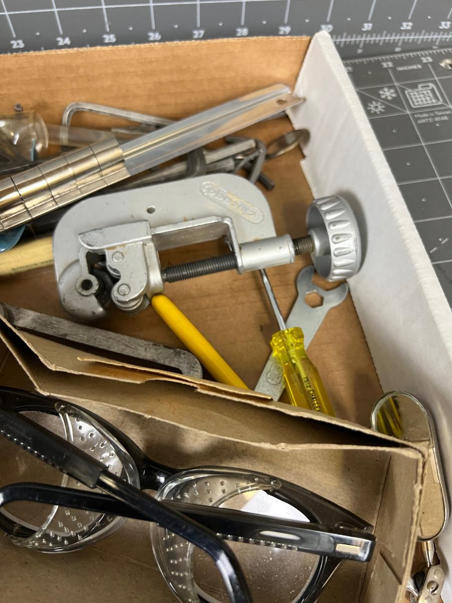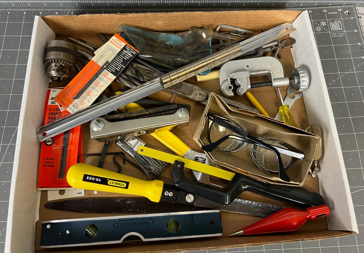 Tool: Tub of Tool; Tube Cutter, Level, Plumb Bob.