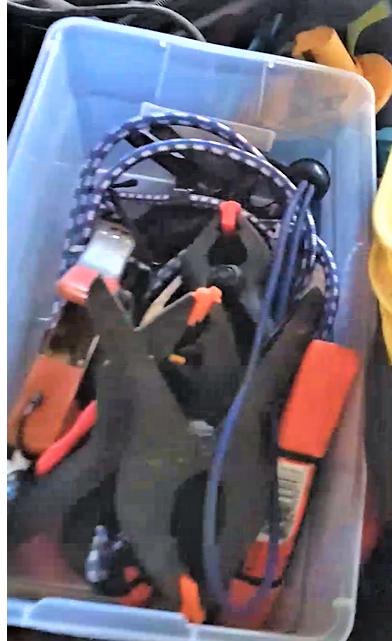 As shown --Toolbag of assorted punches, chisels, crowbars, small bin of clamps, bungees